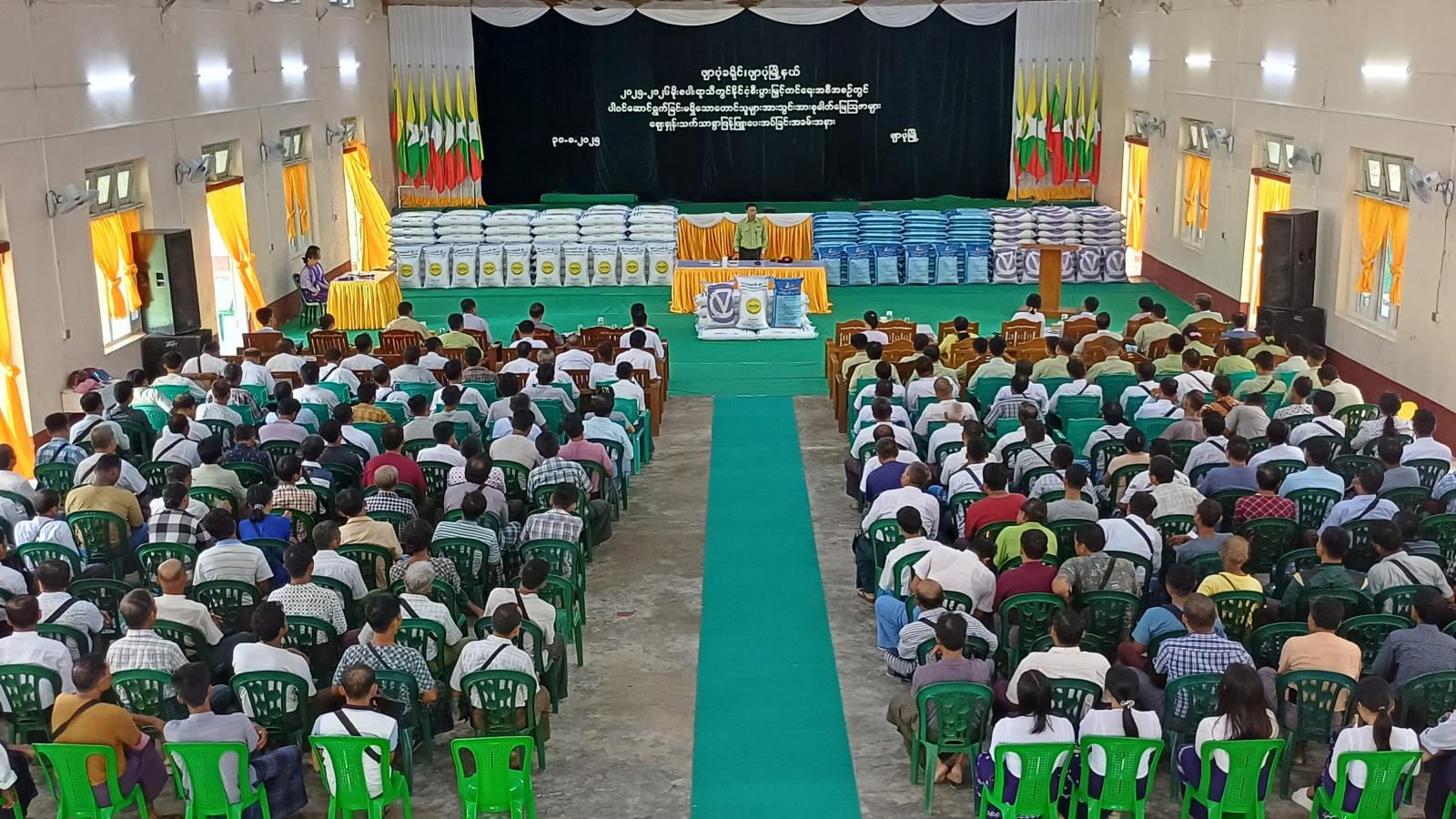 ဧရာဝတီတိုင်းဒေသကြီး၊ ဖျာပုံခရိုင်၊ ဖျာပုံမြို့နယ်အတွင်းရှိ ၂၀၂၅-၂၀၂၆ခုနှစ် မိုးစပါးရာသီ နိုင်ငံ့စီးပွားမြှင့်တင်ရေးရန်ပုံငွေဖြင့် ဆောင်ရွက်ခြင်းမရှိသော မိုးစပါးစိုက်ပျိုးတောင်သူများအား ဈေးနှုန်းသက်သာစွာဖြင့် သွင်းအားစု ဓာတ်မြေဩဇာများ ဖြန့်ဖြူးပေးအပ်ခြင်း အခမ်းအနားကို ယမန်နေ့ နေ့လယ်ပိုင်းက ဖျာပုံမြို့ သီရိအဏ္ဏဝါခန်းမ၌ ကျင်းပပြုလုပ်သည်။