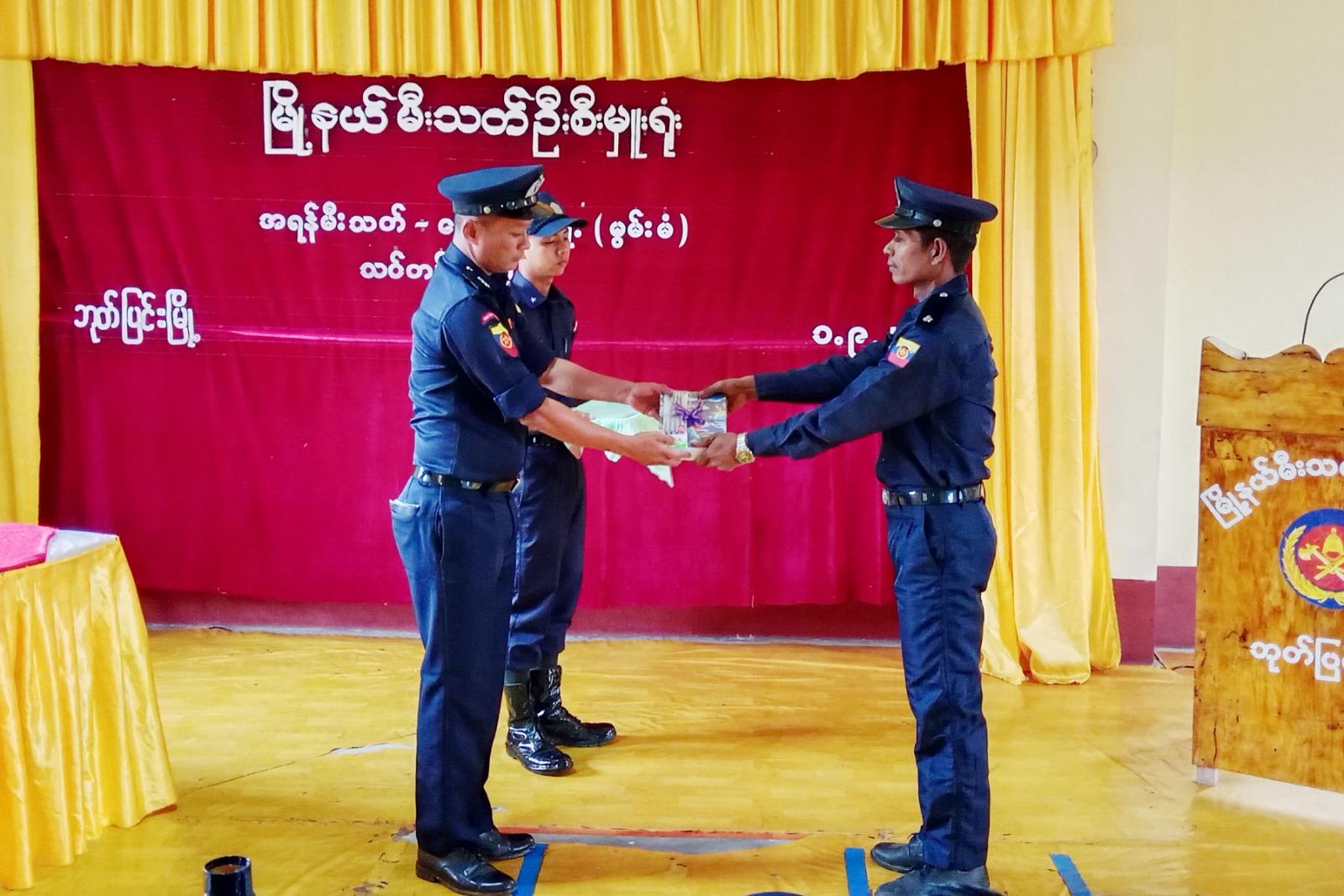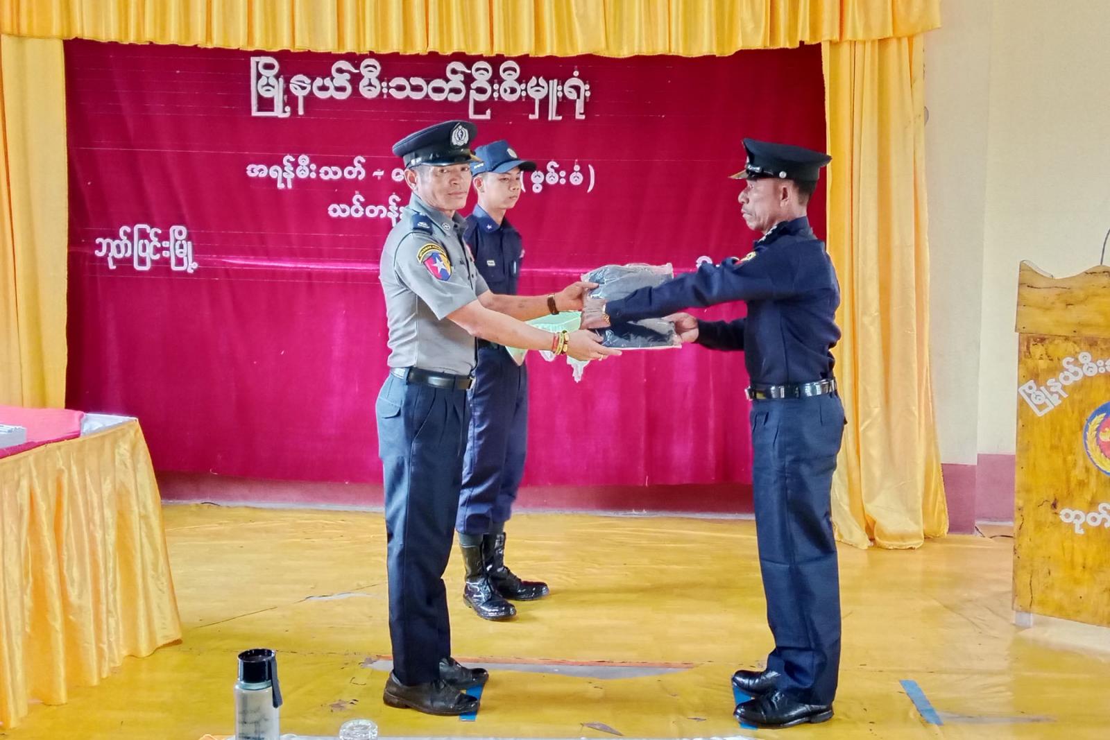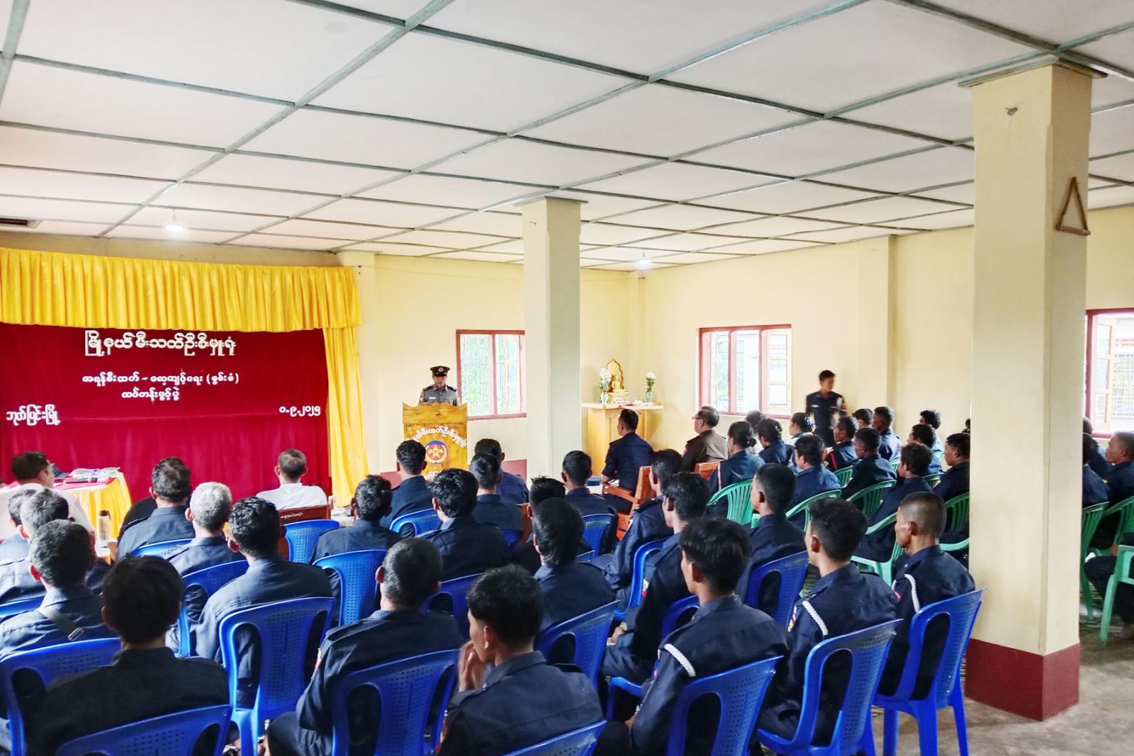 ဦးစွာ မြို့နယ်စီမံခန့်ခွဲရေးနှင့်အုပ်ချုပ်ရေးကော်မတီအတွင်းရေးမှူး မြို့နယ်ရဲတပ်ဖွဲ့မှူး ရဲမှူး စိုးနိုင်ဝင်းက သင်တန်းအဖွင့် အမှာစကားပြောကြားရာတွင် မီးသတ်တပ်ဖွဲ့သည် လွတ်လပ်ရေးကြိုးပမ်းမှုသမိုင်းနှင့်အတူပေါက်ဖွားခဲ့သည့်တပ်ဖွဲ့ဖြစ်၍ ရှေးအစဉ်အလာကောင်းများကိုလည်း ထိန်းသိမ်းကာကွယ်ရင်း မိမိတို့လက်ရှိတာဝန်ဝတ္တရားတွေကို လူမှုရေးစိတ်ဓာတ်အပြည့်အဝနဲ့ ညီနောင်တပ်ဖွဲ့များ၊ အခြားသောဦးစီးဌာနများ၊ အဖွဲ့အစည်းများနှင့်အတူ ပူးပေါင်းပါဝင်ဆောင်ရွက်ကြစေ လိုပါကြောင်း၊ မီးသတ်တပ်ဖွဲ့ဝင်များ၏စွမ်းရည် (၄) ရပ်ဖြစ်သည့် မီးသတ်စွမ်းရည်၊ ရှာဖွေကယ်ဆယ်ရေးစွမ်းရည်၊ အုပ်ချုပ်ရေးစွမ်းရည်၊ စည်းရုံးရေးစွမ်းရည်များကို အစဉ်ထက်မြက်ရေးလေ့ကျင့်ရမှာဖြစ်ပြီး ပြည်သူများ၏အသက် အိုးအိမ်စည်းစိမ်၊ နိုင်ငံတော်၏ကုန်ထုတ်စွမ်းအားတွေကို မီးဘေးအန္တရာယ်၊ သဘာဝဘေးအန္တရာယ်များမှ လွတ်ကင်းအောင် မီးသတ်တပ်ဖွဲ့၏ဆောင်ပုဒ်ဖြစ်သည့် သတိ၊ သစ္စာ၊ သတ္တိနှင့်အညီ သက်စွန့်ဆံဖျား ဆောင်ရွက်သွားစေလိုပါကြောင်း၊ နိုင်ငံတော်အေးချမ်းသာယာရေး၏ အရန်အင်အားအဖြစ် အမျိုးသားရေးတာဝန်တွေကို ကျေကျေပွန်ပွန်ဆက်လက်ထမ်းရွက်စေလိုပါကြောင်း၊ နိုင်ငံတော်ကတည်ဆောက်ပေးလျက်ရှိသည့် ဖွံ့ဖြိုးရေးအခြေခံကောင်းတွေကို မီးဘေးအန္တရာယ်ကြောင့် ပျက်စီးဆုံးရှုံးမှုမရှိအောင် မီးသတိမူရေး၊ မီးဘေးကြိုတင်ကာကွယ်ရေးလုပ်ငန်းများကို အရှိန်အဟုန်ဖြင့် ဆောင်ရွက်ကြရမှာဖြစ်ပြီး စေတနာ၊ ဝါသနာ၊ အနစ်နာ၊ ကရုဏာနှင့်အကြင်နာတည်းဟူသော နာ (၅) နာ ဖြင့် ကာကွယ်စောင့်ရှောက်ရမည်ဖြစ်ကြောင်း၊ ယခုသင်တန်းမှ သင်ကြားပေးသည့် သင်ခန်းစာများကို ပိုမိုကျွမ်းကျင်အောင် ဆက်လက်လေ့ကျင့်ဆောင်ရွက်သွားကြရင်း မီးသတ်သမားတစ်ဦး၏ စိတ်ဓာတ်ဖြင့်တဲ့ မီးမလောင် စေချင်သည့်စိတ်၊ လောင်နေသည့်မီးကို အမြန်ငြှိမ်းစေလို့သည့်စိတ်ကို အစဉ်မွေးမြူကြပြီး လိုက်နာကျင့်သုံးကြရန်ပြောကြားပြီး အရန်မီးသတ်တပ်ဖွဲ့ဝင်များအား စာရေးကိရိယာနှင့် လေ့ကျင့်ရေးတူညီဝတ်စုံများကို တာဝန်ရှိသူများက ပေးအပ်သည်။