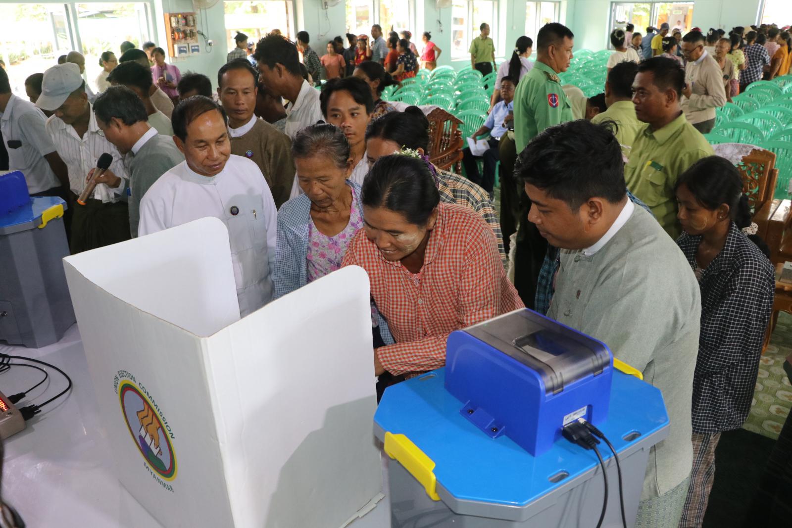 စစ်ကိုင်းတိုင်းဒေသကြီးအစိုးရအဖွဲ့၏လမ်းညွှန်မှုဖြင့် တိုင်းဒေသကြီး ရွေးကော်ပွဲ ကော်မရှင်အဖွဲ့ခွဲရုံးမှ ကျင်းပပြုလုပ်သည့် မုံရွာမြို့နယ်အတွင်းရှိ ကျေးရွာများမှ ဒေသခံ တောင်သူများအား မြန်မာအီလက်ထရောနစ်မဲပေးစက်(MEVM)အကြောင်း ရှင်းလင်းပြ သခြင်းနှင့် လက်တွေ့စမ်းသပ်မဲပေးခြင်း သရုပ်ပြသပွဲကို ယမန်နေ့နံနက်ပိုင်းတွင် မုံရွာမြို့၊ တိုင်းဒေသကြီး စိုက်ပျိုးရေးဦးစီးဌာနရုံးရှိ မြတ်သလ္လာခန်းမတွင် ကျင်းပပြုလုပ်ရာ သရုပ်ပြသပွဲသို့ တိုင်းဒေသကြီးဝန်ကြီးချုပ် ဦးမြတ်ကျော်၊ တိုင်းဒေသကြီးအစိုးရအဖွဲ့ရ အဖွဲ့ဝင်များ၊ တိုင်းဒေသကြီးအဆင့် ဌာနဆိုင်ရာများ၊ မုံရွာခရိုင်/မြို့နယ် စီမံခန့်ခွဲရေးနှင့်အုပ်ချုပ်ရေးကော်မတီဥက္ကဋ္ဌများနှင့် တာဝန်ရှိသူများ၊ မုံရွာမြို့နယ်အတွင်းရှိ ဒေသခံတောင်သူများ တက်ရောက်ကြသည်။