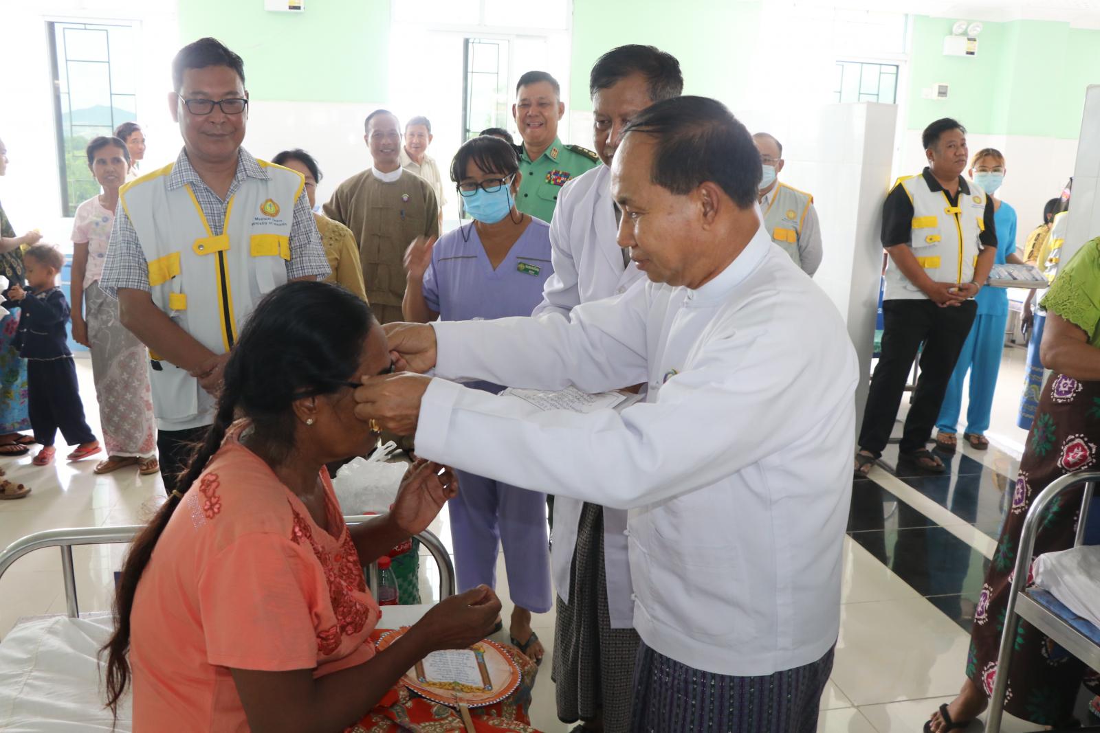 ဦးစွာ တိုင်းဒေသကြီးဝန်ကြီးချုပ်နှင့် တာဝန်ရှိသူများက လာရောက်ပြသကြသည့် မုံရွာမြို့နှင့်အနီးဝန်းကျင်ရှိ ကျေးရွာများမှ ဒေသခံပြည်သူများ၊ အငြိမ်းစားဝန်ထမ်းများ အားရင်းရင်းနှီးနှီး လိုက်လံနှုတ်ဆက်ခဲ့ကြပြီး မျက်စိအထူးကု ဆရာဝန်ကြီးများမှ မျက်စိဝေဒနာရှင်များအား စမ်းသပ်ခွဲစိတ်ကုသပေးနေမှုများအား လိုက်လံကြည့်ရှုခဲ့ကြပြီး မျက်စိခွဲစိတ်ပြီးလူနာများအား နေကာမျက်မှန်များတပ်ဆင်ပေးကာ သောက်ဆေးများအား လိုက် လံပေးအပ်ခဲ့ပြီး မျက်စိဝေဒနာရှင်များနှင့် လူနာစောင့်များအား နေ့ခင်းစာ ထမင်း၊ ဟင်းနှင့် သောက်ရေသန့်ဘူးများအား လိုက်လံပေးအပ်ခဲ့ကြသည်။