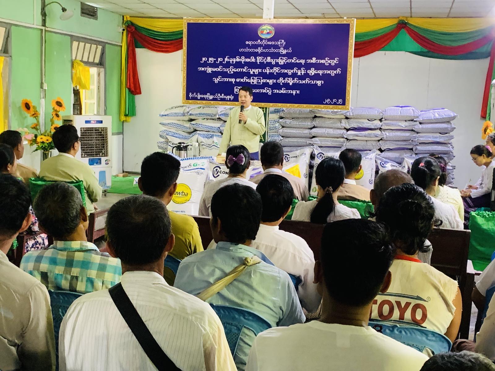 အခမ်းအနားတွင် ဟင်္သာတခရိုင် စိုက်ပျိုးထုတ်လုပ်မှုတိုးတက်မြင့်မားရေး ကြီးကြပ်မှုလုပ်ငန်းအကောင်အထည်ဖော်ရေးကော်မတီဥက္ကဋ္ဌ ဦးလှိုင်ထွန်းက တောင်သူများအနေဖြင့် ပြင်ပပေါက်ဈေးနှုန်းထက် သက်သာသောဈေးနှုန်းဖြင့် ဝယ်ယူနိုင်စေရန် သီးနှံပေါ်ပေးစနစ်ဖြင့် တောင်သူများအဆင်ပြေစေရန်နှင့် ဓာတ်မြေဩဇာများ အသုံးပြုပြီး မိုးစပါးပန်းတိုင် အထွက်နှုန်းတိုးစေရေးအတွက် ဆောင်ရွက်ပေးခြင်းဖြစ်ကြောင်း စသည်ဖြင့် အဖွင့်အမှာစကားတွင် ထည့်သွင်းပြောကြားခဲ့သည်။ ထို့နောက် ဟင်္သာတမြို့နယ်စိုက်ပျိုးရေးဦးစီးဌာနမှူး ဦးစောဝင်းရွှေနှင့် ကျေးလက်ဒေသဖွံ့ဖြိုးတိုးတက်ရေးဦးစီးဌာနမှူး ဒေါ်ဆွေဆွေဝင်းတို့က ဟင်္သာတမြို့နယ်အရောက် စျေးနှုန်းသက်သာစွာ သီးနှံပေါ်ပေးစနစ်ဖြင့် ဖြန့်ဖြူးပေးလျက်ရှိပါကြောင်း၊ ယူရီးယားဓာတ်မြေသြဇာ တစ်မျိုးတည်းသုံးစွဲပါက နိုက်ထရိုဂျင်လေလွင့်ဆုံးရူံးမူ ပမာဏများပြားနိုင်သဖြင့် မဖြစ်မနေသဘာဝမြေသြဇာသုံးဆနှင့် ရောစပ်အသုံးပြုရန်၊ ကွန်ပေါင်းမြေသြဇာအား မြေခံအဖြစ်အဖြစ် ထည့်သွင်းအသုံးပြုပါက ပိုမိုအကျိုးဖြစ်မည်ဖြစ်ကြောင်းတို့ကို ရှင်းလင်းပြောကြားခဲ့ပြီး ဟင်္သာတခရိုင် စိုက်ပျိုးထုတ်လုပ်မှုတိုးတက်မြင့်မားရေးကြီးကြပ်မှုလုပ်ငန်းအကောင်အထည်ဖော်ရေးကော်မတီဥက္ကဋ္ဌ ဦးလှိုင်ထွန်းနှင့် တာဝန်ရှိသူများက ဟင်္သာတမြို့နယ်အတွင်းရှိ ကျေးရွာအုပ်စု(၃၄)အုပ်စုတို့မှ တောင်သူများအတွက် ဖြိုးမောက်ယူရီးယားဓာတ်မြေဩဇာ(၁၅၁၈)အိတ်နှင့် ဩဘာယူရီးယားမြေဩဇာ (၂၁၅၅)အိတ်၊ ဩဘာကွန်ပေါင်းဓာတ်မြေသြဇာ(၁၄၂၂)အိတ် စုစုပေါင်း (၅၀၉၅) အိတ်တို့ကို အသီးသီးပေးအပ်ခဲ့ကြသည်။