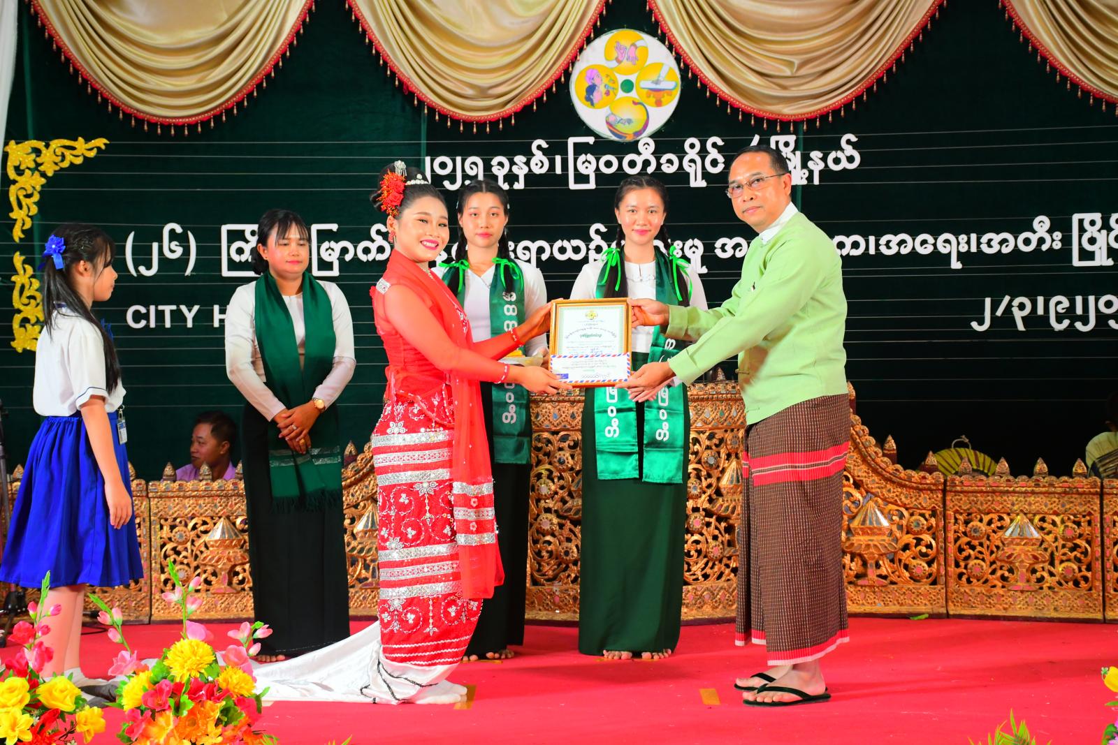 ထို့နောက် ခရိုင်စီမံခန့်ခွဲရေးနှင့် အုပ်ချုပ်ရေးကော်မတီဥက္ကဋ္ဌ ဦးကောင်းစံလင်း၊ ခရိုင်စီမံအဖွဲ့ဝင်(၂) ဦးစိန်သောင်းနှင့် ပြိုင်ပွဲကျင်းပရေး ဦးစီးကော်မတီ ဥက္ကဋ္ဌ ဦးဇော်မော်အောင်၊ မြို့နယ်စည်ပင် သာယာရေးအဖွဲ့ အမှုဆောင်အရာရှိ ဒုတိယညွှန်ကြားရေးမှူး ဦးကျော်ကျော်ဦး၊ ခရိုင်/မြို့နယ်အဆင့် ဌာနဆိုင်ရာတာဝန်ရှိသူများ၊ အမျိုးသမီးရေးရာအဖွဲ့နှင့် မိခင်နှင့်ကလေး စောင့်ရှောက်ရေးအသင်းမှ တာဝန်ရှိသူများက ဆုရရှိကြသည့် ပြိုင်ပွဲဝင်များအား ဆုများချီးမြှင့်ကြပြီး ပွဲတော်ဖြစ်မြောက်ရေး ပူးပေါင်းဆောင်ရွက်ခဲ့ကြသည့် တာဝန်ရှိသူများအား ဂုဏ်ပြု မှတ်တမ်းလွှာများ ပေးအပ်သည်။