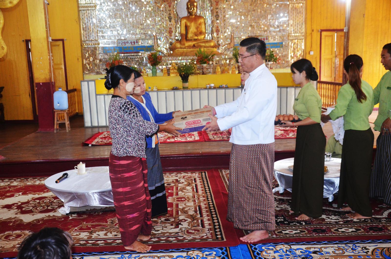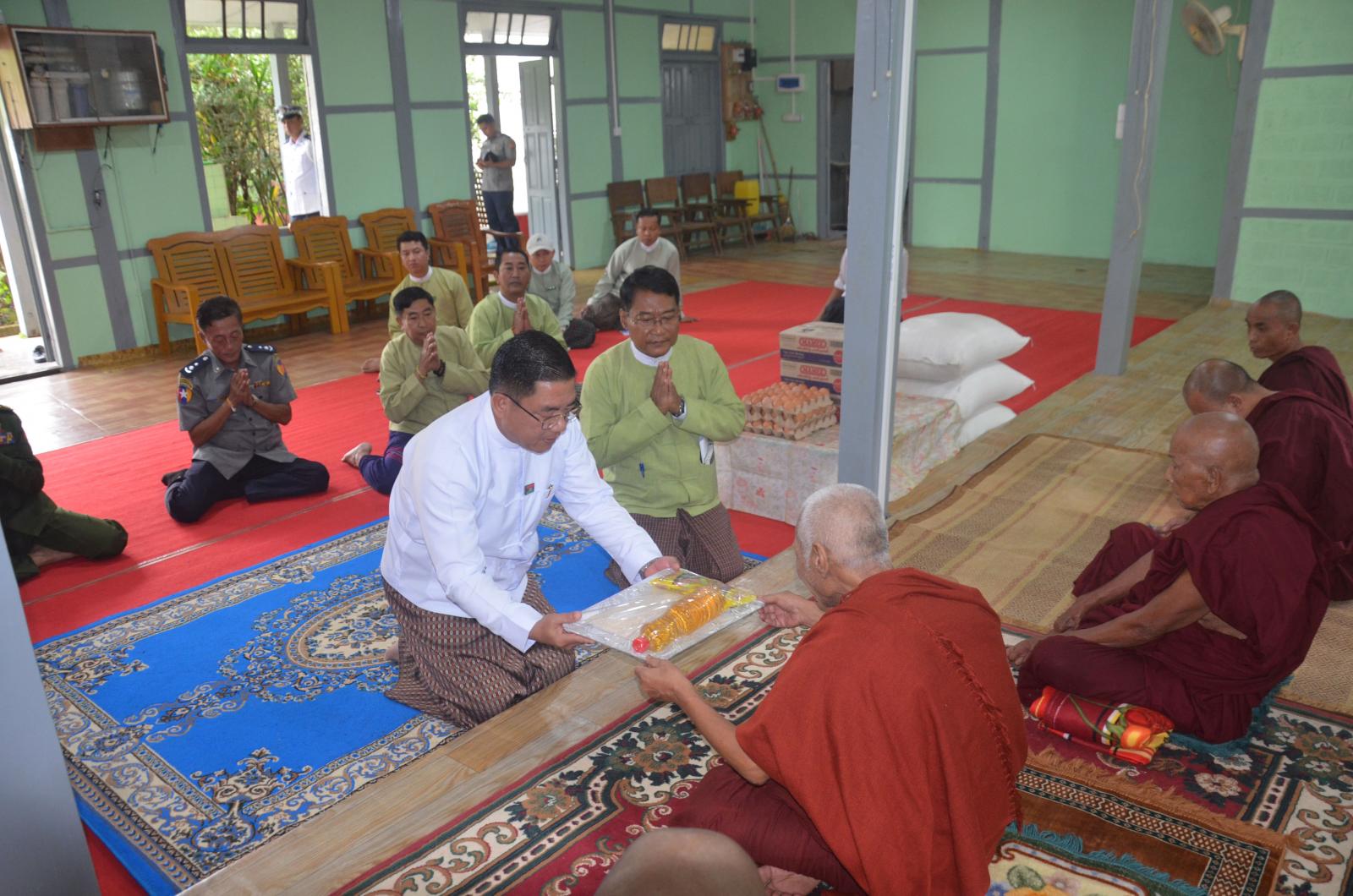 ဦးစွာ ပြည်နယ်ဝန်ကြီးချုပ်နှင့် တာဝန်ရှိသူများသည် လွိုင်ကော်မြို့ ဈေးပိုင်းရပ်ကွက်၊ ဥတ္တရာရုံဘုန်းတော်ကြီးကျောင်းသို့ ရောက်ရှိပြီး ကျောင်းထိုင်ဆရာတော်အား ဖူးမြော်ကြည်ညို၍ ဆွမ်းဆန်တော်၊ ဆီနှင့် လှူဖွယ်ပစ္စည်းများ ဆက်ကပ်လှူဒါန်းသည်။ ထို့နောက် ကျောင်းတိုက်အတွင်း ဖွင့်လှစ်ထားသည့် ယာယီရေဘေးကယ်ဆယ်ရေးစခန်းတွင် ဘီလူးချောင်းရေမြင့်တက်နေမှုကြောင့် ယာယီရွှေ့ပြောင်းနေထိုင်လျက်ရှိသည့် မင်းစုရပ်ကွက်ရေဝင်ရောက်နေအိမ်များမှ ပြည်သူများနှင့် ဒီးမော့ဆိုမြို့နယ်ကျေးရွာများမှ ယာယီနေရပ်စွန့်ခွာ ပြည်သူများနှင့် တွေ့ဆုံသည်။ ပြည်နယ်ဝန်ကြီးချုပ်က ပြည်နယ်အစိုးရအဖွဲ့အနေဖြင့် သဘာဝဘေးအန္တရာယ်များ ကြုံတွေ့လာပါက ပြည်သူများအတွက် လိုအပ်သည်များ ကူညီပေးနိုင်ရန် ကြိုတင်စီမံထားရှိပါကြောင်း၊ ရေဘေးသင့်ပြည်သူများ လတ်တလောနေထိုင်စားသောက်မှု အဆင်ပြေစေရေး အခြေခံစားသောက်ကုန်များကို ပေးအပ်သွားမည်ဖြစ်ကြောင်း၊ တိုက်ပွဲရှောင်ပြည်သူများ မိမိတို့ဒေသတွင် ပြန်လည်အခြေချနေထိုင်နိုင်ရန် လိုအပ်သည့် လုံခြုံရေး၊ လျှပ်စစ်မီးနှင့် သောက်သုံးရေရရှိရေး၊ လမ်းပန်းဆက်သွယ်ရေးတို့ကို ဆောင်ရွက်ပေးလျက်ရှိပါကြောင်း၊ ဒီးမော့ဆိုမြို့နယ် ယခုထက်တည်ငြိမ်အေးချမ်းလာပါက စိုက်ပျိုးရေး၊ မွေးမြူရေး၊ မူလအသက်မွေးဝမ်းကျောင်းလုပ်ငန်းများ ပြန်လည်လုပ်ကိုင်နိုင်ရေးလိုအပ်သည်များ ကူညီဆောင်ရွက်ပေးသွားမည်ဖြစ်ကြောင်း စသည်ဖြင့် ပြောကြားခဲ့သည်။ ယင်းနောက် တက်ရောက်လာကြသူများက ဖြည့်ဆည်းပေးရန်များကို အသီးသီးတင်ပြကြရာ ပြည်နယ်ဝန်ကြီးချုပ်က ဖြည့်ဆည်းဆောင်ရွက်ပေးသွားမည့် အခြေအနေများအား ပြောကြားခဲ့ပြီး သက်ဆိုင်ရာဌာနများနှင့် လိုအပ်သည်များ ပေါင်းစပ်ညှိနှိုင်းပေးခဲ့သည်။ ထို့နောက် ပြည်နယ်ဝန်ကြီးချုပ်က ရေဘေးသင့်ပြည်သူများ၊ ယာယီနေရပ်စွန့်ခွာပြည်သူများသို့ ဆန်၊ ဆီ၊ ခေါက်ဆွဲ ခြောက်၊ ကြက်ဥများနှင့် ဘေးအန္တရာယ်ဆိုင်ရာစီမံခန့်ခွဲမှုဦးစီးဌာနမှ ပြည်သူ ၄၁ ဦးအတွက် တစ်ပတ်စာဆန်ဖိုးငွေများကို ပေးအပ်သည်။ ဆက်လက်၍ လုံခြုံရေးနှင့်နယ်စပ်ရေးရာဝန်ကြီးနှင့် တာဝန်ရှိသူများက ဆန်၊ ဆီ၊ ခေါက်ဆွဲခြောက်နှင့် ကြက်ဥများ အသီးသီးပေးအပ်ကြသည်။