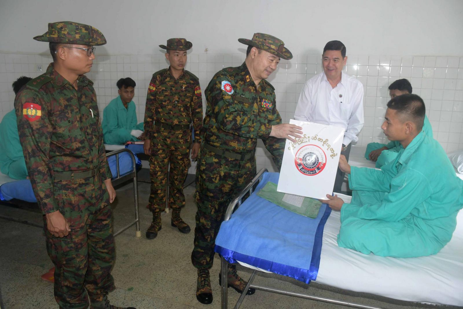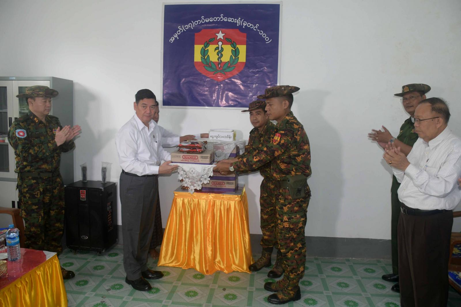 ဦးစွာ ရခိုင်ပြည်နယ်ဝန်ကြီးချုပ် ဦးထိန်လင်း၊ တိုင်းမှူးနှင့် တာဝန်ရှိသူများသည် ခုတင် (၁၀၀)မှ အထူးကုဆရာဝန်ကြီးများနှင့် ဆရာဝန်၊ သူနာပြုများအားရင်းရင်းနှီးနှီး တွေ့ဆုံနှုတ် ဆက်ကြသည်။ ဆက်လက်၍ ဆေးရုံတက်ရောက် ကျန်းမာရေးစောင့်ရှောက်မှုခံယူနေကြသော တပ်မတော်သားများနှင့် မိသားစုဝင်များ၊ ပြည်သူများအား ဆေးဝါးကုသပေးထားမှုနှင့် ကျန်းမာရေးတိုးတက်ကောင်းမွန်မှု အခြေအနေများကို မေးမြန်းအားပေးစကားပြောကြားပြီး ရခိုင်ပြည်နယ်အစိုးရအဖွဲ့နှင့်တပ်မတော်မှ ပေးအပ်ချီးမြှင့်သည့် စားသောက်ဖွယ်ရာများကို ပေးအပ်သည်။