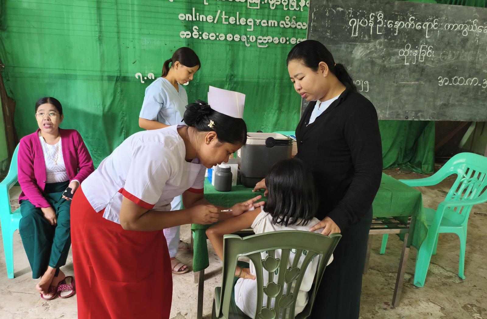 ကာကွယ်ဆေးထိုးနှံပေးခြင်းလုပ်ငန်းများဆောင်ရွက်ရာတွင် ရှေးဦးစွာ ပြည်သူ့ကျန်းမာရေးဦးစီးဌာနမှ ကျန်းမာရေးမှူးဒါ်လှမြတ်မင်းက ဂျပန်ဦးနှောက်ရောဂါအကြောင်း သိကောင်းစရာများကို အသိပညာပေး ဟောပြောခဲ့ပြီး ကျန်းမာရေးဌာနမှ ဆရာမများက အသက် ၁၁ နှစ်မှ အသက် ၁၄ နှစ်အထိ ကျောင်းသား၊ ကျောင်းသူများကို ကာကွယ်ဆေးများ ထိုးနှံပေးခဲ့ပြီး အမာမြို့၊ အ.ထ.ကကျောင်းမှ ကျောင်းသား၊ ကျောင်းသူ (၁၅၆) ဦး၊ အောင်ကုန်းကျေးရွာ၊ အ.မ.ကကျောင်းမှ (၁၉)ဦး၊ လေးပင်ချောင်ကျေးရွာ၊ အ.မ.ကကျောင်းမှ (၁၄)ဦး စုစုပေါင်း (၁၈၉)ဦးတို့ကို ထိုးနှံပေးခဲ့ကြောင်း သိရသည်။