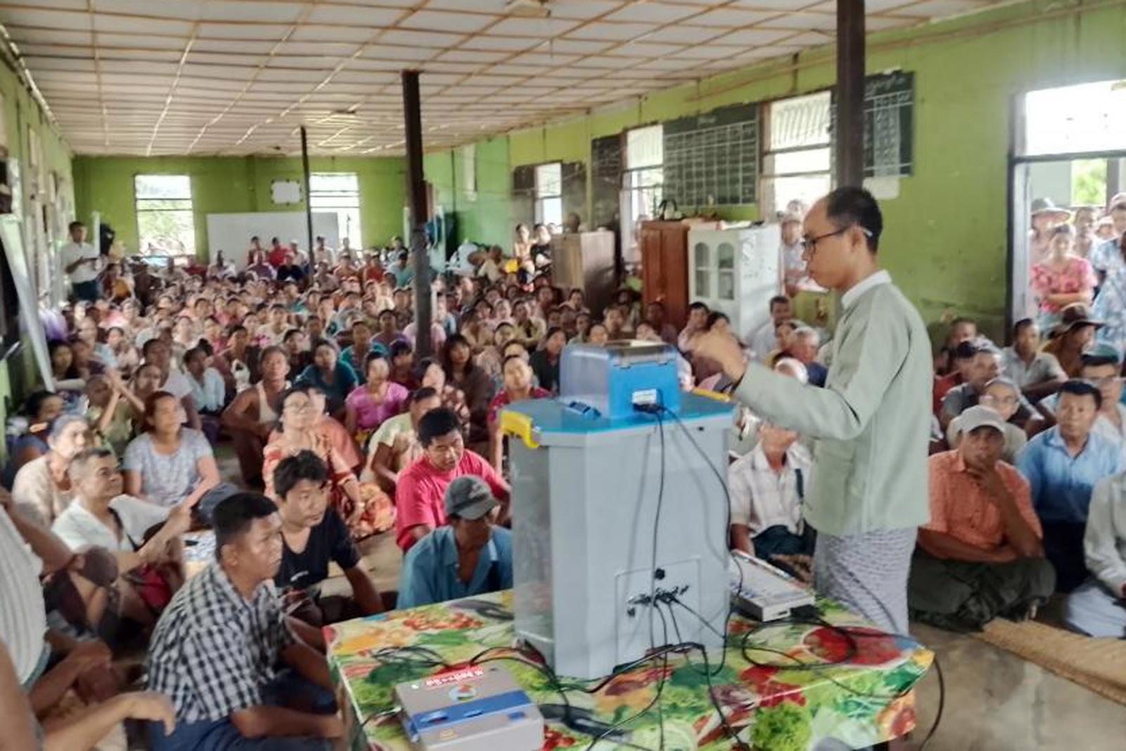 ထို့နောက်တက်ရောက်လာသည့် ကျေးရွာနေပြည်သူ (၃၂၀) ဦးခန့်အား မြန်မာအီလက်ထရောနစ်မဲပေးစက်ဆိုင်ရာများ လက်တွေ့အသိပညာပေးပြသပြီး လက်တွေ့စမ်းသပ်မဲပေးခြင်းများ ဆောင်ရွက်ခဲ့ကြကြောင်း သိရသည်။