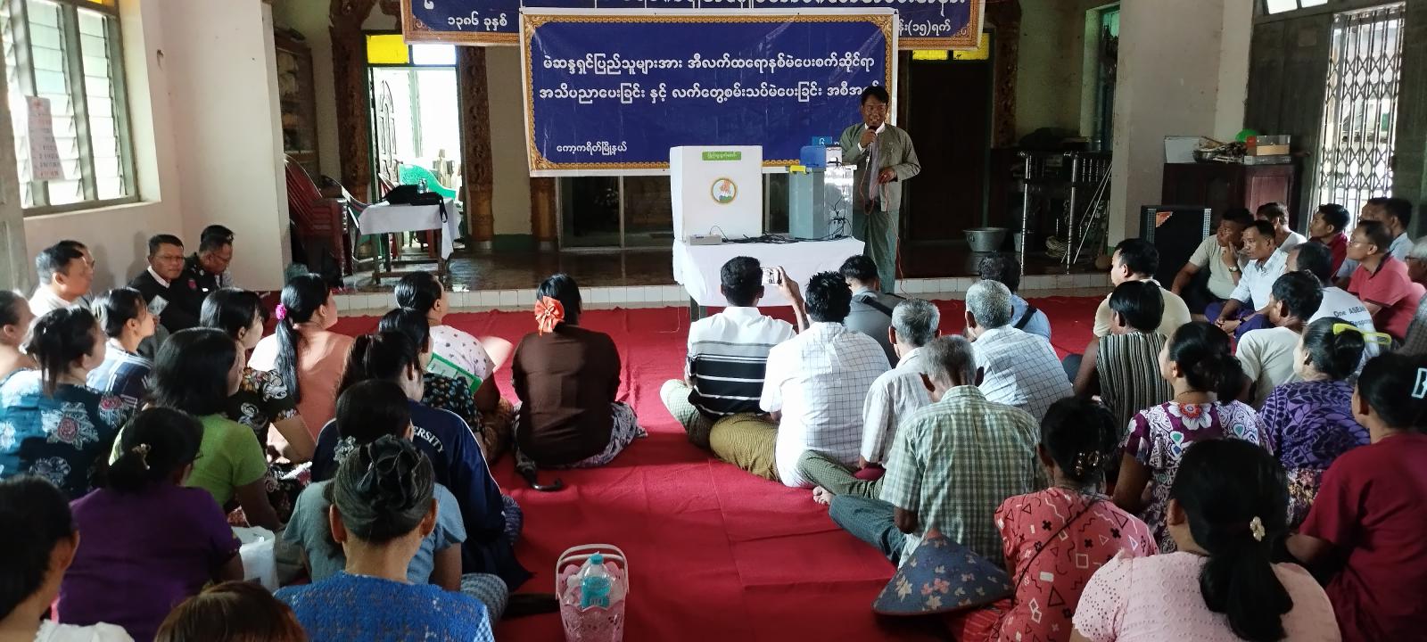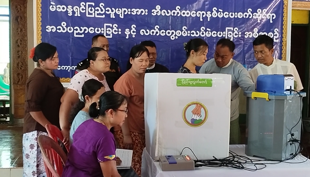 မြန်မာအီလက်ထရောနစ်မဲပေးစက်ဆိုင်ရာအသိပညာပေးခြင်းနှင့် လက်တွေ့စမ်းသပ်မဲပေးခြင်းအခမ်းအနားကို ယမန်နေ့နံနက် ၉:၃၀ နာရီက ကျုံဒိုးမြို့၊ အ မှတ်(၂)ရပ်ကွက်၊ အေးစေတီဘုရား ဓမ္မာရုံ၌ ပြုလုပ်ကျင်းပခဲ့သည်။