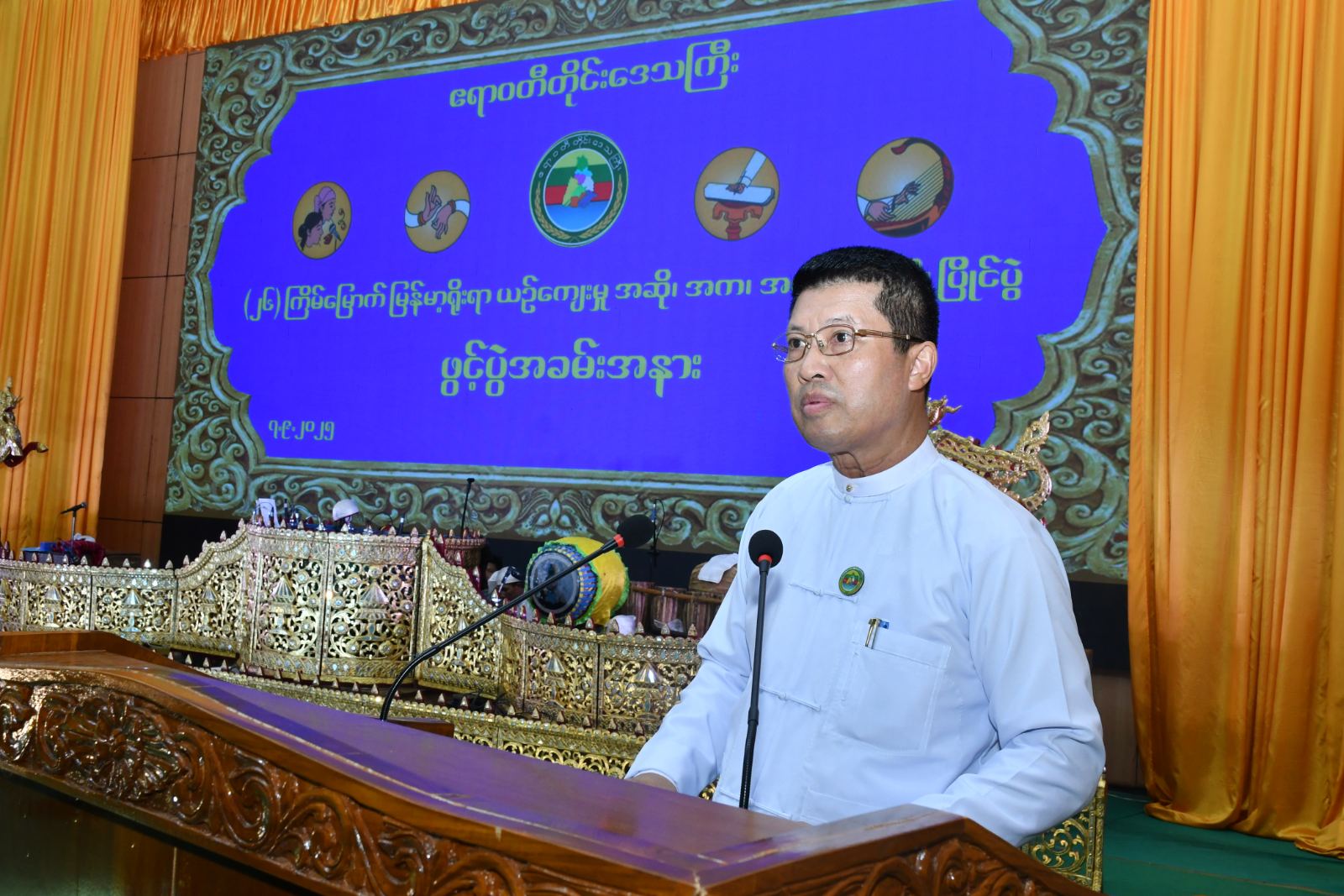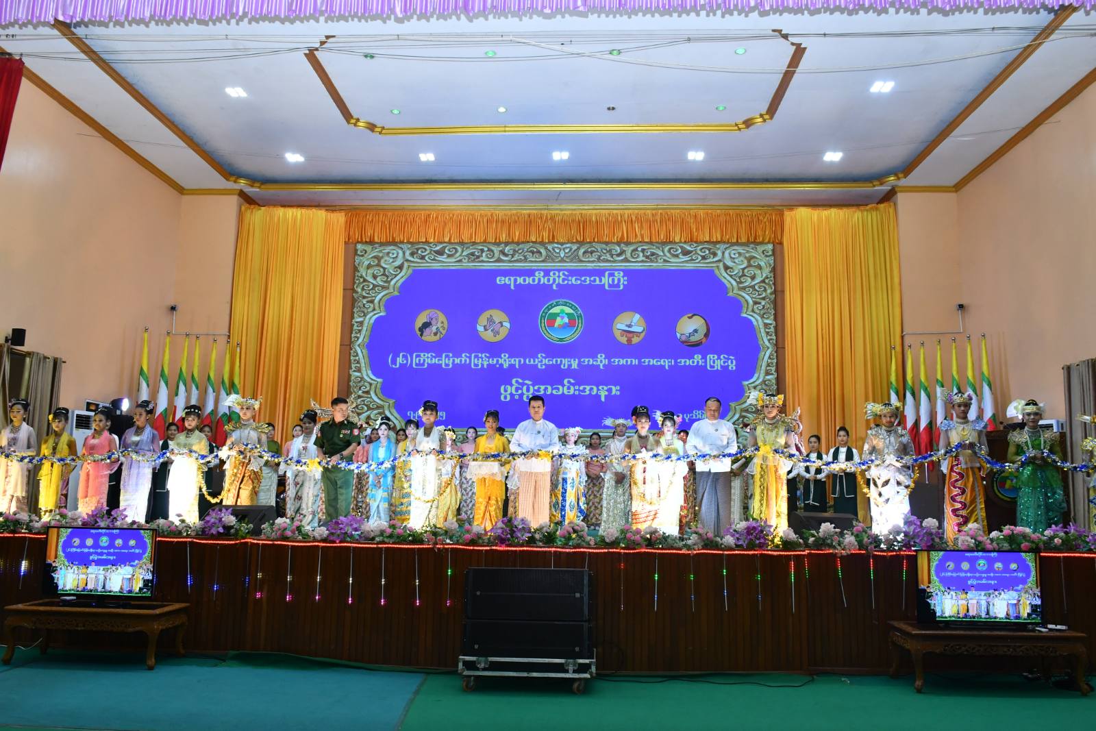 ဧရာဝတီတိုင်းဒေသကြီး၏ (၂၆) ကြိမ်မြောက် မြန်မာ့ရိုးရာယဉ်ကျေးမှု အဆို၊ အက၊ အရေး၊ အတီးပြိုင်ပွဲ ဖွင့်ပွဲအခမ်းအနားကို ယမန်နေ့မွန်းလွဲပိုင်းက ပုသိမ်မြို့၊ မြို့တော်ခန်းမ၌ ပြုလုပ်ရာ တိုင်းဒေသကြီး ဝန်ကြီးချုပ်ဦးတင်မောင်ဝင်းနှင့်ဇနီး၊ အစိုးရအဖွဲ့ဝင်ဝန်ကြီးများနှင့် ၎င်းတို့၏ ဇနီးများ၊ ဌာနဆိုင်ရာများ၊ ပြိုင်ပွဲအကဲဖြတ်ပညာရှင်များနှင့် ပြိုင်ပွဲဝင်များတက်ရောက်ခဲ့ကြသည်။