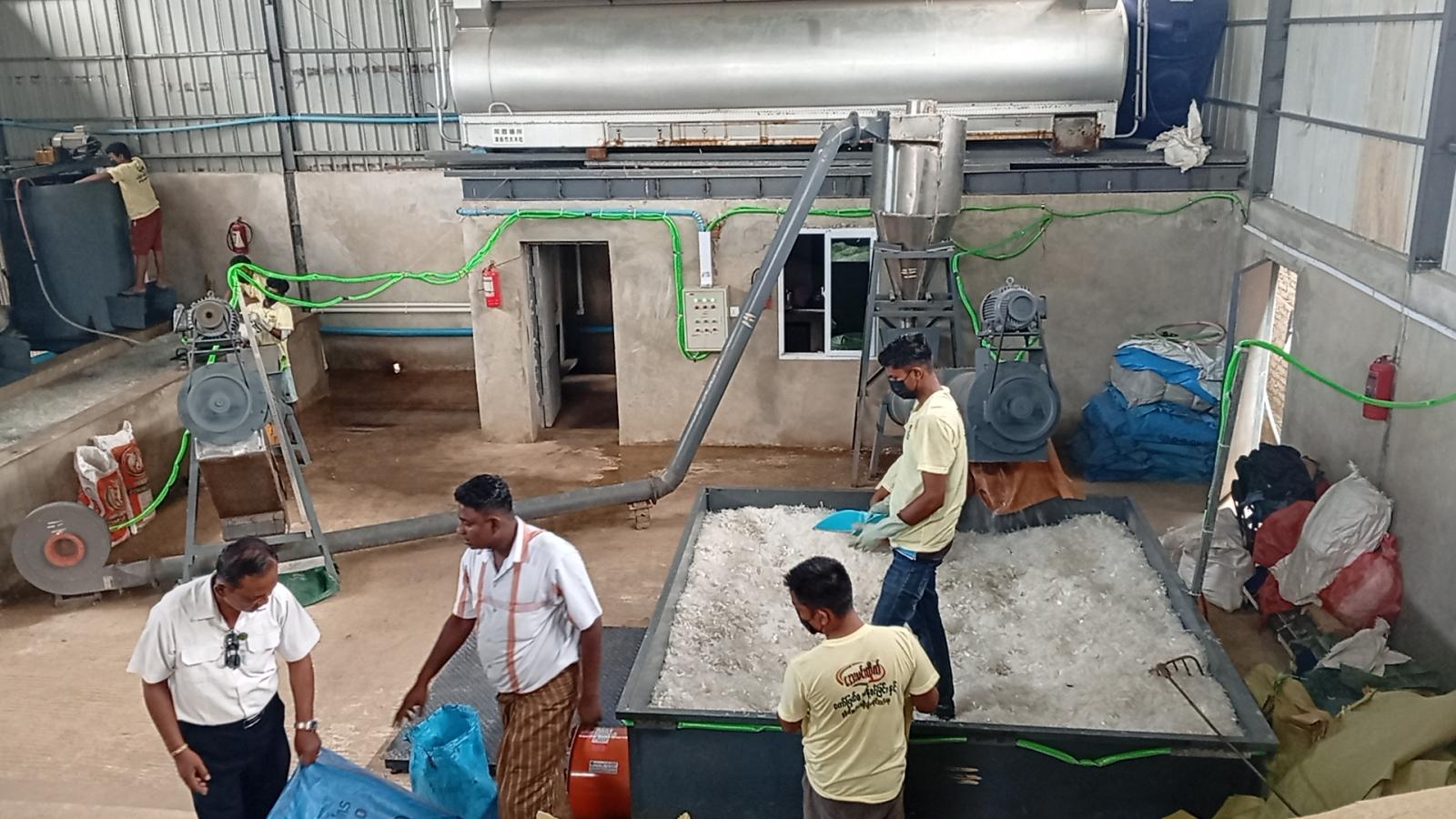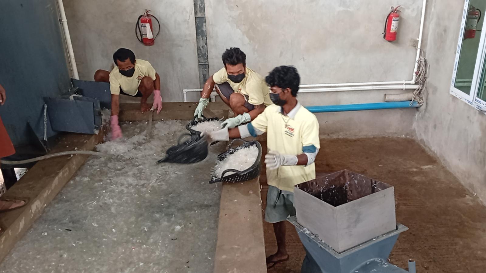 မေး။ သန့်စင်ပြီးကော်ဖြတ်စ ပလတ်စတစ်လုပ်ငန်း လည်ပတ်မှုအတွက် ဝန်ထမ်းဦးရေ ဘယ်လောက်ရှိပါသလဲ။ ဝန်ထမ်းတွေရဲ့ နေထိုင်မှု၊ ကျန်းမာရေး ဘယ်လိုစီစဉ်ဆောင်ရွက်ပေးပါသလဲ သိပါရစေ။