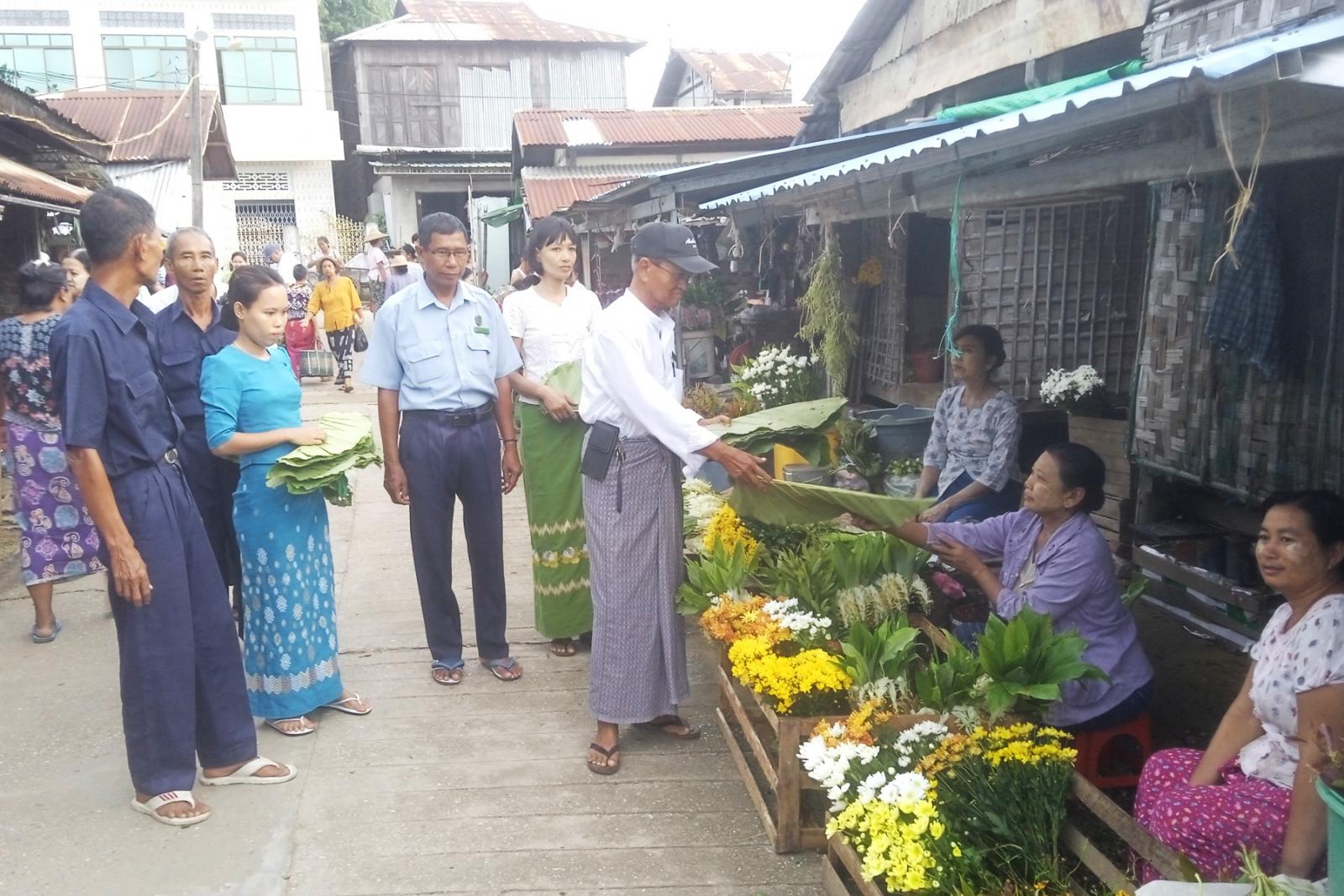 မကွေးတိုင်းဒေသကြီး၊ သရက်ခရိုင်၊ ကံမမြို့၌ သဘာဝပတ်ဝန်းကျင် ထိန်းသိမ်းရေးနှင့် ပြည်သူများ ပလတ်စတစ်အိတ် ကြွပ်ကြွပ်အိတ် လျှော့နည်းသုံးစွဲစေရန် ရည်ရွယ်၍ မြို့နယ်စည်ပင်သာယာ မြို့မဈေးအတွင်း ဈေးရောင်းဈေးဝယ်ပြည်သူများ ပလတ်စတစ် ကြွပ်ကြွပ်အိတ်အစား ငှက်ပျောဖက်၊ အင်ဖက်၊ စက္ကူအိတ်များ အသုံးပြုနိုင်ရေး အသိပညာပေးခြင်းနှင့် ကြွပ်ကြွပ်အိတ်အစားထိုး အင်ဖက်များ အခမဲ့ ဖြန့်ဝေခြင်းကို ယနေ့ နံနက်(၇)နာရီက အဆိုပါဈေးအတွင်း ဆောင်ရွက်ခဲ့ကြသည်။