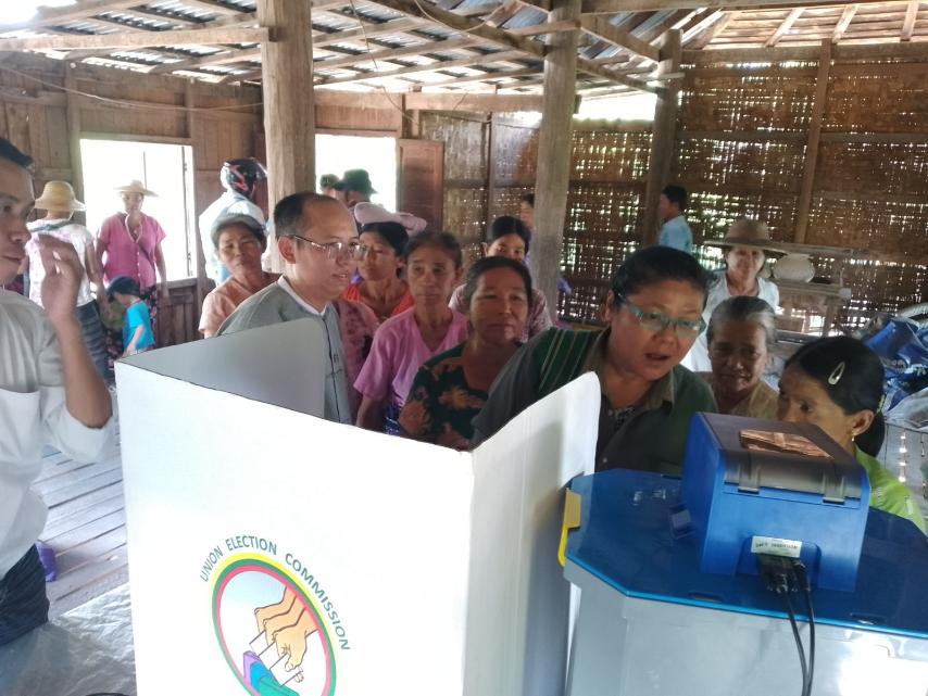 ထို့နောက် မြန်မာအီလက်ထရောနစ်မဲပေးစက် (MEVM) ဖြင့် လက်တွေ့သရုပ်ပြစမ်းသပ်မဲပေးနည်း အသုံးပြုပုံ အသုံးပြုနည်းများအား ရှင်းလင်းပြသပေးပြီး တက်ရောက်လာသော ပြည်သူများက မြန်မာအီလက်ထရောနစ်မဲပေးစက် (MEVM) ဖြင့် ဆန္ဒမဲပေးနည်းကို လက်တွေ့သရုပ်ပြ ဆောင်ရွက်ခဲ့သည်။