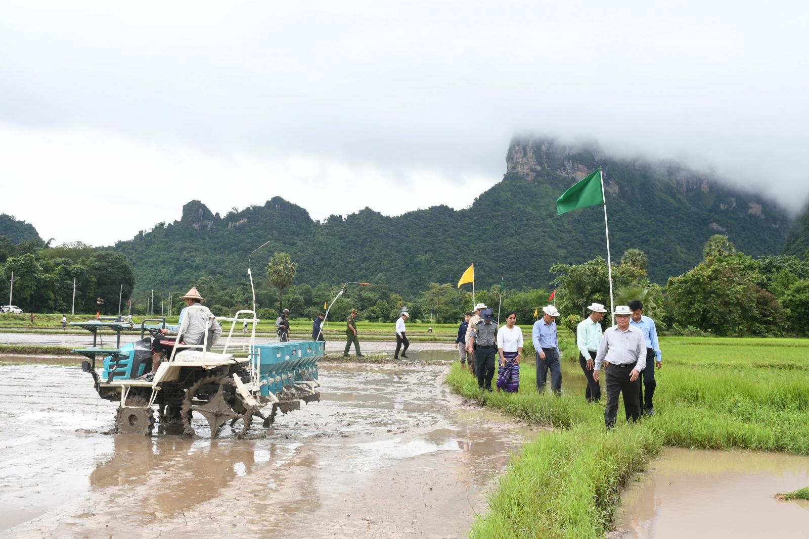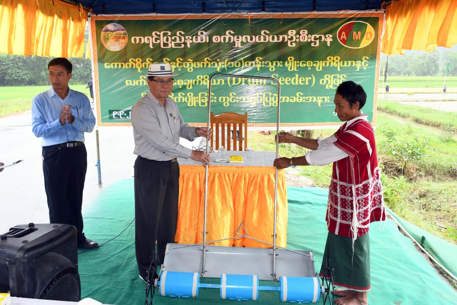 ထို့နောက် စက်မှုလယ်ယာဦးစီးဌာန ပြည်နယ်ဦးစီးမှူးက မျိုးစေ့ချကိရိယာများနှင့်ပတ်သက်၍ ရှင်းလင်းပြောကြားပြီး ပြည်နယ်ဝန်ကြီးချုပ်၊ ပြည်နယ်တရားလွှတ်တော်တရားသူကြီးချုပ်၊ ပြည်နယ်အစိုးရအဖွဲ့ဝင်များက ရဲသာ (ကမော့ကစင်)၊ တော်ပုံ၊ လှိုင်ကမ္ဘာ၊ တရုတ်လှ၊ လှာကဒေါင်ကျေးရွာများမှ တောင်သူများအား လက်ဆွဲမျိုးစေ့ချကိရိယာများကို အခမဲ့ ချီးမြှင့်ပေးအပ်ခဲ့ကြသည်။