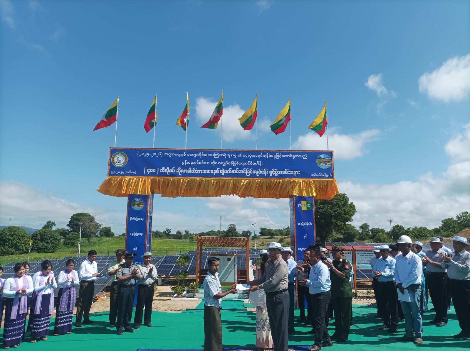 ဆက်လက်ပြီး တိုင်းဒေသကြီးဝန်ကြီးချုပ်နှင့်အဖွဲ့သည် ဆင်ပေါင်ဝဲမြို့နယ်၊ မွှန်းညောင်ပင်သာ ဆိုလာလျှပ်စစ်မြစ်ရေတင်စီမံကိန်းမှ စိုက်ပျိုးရေဖြင့် စိုက်ပျိုးထားသည့် ကွင်းအမှတ်(၄၃၂)ရှိ တောင်သူ ဦးစိုးအောင်၏ လယ်ယာမြေဧက(၁.၈၂)ဧက၊ အောင်နိုင်တိုး မိုးစပါးစိုက်ခင်း စိုက်ပျိုးဖြစ်မှုတို့ကို ကြည့်ရှုအားပေးကာ စိုက်ပျိုးရေးကဏ္ဍဖွံ့ဖြိုးတိုးတက်စေရေး ဒေသခံတောင်သူများနှင့် တာဝန်ရှိသူများအား လိုအပ်သည်များကို လမ်းညွှန်မှာကြားခဲ့ပြီး တိုင်းဒေသကြီးဝန်ကြီးချုပ် ဦးတင့်လွင်နှင့် အဖွဲ့သည် ဆင်ပေါင်ဝဲမြို့နယ် မွှန်းညောင်ပင်သာဆိုလာလျှပ်စစ်မြစ်ရေတင်စီမံကိန်းသို့ ရောက်ရှိပြီး စီမံကိန်းရှင်းလင်းဆောင်တွင် လုပ်ငန်းလွှဲပြောင်းပေးအပ်ပွဲအခမ်းအနားကို ကျင်းပရာ တိုင်းဒေသကြီးဝန်ကြီးချုပ် ဦးတင့်လွင်က အဖွင့်အမှာစကားပြောကြားပြီး ဆိုလာဓာတ်အားပေးစနစ် တွဲဖက်တပ်ဆင်ခြင်းလုပ်ငန်းအား လုပ်ငန်းဆောင်ရွက်ခဲ့သည့် ကုမ္ပဏီမှ ဆည်မြောင်းနှင့်ရေအသုံးချမှုစီမံခန့်ခွဲရေးဦးစီးဌာန(ရေအရင်းမြစ်) တာဝန်ရှိသူ တစ်ဦးက(၄၀၀)ကီလိုဝပ်ဆိုလာဓာတ်အားပေးစနစ် တွဲဖက်တပ်ဆင်ခြင်းလုပ်ငန်း မှတ်တမ်းဖိုင်အား လွှဲပြောင်းပေးအပ်ခဲ့ကြသည်။