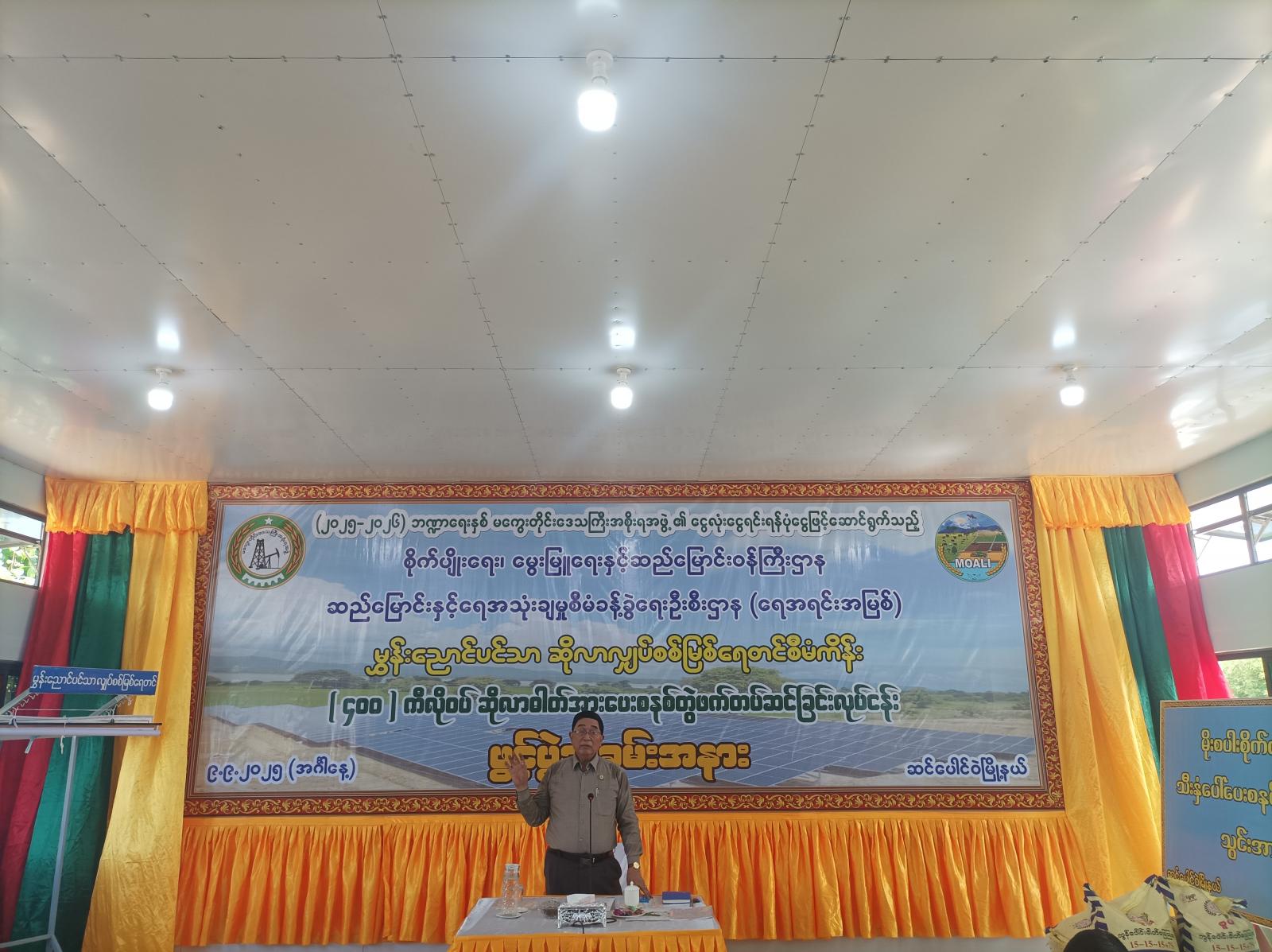 ဆက်လက်၍ တိုင်းဒေသကြီးဝန်ကြီးချုပ် ဦးတင့်လွင်နှင့် အဖွဲ့သည် ဆိုလာလျှပ်စစ်မြစ်ရေတင်စီမံကိန်း (၄၀၀) ကီလိုဝပ်ဆိုလာဓာတ်အားပေးစနစ် တွဲဖက်တပ်ဆင်ခြင်းလုပ်ငန်းခွင်အား လှည့်လည်ကြည့်ရှုစစ်ဆေးခဲ့ပြီး အဆိုပါလုပ်ငန်းဆောင်ရွက်ခဲ့သည့် Capacity Build Engineering Co.Ltd မှ ရှင်းလင်းတင်ပြခဲ့ကြောင်း သိရသည်။