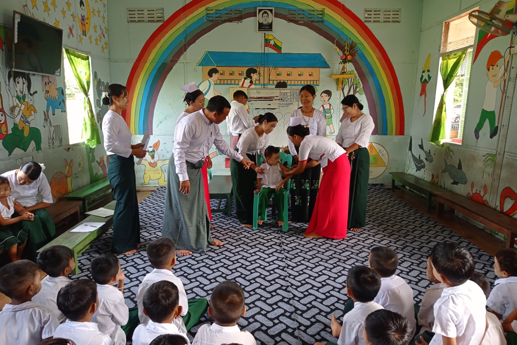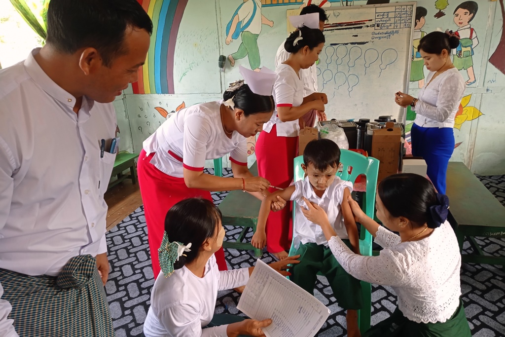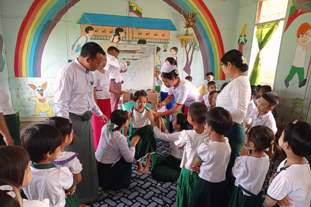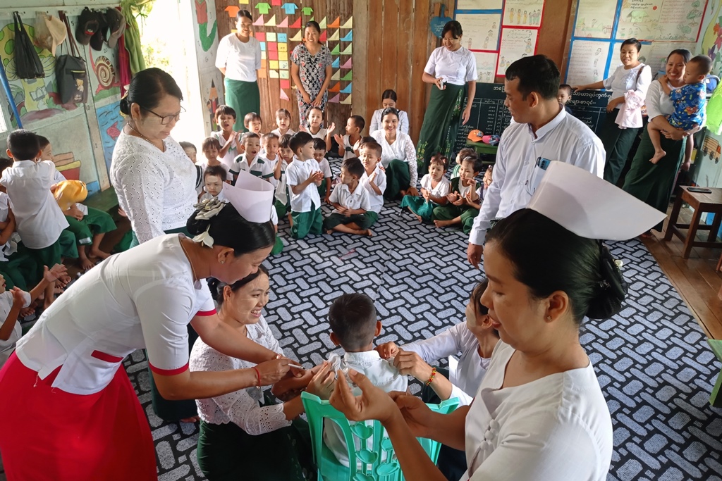 ထိုသို့ကာကွယ်ဆေးများထိုးနှံပေးရာတွင် မြို့နယ်ကျန်းမာရေးဦးစီးဌာနမှ မြို့နယ်ကျန်းမာရေးမှူး ဦးထွန်းဇော်လင်း ဦးဆောင်သည့် ကျန်းမာရေးဝန်ထမ်းများက KG ကျောင်းသား၊ ကျောင်းသူလေးများအား ဂျပန်ဦးနှောက်ရောင် ရောဂါကာကွယ်ဆေးနှင့် ဝက်သက်-ဂျိုက်သိုးရောဂါကာကွယ်ဆေးများကို ထိုးနှံပေးကာ ကာကွယ်ဆေးထိုးနှံပေးခြင်းနှင့်ပတ်သက်၍ ကျန်းမာရေးအသိပညာပေးခြင်းများကို ဆောင်ရွက်ခဲ့ကြပြီး သက်ဆိုင်ရာကျောင်းအုပ်ဆရာ/ဆရာမကြီးများ၊ ဆရာ/ဆရာမများက လိုအပ်သည်များကို ဝိုင်းဝန်း ကူညီဆောင်ရွက်ပေးခဲ့ကြသည်။