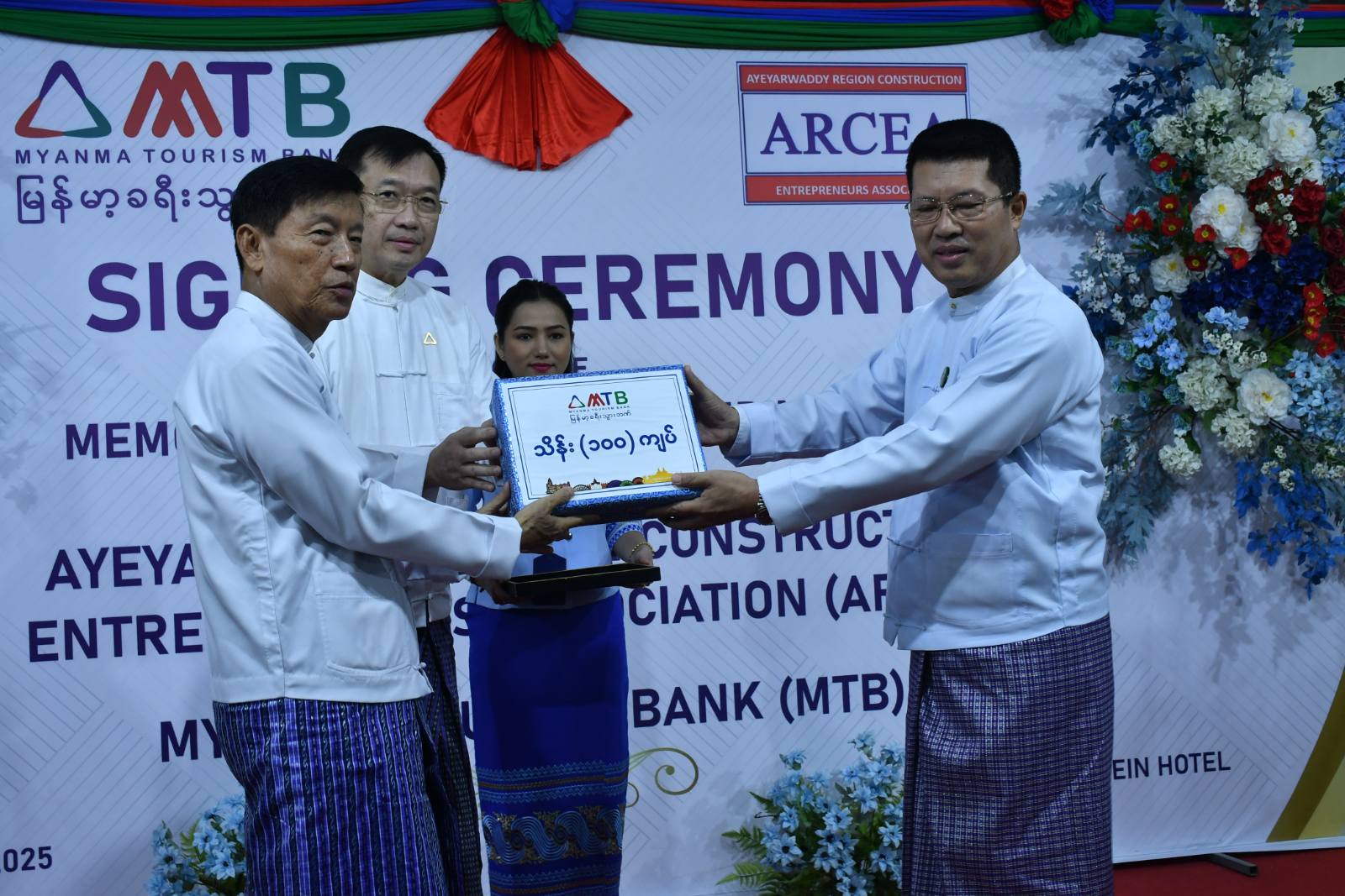 ဆက်လက်၍ မြန်မာ့ခရီးသွားဘဏ်နှင့် ဧရာဝတီတိုင်းဒေသကြီး ဆောက်လုပ်ရေးလုပ်ငန်းရှင်များအသင်းမှ တာဝန်ရှိသူများက MOU လက်မှတ်ရေးထိုးကြကာ အမှတ်တရလက်ဆောင်ပစ္စည်းများ အပြန်အလှန်ပေးအပ်ခဲ့ကြပြီး တိုင်းဒေသကြီးဝန်ကြီးချုပ်နှင့် ဧည့်သည်တော်များသည် စုပေါင်းမှတ်တမ်းတင် ဓာတ်ပုံရိုက်ကူးခဲ့ကြကြောင်းသိရသည်။