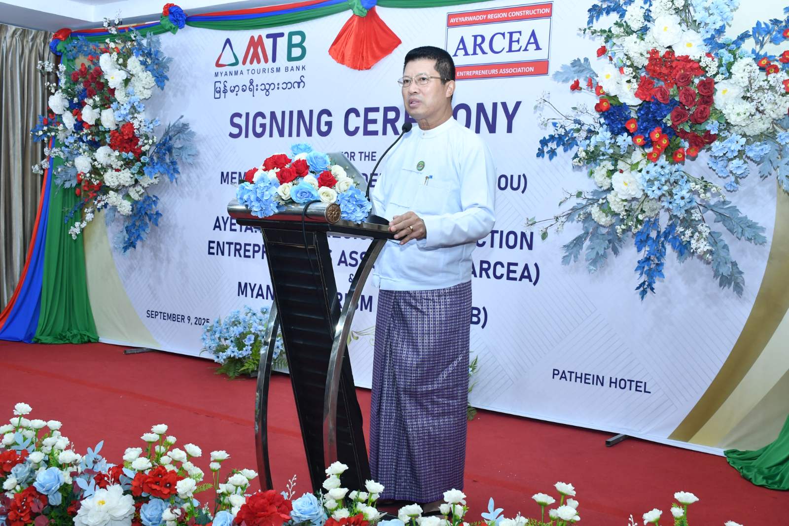 ဦးစွာ တိုင်းဒေသကြီးဝန်ကြီးချုပ်က “ယနေ့သည် မြန်မာ့ခရီးသွားဘဏ်နှင့် ဧရာဝတီတိုင်းဒေသကြီး ဆောက်လုပ်ရေးလုပ်ငန်းရှင်များအသင်း၏ MOU လက်မှတ်ရေးထိုးနိုင်ခြင်းဖြစ်၍ တိုင်းဒေသကြီးအတွက် မင်္ဂလာရှိသည့်နေ့ဟု ပြောရမည်ဖြစ်ပါကြောင်း၊ ယခုကဲ့သို့ MOU လက်မှတ်ရေးထိုးနိုင်ခဲ့သဖြင့် ခရီးသွားလုပ်ငန်း၊ ဆောက်လုပ်ရေးလုပ်ငန်းများသာမက ကျန်ကဏ္ဍနယ်ပယ်အသီးသီးအတွက်လည်း အထောက်အကူပြုမည်ဖြစ်ပါကြောင်း၊ ဧရာဝတီတိုင်းဒေသကြီးသည် တည်ငြိမ်အေးချမ်းမှုရှိပြီး ရန်ကုန်မြို့နှင့် အနီးဆုံးဖြစ်၍ ပြည်တွင်း၊ ပြည်ပ ခရီးသွားလုပ်ငန်းများ ဖွံ့ဖြိုးတိုးတက်သည့် တိုင်းဒေသကြီးဖြစ်ပါကြောင်း၊ တိုင်းဒေသကြီးတွင် ချောင်းသာ၊ ရွှေသောင်ယံ၊ ငွေဆောင်၊ ဂေါ်ရန်ဂျီ စသည့်ကမ်းခြေများ၊ တန်ခိုးကြီးစေတီပုထိုးများ၊ အထင်ကရနေရာများလည်း များစွာရှိပါကြောင်း၊ ဧရာဝတီတိုင်းဒေသကြီး အစိုးရအဖွဲ့အနေနှင့် ဘက်စုံဖွံ့ဖြိုး တိုးတက်ရေးအတွက် လူမှုစီးပွားရေးလုပ်ငန်းများ ပိုမိုဖွံ့ဖြိုးတိုးတက် စေရန်နှင့် တိုင်းဒေသကြီးအတွင်းရှိ ပုဂ္ဂလိကဆောက်လုပ်ရေးလုပ်ငန်းရှင်များ အခန်းကဏ္ဍ ဘက်စုံဖွံ့ဖြိုးတိုးတက်နိုင်ရန် ဆောင်ရွက်လျက်ရှိပါကြောင်းနှင့် မိမိတို့တိုင်းဒေသကြီး ဘက်စုံကဏ္ဍစုံ ဖွံ့ဖြိုးတိုးတက်စေရေးအတွက် ဝိုင်းဝန်းကြိုးပမ်း ဆောင်ရွက်ပေးကြရန် ”ဂုဏ်ပြုအမှာစကား ပြောကြားခဲ့ပြီးနောက် တာဝန်ရှိသူများက ဧရာဝတီတိုင်းဒေသကြီး၏ အားကစားဖွံ့ဖြိုးတိုးတက်ရေးနှင့် အမျိုးသမီးဘောလုံးအသင်းအောင်နိုင်ရေး ရန်ပုံငွေများပေးအပ်ရာ တိုင်းဒေသကြီးဝန်ကြီးချုပ်က လက်ခံရယူခဲ့သည်။ ထို့နောက် မြန်မာ့ခရီးသွား ဘဏ်ဥက္ကဋ္ဌ၊ ဧရာဝတီတိုင်းဒေသကြီး ဆောက်လုပ်ရေးလုပ်ငန်းရှင်များအသင်းဥက္ကဋ္ဌနှင့် အတွင်းရေးမှူးတို့က မိတ်ဆက်စကားများ အသီးသီးပြောကြားခဲ့ကြသည်။