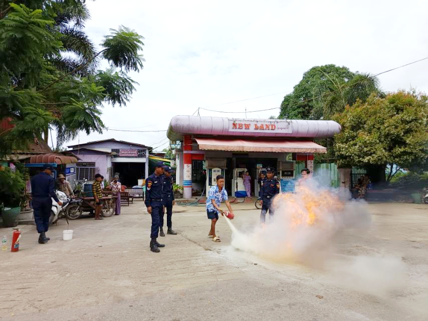 ထိုသို့ဆောင်ရွက်ရာတွင် မြို့နယ်မီးသတ်ဦးစီးဌာနမှ လက်ထောက်မီးသတ်ဦးစီးမှူး ဦးသန့်ဇင်ဦးက မီးဘေးအန္တရာယ်မဖြစ်ပွား မပေါ်ပေါက်စေရေး၊ မီးဘေးအန္တရာယ် ကြိုတင်ကာကွယ်ရေးအတွက် ကြိုတင်ပြင်ဆင်ဆောင်ရွက်ထားရမည့် လုပ်ငန်းများ၊ လိုက်နာဆောင်ရွက်ရမည့်အချက်များ မီးဘေးအန္တရာယ်ဖြစ်ပေါ်လာပါက အလျင်အမြန် ဆောင်ရွက်ရမည့်လုပ်ငန်းစဉ်များအား ရှင်းလင်းပြောကြားခဲ့သည်။ ထို့နောက် လက်ထောက်မီးသတ်ဦးစီးမှူး ဦးသန့်ဇင်ဦးနှင့် တပ်ဖွဲ့ဝင်များမှ မီးသတ်ဆေးဘူး အသုံးပြုပုံအဆင့်ဆင့်အား ရှင်းလင်းပြောကြားပြီး ဆီမီးလောင်မှုအား မီးသတ်ဆေးဘူးအသုံးပြု၍ မီးငြှိမ်းသတ်မှုများကို လက်တွေ့ဇာတ်တိုက်လေ့ကျင့် သရုပ်ပြသခဲ့ရာ New Land စက်သုံးဆီ အရောင်းဆိုင်မှ တာဝန်ရှိသူများနှင့် ဝန်ထမ်းများက ပူးပေါင်းပါဝင် ဆောင်ရွက်ခဲ့ကြကြောင်း သိရသည်။