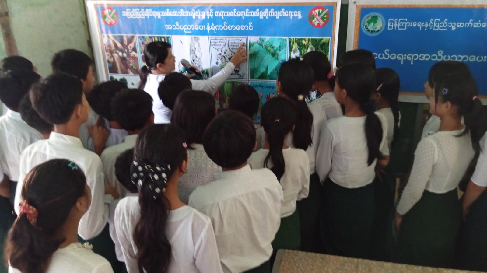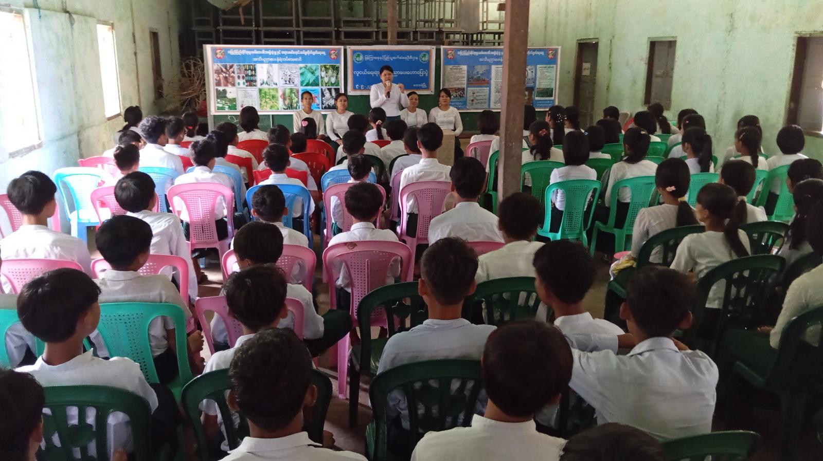 အခမ်းအနားတွင် ပြန်ကြားရေးနှင့်ပြည်သူ့ဆက်ဆံရေးဦးစီးဌာန၊ ဦးစီးအရာရှိ ဒေါ်မြင့်မြင့်ခိုင်က ကျောင်းသား၊ ကျောင်းသူ၊ လူငယ်များ ဗလငါးတန်ပြည့်စုံ၍ အသိပညာဗဟုသုတများ တိုးပွားလာစေရန်၊ စာပေဗဟုသုတများစွာ သိုလှောင်ထားသည့် ပညာဘဏ်တိုက် စာကြည့်တိုက်များနှင့် ရင်းနှီးကျွမ်းဝင်မှုရှိပြီး စာပေလေ့လာဖတ်ရှုသည့် အလေ့အကျင့်ကောင်းများရရှိစေရန်၊ အားလပ်ချိန်များတွင် စာပေလေ့လာဖတ်ရှု၍ အချိန်ကိုအကျိုးစွာ အသုံးချနိုင်စေရေး၊ စာအုပ်စာပေလေ့လာခြင်းအားဖြင့် အသိဥာဏ်ပညာဖွံ့ဖြိုးလာပြီး မိမိနိုင်ငံနှင့် မိမိလူမျိုးကို အကျိုးပြုနိုင်မည့် လူငယ်များ ဖြစ်ပေါ်လာစေရေးအတွက် အခြေခံပညာကျောင်းများအရောက် ကွင်းဆင်း၍ လူငယ်ရေးရာ အသိပညာပေး ဟောပြောပွဲ၊ အသိပညာပေးလုပ်ငန်းများ ကွင်းဆင်းဆောင်ရွက်နေမှုအား ရှင်းလင်းဆွေးနွေးခဲ့ပြီး လူငယ်နှင့် အနာဂတ်ခေါင်းစဥ်ဖြင့် အသိပညာပေးဟောပြောခဲ့သည်။ ထို့နောက် တက်ရောက်လာသည့် ကျောင်းသား၊ ကျောင်းသူများအား သဘာဝဘေးအန္တရာယ် ကြိုတင်ကာကွယ်ရေး လက်ကမ်းစာစောင်များ ဖြန့်ဝေပေးခဲ့ကြောင်း သိရသည်။