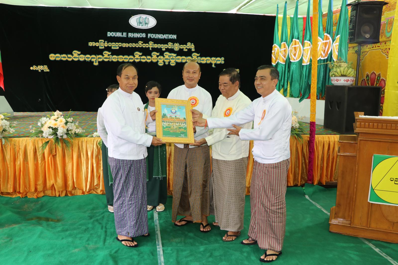 ဆက်လက်၍ တိုင်းဒေသကြီး ဝန်ကြီးချုပ်က ကြံ့နှစ်ကောင်ဖောင်ဒေးရှင်းမှ တာဝန်ရှိသူများထံ ကျောင်းဆောင်သစ်ဖွင့်ပွဲ အထိမ်းအမှတ် ဂုဏ်ပြုမှတ်တမ်းလွှာအား ပေးအပ်ပြီး ကြံ့နှစ်ကောင်ဖောင်ဒေးရှင်းမှ တာဝန်ရှိသူတစ်ဦးက မြို့နယ်ပညာရေးမှူးထံ ကျောင်းဆောင်သစ်နှင့် ပတ်သက်သည့် စာရွက်စာတမ်းများအား ပေးအပ်သည်။
