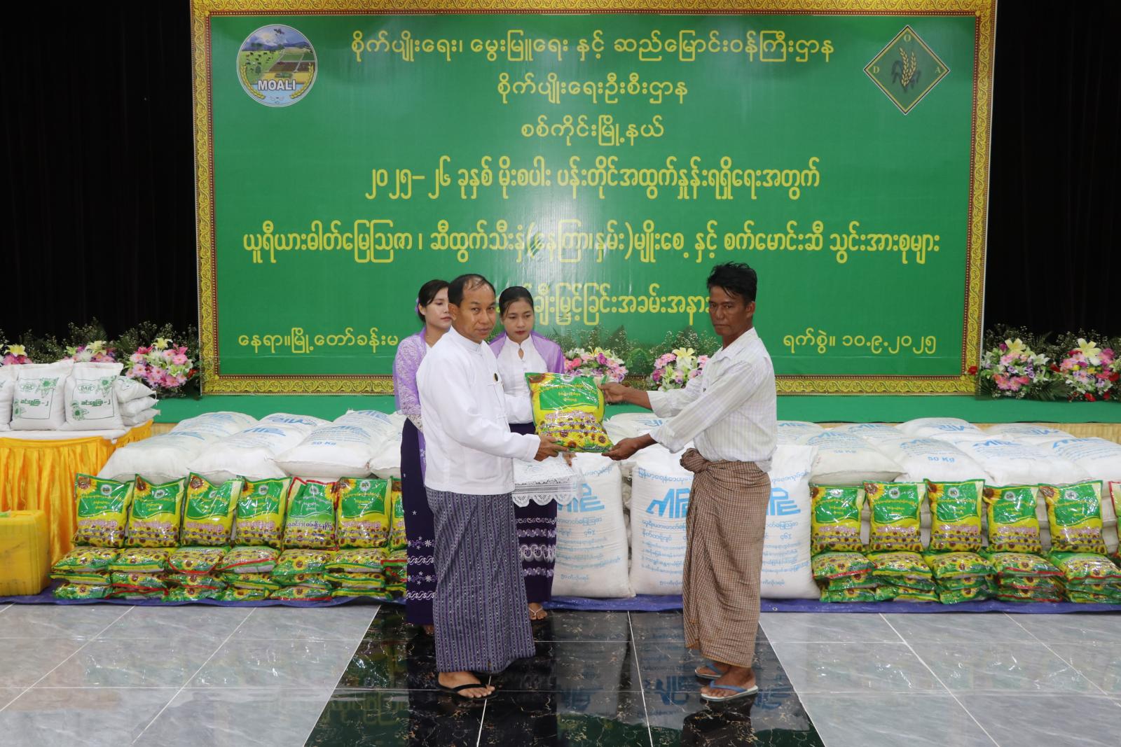 ထို့နောက် တိုင်းဒေသကြီးဝန်ကြီးချုပ်၊ တိုင်းဒေသကြီး အစိုးရအဖွဲ့များနှင့် တိုင်းဒေသကြီးအဆင့် ဌာနဆိုင်ရာများက စစ်ကိုင်းမြို့နယ်အတွင်းရှိကျေးရွာ ၈ ရွာမှ ဒေသခံတောင်သူ ၇၀၀ ဦးအတွက် သွင်းအားစု (ယူရီယား မြေသြဇာများနှင့်လယ်ယာသုံးစက် မောင်းဆီ)များအား ပေးအပ်ချီးမြှင့်ကြသည်။