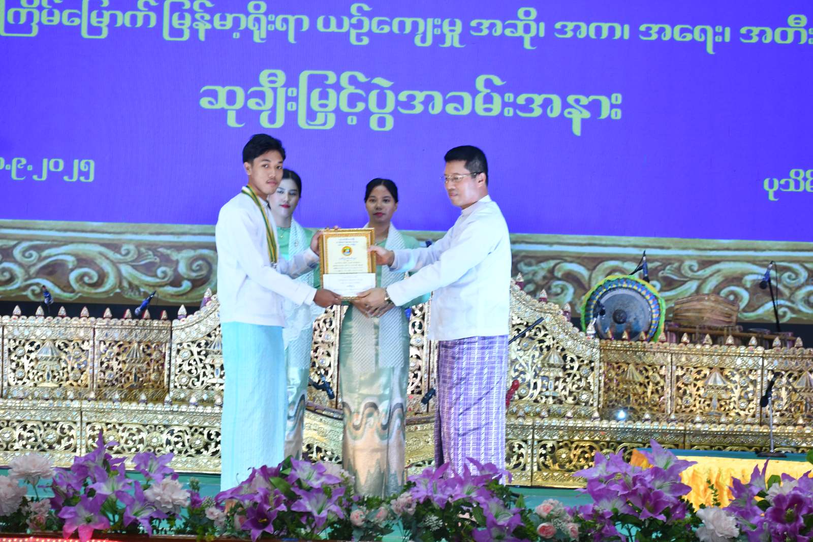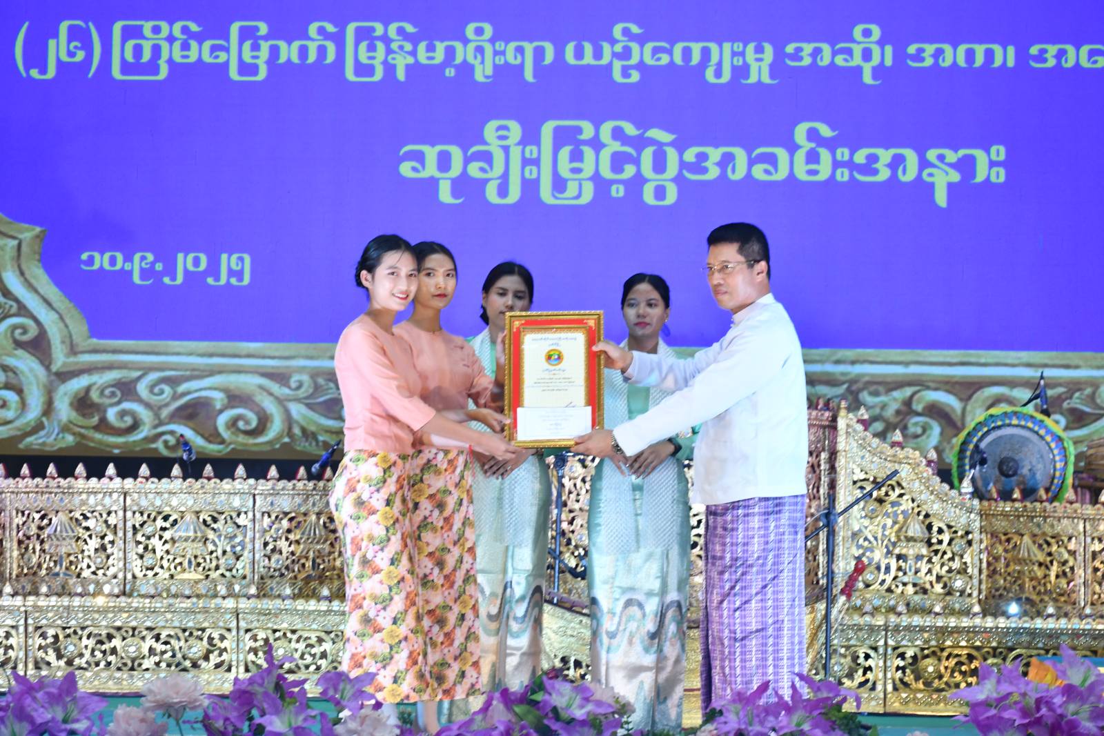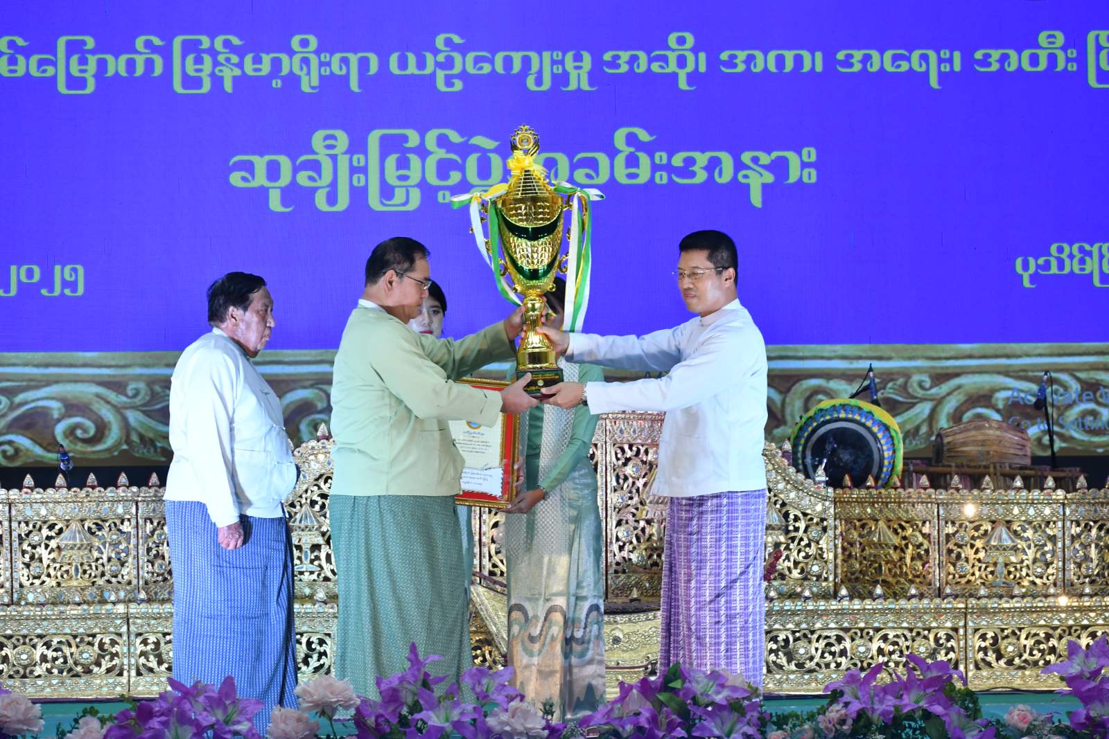 ထို့နောက် ဧရာဝတီတိုင်းဒေသကြီး၏ (၂၆)ကြိမ်မြောက် မြန်မာ့ရိုးရာယဉ်ကျေးမှု အဆို၊ အက၊ အရေး၊ အတီး ပြိုင်ပွဲကျင်းပရေး နာယက၊ တိုင်းဒေသကြီး ဝန်ကြီးချုပ်က ဒိုင်ချုပ်များ၊ တေးသံရှင်များ၊ ခရိုင်အလိုက် အကဲဖြတ်ဒိုင်များအား ဂုဏ်ပြုမှတ်တမ်းလွှာနှင့် ဂုဏ်ပြုချီးမြှင့်ငွေများကိုလည်းကောင်း၊ တံခွန်စိုက်တတိယဆုရရှိသည့် မအူပင်ခရိုင်၊ ဒုတိယဆုရရှိသည့် မြောင်းမြခရိုင်နှင့် ပထမဆုရရှိသည့် ပုသိမ်ခရိုင်တို့အား ဆုဖလားနှင့် ဂုဏ်ပြုဆုငွေများကိုလည်းကောင်း ဆက်လက်ပေးအပ်ချီးမြှင့်ခဲ့ကာ နိုင်ငံကျော်တေးသံရှင် ဝါးခယ်မရဲမောင်၊ ဖျော်ဖြေရေးအဖွဲ့များ၊ ပြိုင်ပွဲတွင်ဆုရရှိသူများ၏ ပြန်လည်ဖျော်ဖြေမှုများကို ကြည့်ရှုအားပေးခဲ့ပြီး ပြိုင်ပွဲဝင်များအား ရင်းရင်းနှီးနှီးနှုတ်ဆက်ခဲ့သည်။