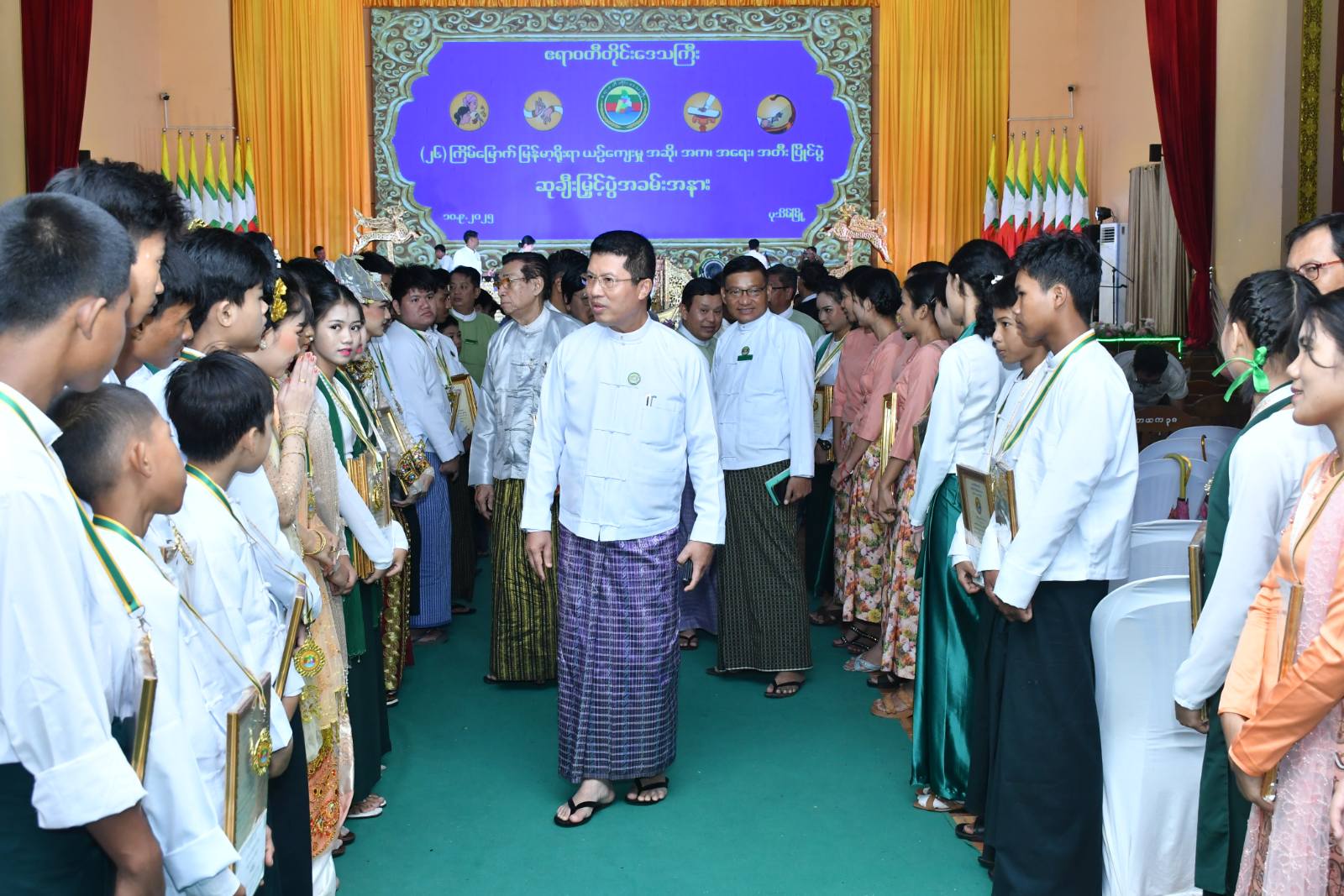 ဆက်လက်၍ တိုင်းဒေသကြီးဝန်ကြီးချုပ်က အဆိုပြိုင်ပွဲ အဆင့်မြင့်ပညာ (အမျိုးသား) မဟာဂီတ၊ အခြေခံပညာ (၁၀-၁၅)(အမျိုးသား) မဟာဂီတ၊ အခြေခံပညာ (၁၅-၂၀) (အမျိုးသား) မဟာဂီတ၊ အဆင့်မြင့်ပညာ(အမျိုးသား) ခေတ်ဟောင်း/ကာလပေါ်၊ အခြေခံပညာ (၁၅-၂၀)(အမျိုးသား) (အမျိုးသမီး)ခေတ်ဟောင်း/ကာလပေါ်၊ အဆင့်မြင့်ပညာ(အမျိုးသား) အမျိုးဂုဏ်/ဇာတိဂုဏ်၊ အခြေခံပညာ (၁၀-၁၅ )(အမျိုးသား) ခေတ်ဟောင်း/ကာလပေါ်၊ အကပြိုင်ပွဲ အဆင့်မြင့်ပညာ(အမျိုးသား)တစ်ဦးချင်းအကပြိုင်ပွဲ၊ အခြေခံပညာ (၁၅-၂၀)(အမျိုးသား) တစ်ဦးချင်းအကပြိုင်ပွဲ၊ အခြေခံပညာ (၁၀-၁၅) (အမျိုးသား) တစ်ဦးချင်းအကပြိုင်ပွဲ၊ အဆင့်မြင့်ပညာ အရေးပြိုင်ပွဲ၊ အဆင့်မြင့်ပညာ (အမျိုးသား) အတီးပြိုင်ပွဲ (စောင်း)၊ အခြေခံပညာ (၁၅-၂၀) (အမျိုးသား) အတီးပြိုင်ပွဲ (စန္ဒယား) ၊ အခြေခံပညာ (၁၅-၂၀) (အမျိုးသား) အတီးပြိုင်ပွဲ (ဂီတာ) ၊အခြေခံပညာ (၁၀-၁၅) (အမျိုးသား) အတီးပြိုင်ပွဲ (ပတ္တလား)၊ အဆင့်မြင့်ပညာ (အမျိုးသား) အိုးစည်အဖွဲ့လိုက်၊ အခြေခံပညာ (၁၅-၂၀)(အမျိုးသား) ဒိုးပတ်အဖွဲ့လိုက်၊ အခြေခံပညာ (၁၀-၁၅) (အမျိုးသား) ဆိုင်းဝိုင်းကြီးအဖွဲ့လိုက် ပြိုင်ပွဲများတွင် ပထမဆုရရှိသူများကိုလည်းကောင်း၊ တိုင်းဒေသကြီးဝန်ကြီးချုပ်၏ ဇနီးက အဆိုပြိုင်ပွဲ အဆင့်မြင့်ပညာ (အမျိုးသမီး) မဟာဂီတ၊ အခြေခံပညာ (၁၅-၂၀) (အမျိုးသမီး) မဟာဂီတ၊အဆင့်မြင့်ပညာ (အမျိုးသမီး) ခေတ်ဟောင်းကာလပေါ်၊ အဆင့်မြင့်ပညာ (အမျိုးသမီး) အမျိုးဂုဏ်၊ ဇာတိဂုဏ်၊ အခြေခံပညာ (၁၀-၁၅) (အမျိုးသမီး) ခေတ်ဟောင်း ကာလပေါ်၊ အကပြိုင်ပွဲ အဆင့်မြင့်ပညာ (အမျိုးသမီး) တစ်ဦးချင်း အကပြိုင်ပွဲ၊ အခြေခံပညာ (၁၅-၂၀) (အမျိုးသမီး) တစ်ဦးချင်း အကပြိုင်ပွဲ၊ အခြေခံပညာ (၁၀-၁၅) (အမျိုးသမီး) တစ်ဦးချင်း အကပြိုင်ပွဲ၊ အခြေခံပညာ (၁၀-၁၅) ကဗျာလွတ်အကပြိုင်ပွဲ၊ အခြေခံပညာ (၁၅-၂၀) အရေးပြိုင်ပွဲ၊ အတီးပြိုင်ပွဲ အခြေခံပညာ (၁၅-၂၀) (အမျိုးသမီး) အတီး ပြိုင်ပွဲ (စန္ဒယား)၊ အခြေခံပညာ (၁၅-၂၀) (အမျိုးသမီး) အတီး ပြိုင်ပွဲ (ပတ္တလား)၊ အခြေခံပညာ (၁၀-၁၅) (အမျိုးသမီး) အတီး ပြိုင်ပွဲ (တယော)၊ အခြေခံပညာ (၁၅-၂၀) (အမျိုးသမီး) အတီး ပြိုင်ပွဲ (မယ်ဒလင်)၊ အဆင့်မြင့်ပညာ (အမျိုးသမီး) အတီးပြိုင်ပွဲ (ဂီတာ)၊ အခြေခံပညာ (၁၅-၂၀) (အမျိုးသမီး) အတီး ပြိုင်ပွဲ (ဒုံမင်း)၊ အခြေခံပညာ (၁၅-၂၀) (အမျိုးသမီး) အတီး ပြိုင်ပွဲ (ဆိုင်းတစ်ဦးချင်း)၊ အခြေခံပညာ (၁၀-၁၅) (အမျိုးသမီး) အတီး ပြိုင်ပွဲ (ဒုံမင်း)၊ အခြေခံပညာ (၁၀-၁၅) (အမျိုးသမီး) အတီးပြိုင်ပွဲ (ဆိုင်းဝိုင်းကြီးအဖွဲ့လိုက်) ပထမဆုရရှိသူများအားလည်းကောင်း၊ (၂၆)ကြိမ်မြောက် မြန်မာ့ရိုးရာယဉ်ကျေးမှု အဆို၊ အက၊ အရေး၊ အတီး ပြိုင်ပွဲတွင် ဆုရရှိသူများကို တိုင်းဒေသကြီး တရားသူကြီးချုပ်၊ လုံခြုံရေးနှင့်နယ်စပ်ရေးရာဝန်ကြီး၊ အစိုးရအဖွဲ့ဝန်ကြီးများနှင့်ဇန