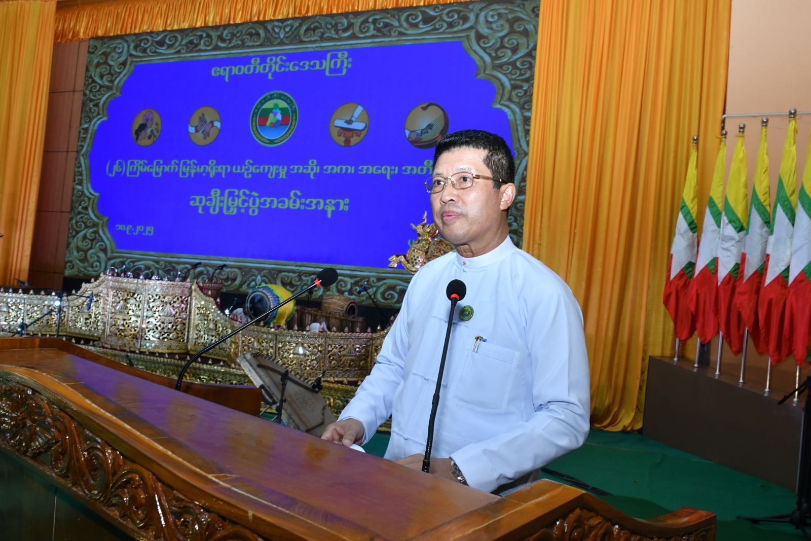 ဧရာဝတီတိုင်းဒေသကြီး၏ (၂၆) ကြိမ်မြောက် မြန်မာ့ရိုးရာယဉ်ကျေးမှု အဆို၊ အက၊ အရေး၊ အတီးပြိုင်ပွဲ ဆုချီးမြှင့်ပွဲ အခမ်းအနားကို ယမန်န်နေ့မွန်းလွဲပိုင်းက ပုသိမ်မြို့၊ မြို့တော်ခန်းမ၌ပြုလုပ်ရာ တိုင်းဒေသကြီးဝန်ကြီးချုပ် ဦးတင်မောင်ဝင်းနှင့်ဇနီး၊ တိုင်းဒေသကြီးအစိုးရအဖွဲ့ဝင်ဝန်ကြီးများနှင့် ၎င်းတို့၏ဇနီးများ၊ ဌာနဆိုင်ရာများ၊ ပြိုင်ပွဲအကဲဖြတ်ပညာရှင်များနှင့် ပြိုင်ပွဲဝင်များ တက်ရောက်ခဲ့ကြသည်။