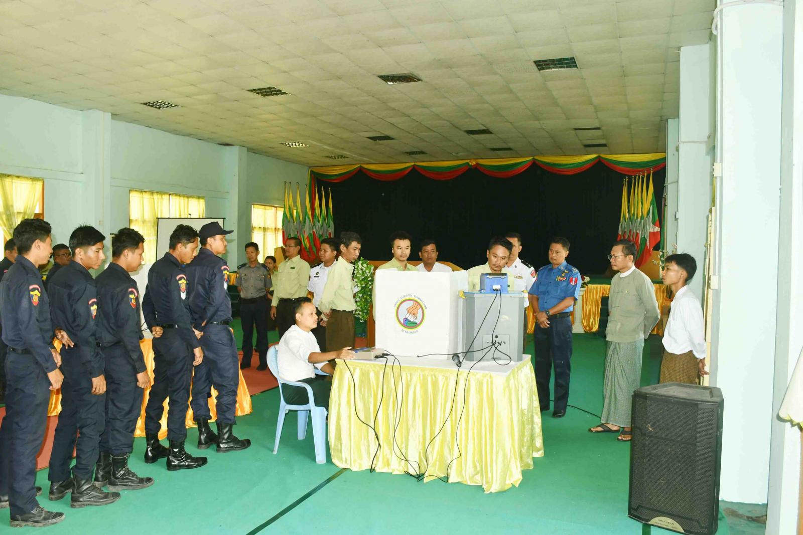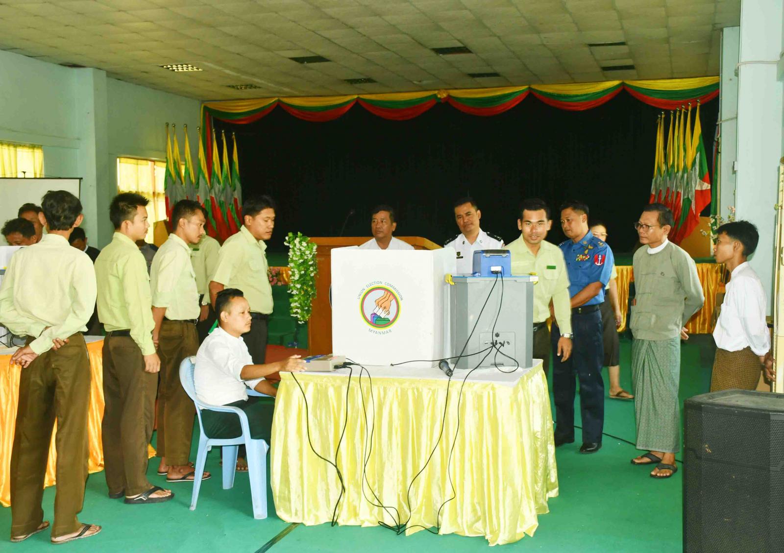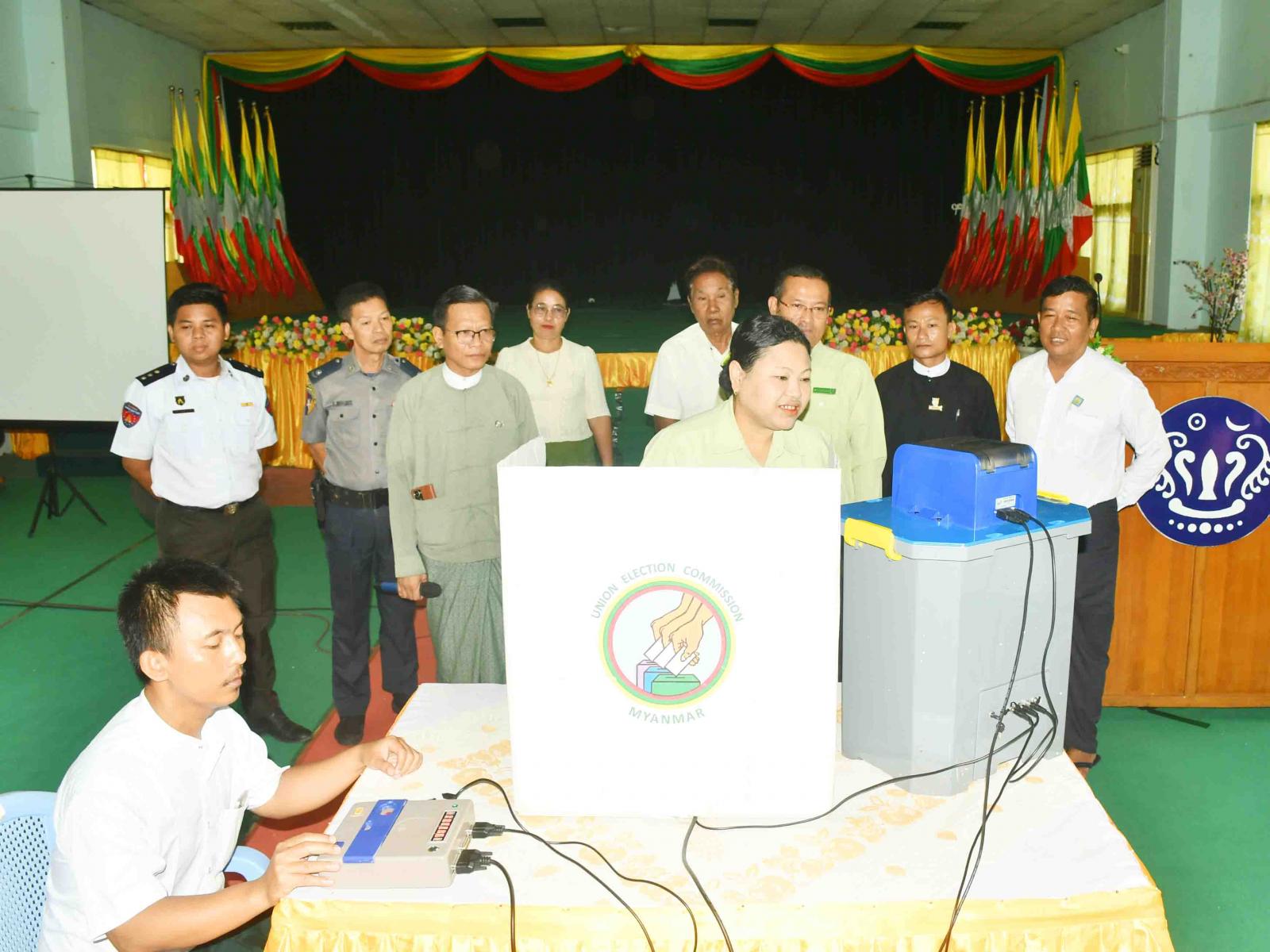 ဦးစွာ ခရိုင်ရွေးကောက်ပွဲအရာရှိ ဦးဌေးအောင်ခိုင်က မဲပေးစက်နှင့်စပ်လျဉ်းသည့် အကြောင်းအရာများနှင့် MEVM မဲပေးစက်ဖြင့် ဆန္ဒမဲပေးခြင်း လုပ်ငန်းစဉ် များကို ရှင်းလင်းပြောကြားသည်။ ထို့နောက် တက်ရောက်လာသည့် ဌာနဆိုင်ရာဝန်ထမ်းများက မြန်မာ အီလက်ထရောနစ် မဲပေးစက်(MEVM)ဖြင့် ဆန္ဒမဲပေးခြင်းကို လက်တွေ့စမ်းသပ်ဆောင်ရွက်ပြီး ခရိုင်ရွေးကောက်ပွဲအရာရှိက ထွက်ရှိလာသည့်စာရင်းဖြင့် ဆန္ဒပြုသူအရေအတွက် တိုက်ဆိုင်စစ်ဆေး ခြင်းနှင့် မဲရလဒ်ထုတ်ပြန်ခြင်းများကို လက်တွေ့သရုပ်ပြဆောင်ရွက်ခဲ့ကြသည်။
