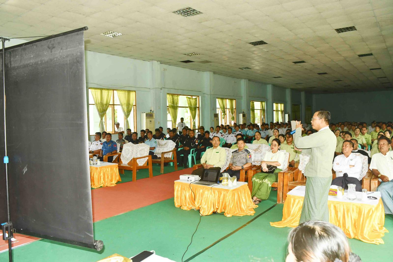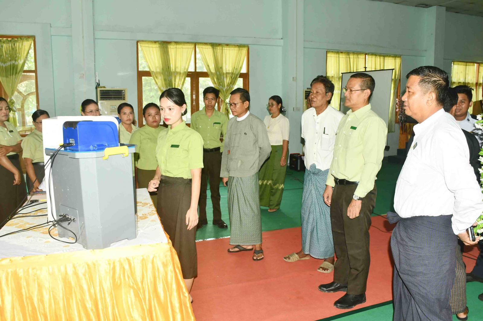 ရခိုင်ပြည်နယ် ကျောက်ဖြူမြို့၌ ဌာနဆိုင်ရာဝန်ထမ်းများအား မြန်မာအီလက်ထရောနစ် မဲပေးစက်(MEVM) ဆိုင်ရာ အသိပညာပေးခြင်းနှင့် လက်တွေ့စမ်းသပ်မဲပေးမှု သရုပ်ပြခြင်းကို ယနေ့နံနက် (၉)နာရီက အစိုးရရပ်ကွက်ရှိ ရမ္မာဝတီခန်းမ၌ ကျင်းပရာ ခရိုင်စီမံခန့်ခွဲရေးနှင့် အုပ်ချုပ် ရေးကော်မတီအဖွဲ့ဝင်(၁)နှင့် အဖွဲ့ဝင်များ၊ မြို့နယ်စီမံခန့်ခွဲရေးနှင့်အုပ်ချုပ်ရေးကော်မတီဥက္ကဋ္ဌနှင့် အဖွဲ့ဝင်များ၊ ဌာနဆိုင်ရာတာဝန်ရှိသူများက ကြည့်ရှုအားပေးသည်။