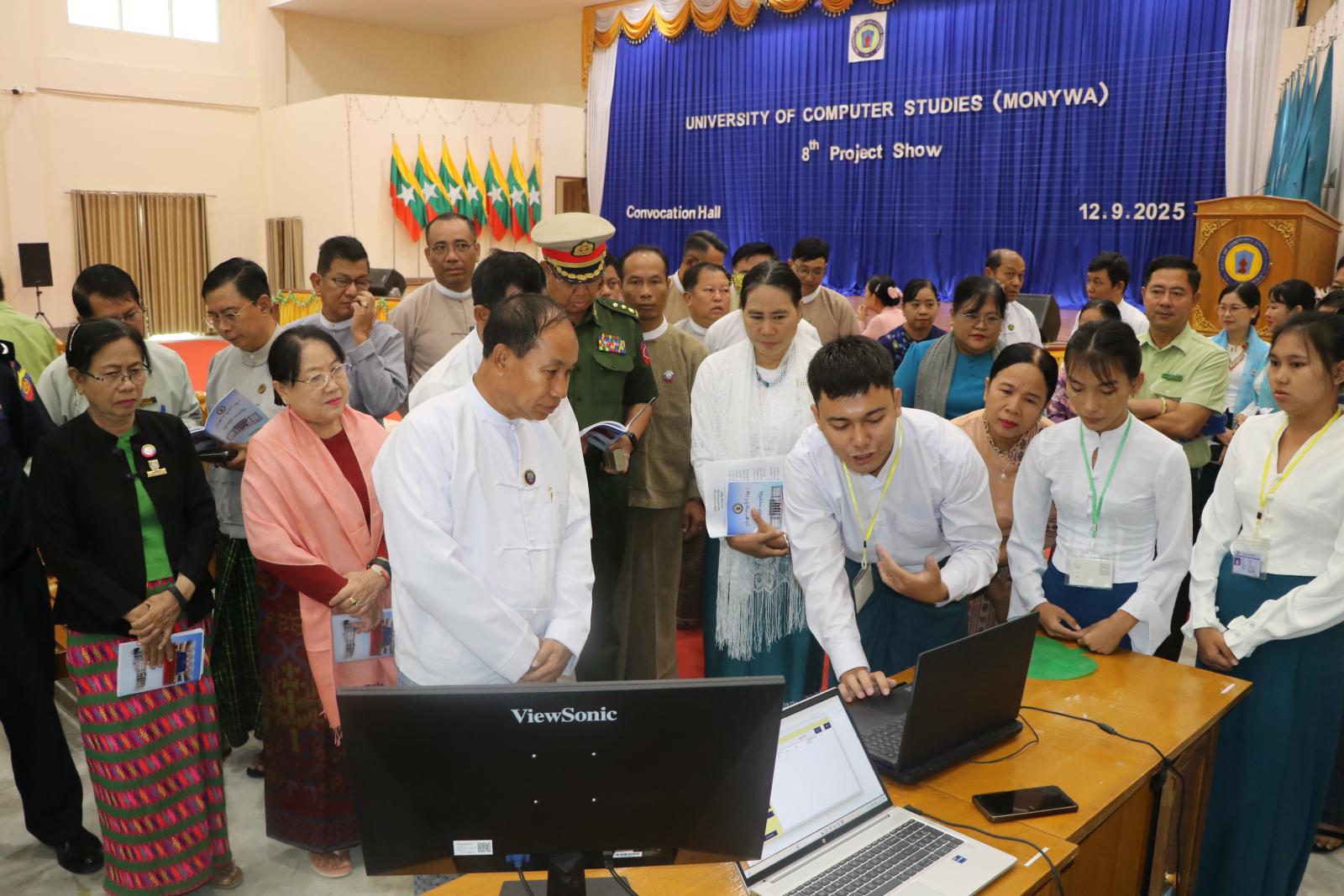 ဆက်လက်ပြီး တိုင်းဒေသကြီးဝန်ကြီးချုပ်နှင့် တာဝန်ရှိသူများက ခန်းမအတွင်း ခင်းကျင်းပြသထားသော ကွန်ပျူတာတက္ကသိုလ် (မုံရွာ) မှ ကျောင်းသား၊ကျောင်းသူများ ကိုယ်တိုင်စုပေါင်းတီထွင်ဖန်တီးထားသည့် ပရောဂျက်ပြခန်း ၅၁ ခန်းတို့အား လိုက်လံ ကြည့်ရှုအားပေးရာ ကျောင်းသား/သူများက မိမိတို့နှင့်သက်ဆိုင်သည့် ပရောဂျက်ပြခန်းများနှင့်ပတ်သက်၍ ပြန်လည်ရှင်းလင်းပြသကြပြီး တိုင်းဒေသကြီးဝန်ကြီးချုပ်က ရှင်းလင်းပြသမှုများအပေါ် လိုအပ်သည်များကို တာဝန်ရှိသူများနှင့် ဖြည့်ဆည်းပေါင်းစပ် ဆောင်ရွက်ပေးခဲ့ကြောင်း သိရသည်။