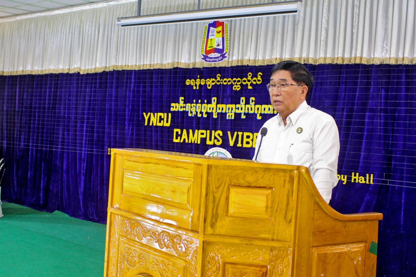 အခမ်းအနားကို ရေနံချောင်းတက္ကသိုလ် ကျောင်းသား၊ ကျောင်းသူများက YNCU Campus Vibes Theme Song ဖြင့် သီဆိုဖွင့်လှစ်သည်။ ရှေးဦးစွာ တိုင်းဒေသကြီးဝန်ကြီးချုပ် ဦးတင့်လွင်က Campus Vibes ဆိုတာ တက္ကသိုလ်အသက်ဝင်လှုပ်ရှားနေတဲ့ ပတ်ဝန်းကျင်၊ အရိပ်၊ အငွေ့ အသက်နဲ့ ယဉ်ကျေးမှုအစုအဝေးကို ဖော်ပြတဲ့ စကားစုတစ်ခုဖြစ်ပါကြောင်း၊ မောင်တို့ မယ်တို့အနေဖြင့် သင်ယူသော အသိပညာများကို စာမေးပွဲအောင်ရန်အတွက်သာမဟုတ်ဘဲ လူ့အသိုက်အဝန်းအတွက် အကျိုးပြုနိုင်ရန် လက်တွေ့အသုံချစေလိုကြောင်းနှင့် ဖွံ့ဖြိုးတိုးတက်နေသော နည်းပညာနှင့်အတူ တစ်သက်တာသင်ယူမှုများကို ပြုလုပ်ကြရမည်ဖြစ်ကြောင်း စသည်ဖြင့် အမှာစကားပြောကြားသည်။