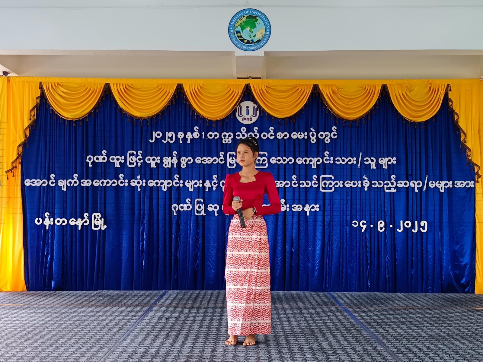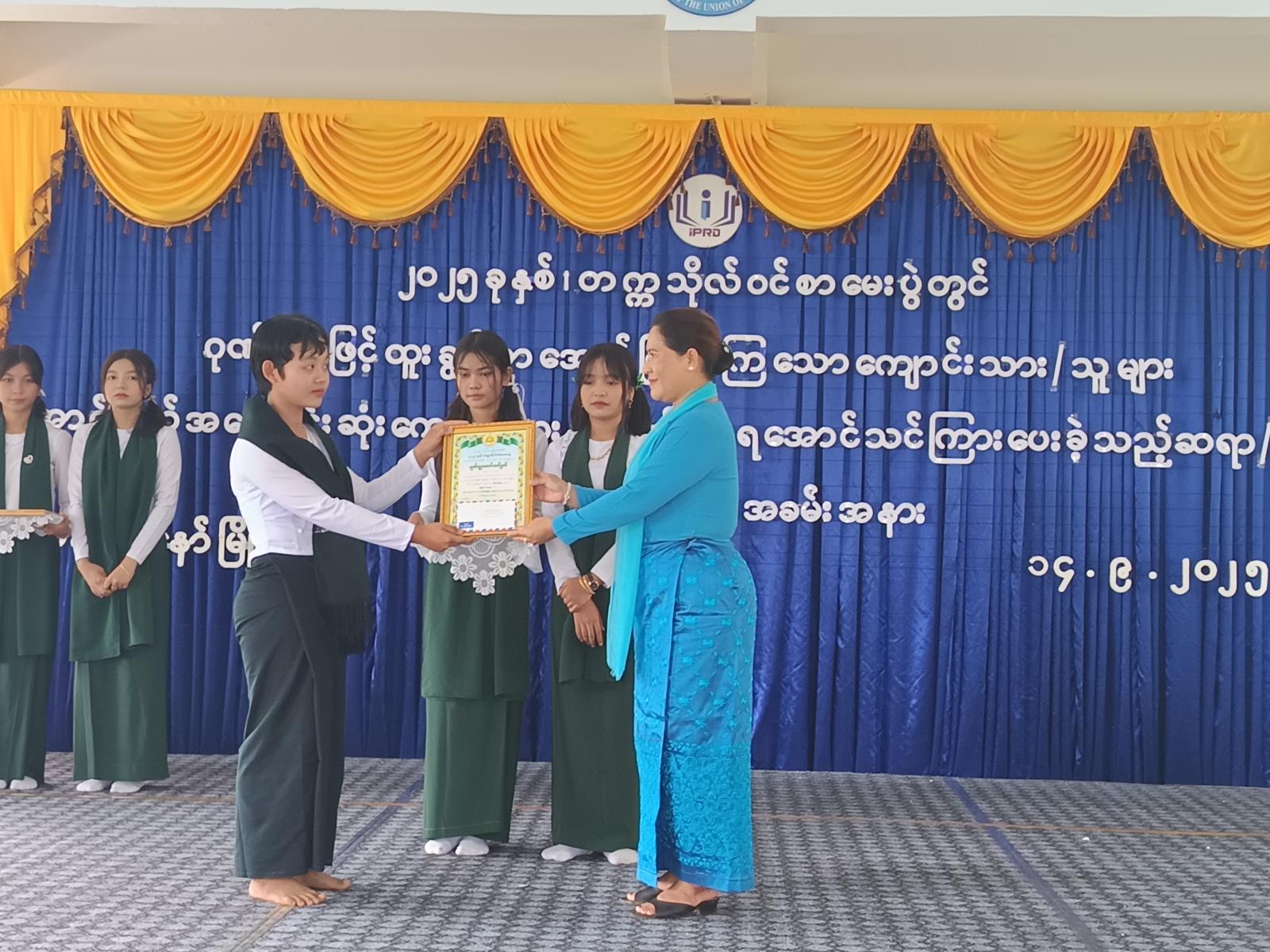 ဆက်လက်၍ ထူးချွန်ဆုရ ကျောင်းသား/သူများကိုယ်စား နိုင်ငံအဆင့်(၉)၊ (၄)ဘာသာဂုဏ်ထူးရှင် အခြေခံပညာအထက်တန်း ကျောင်း(ခွဲ) ဘုရားကုန်းမှ မအေးအေးသီက ကြိုးစားအားထုတ်ဆောင်ရွက်ခဲ့မှုနှင့် ပတ်သက်၍ ကျေးဇူးတင်စကားပြောကြားခဲ့သည်။