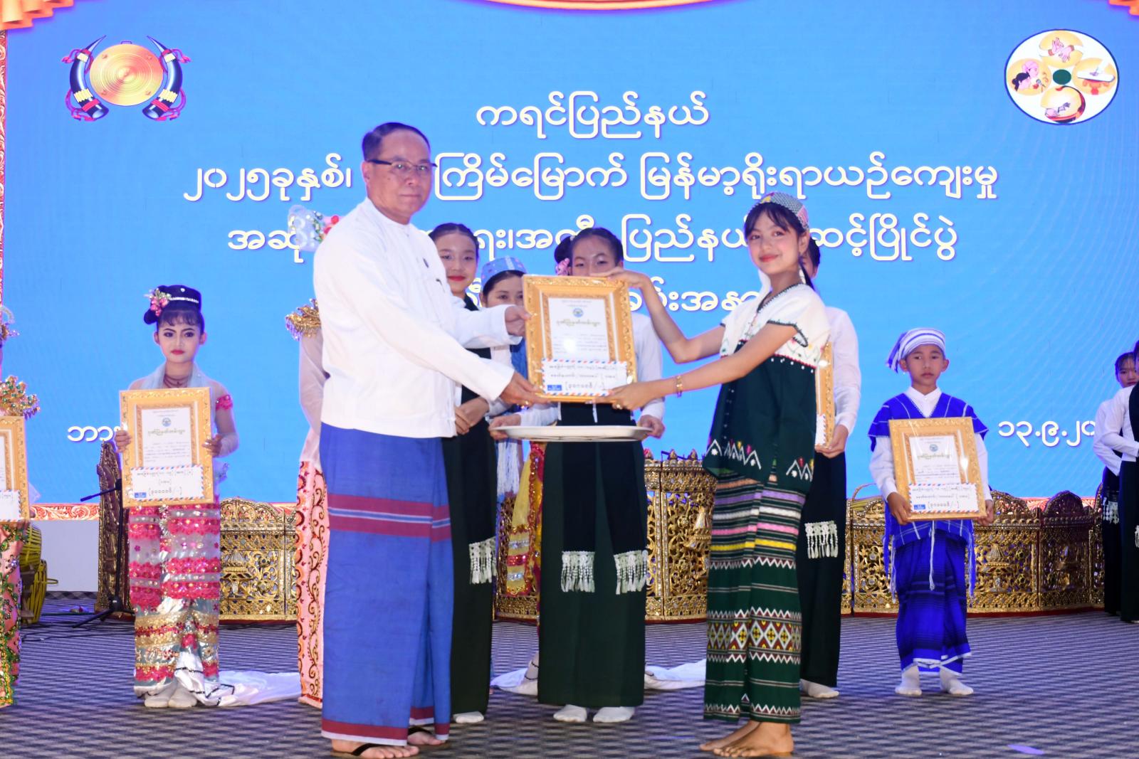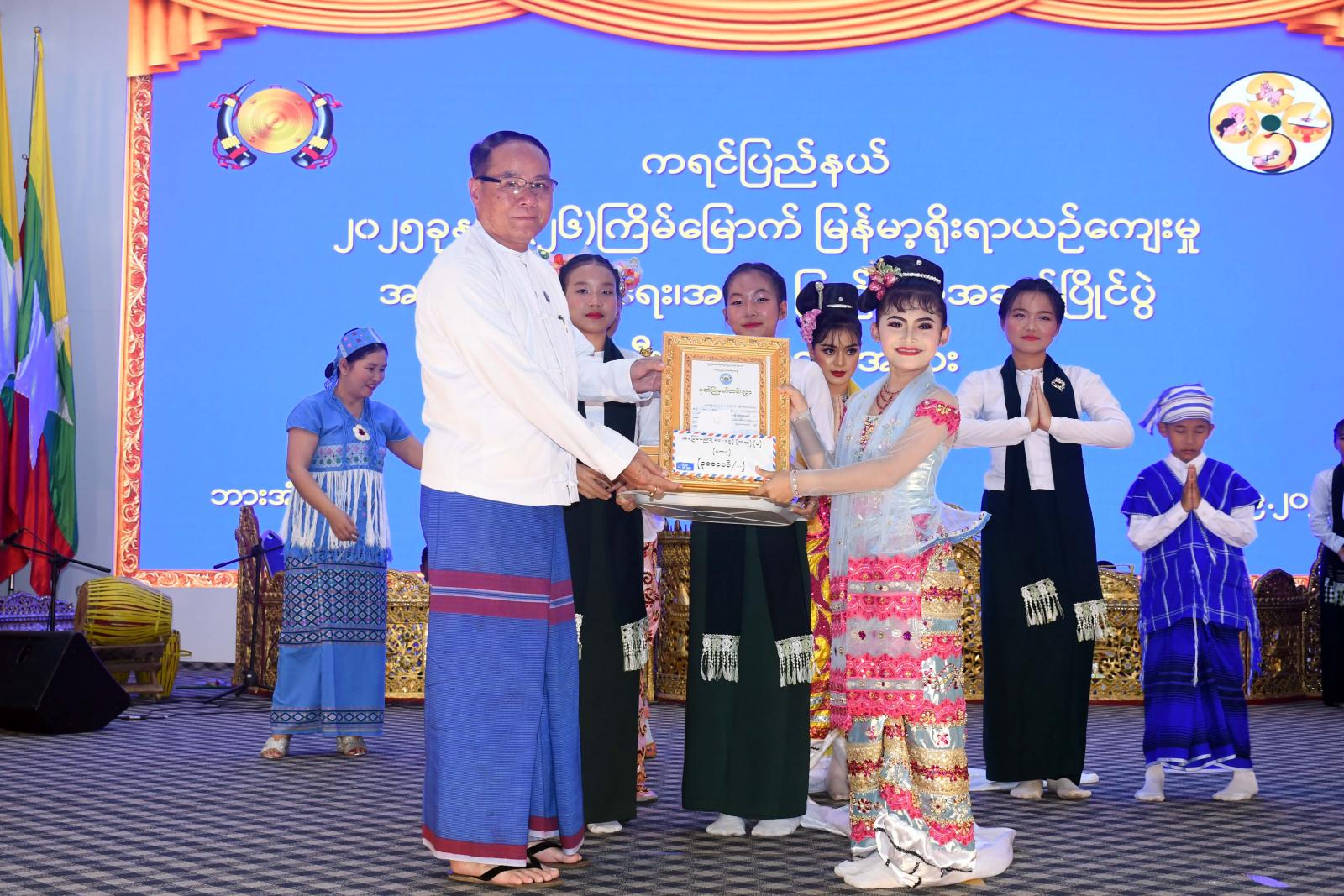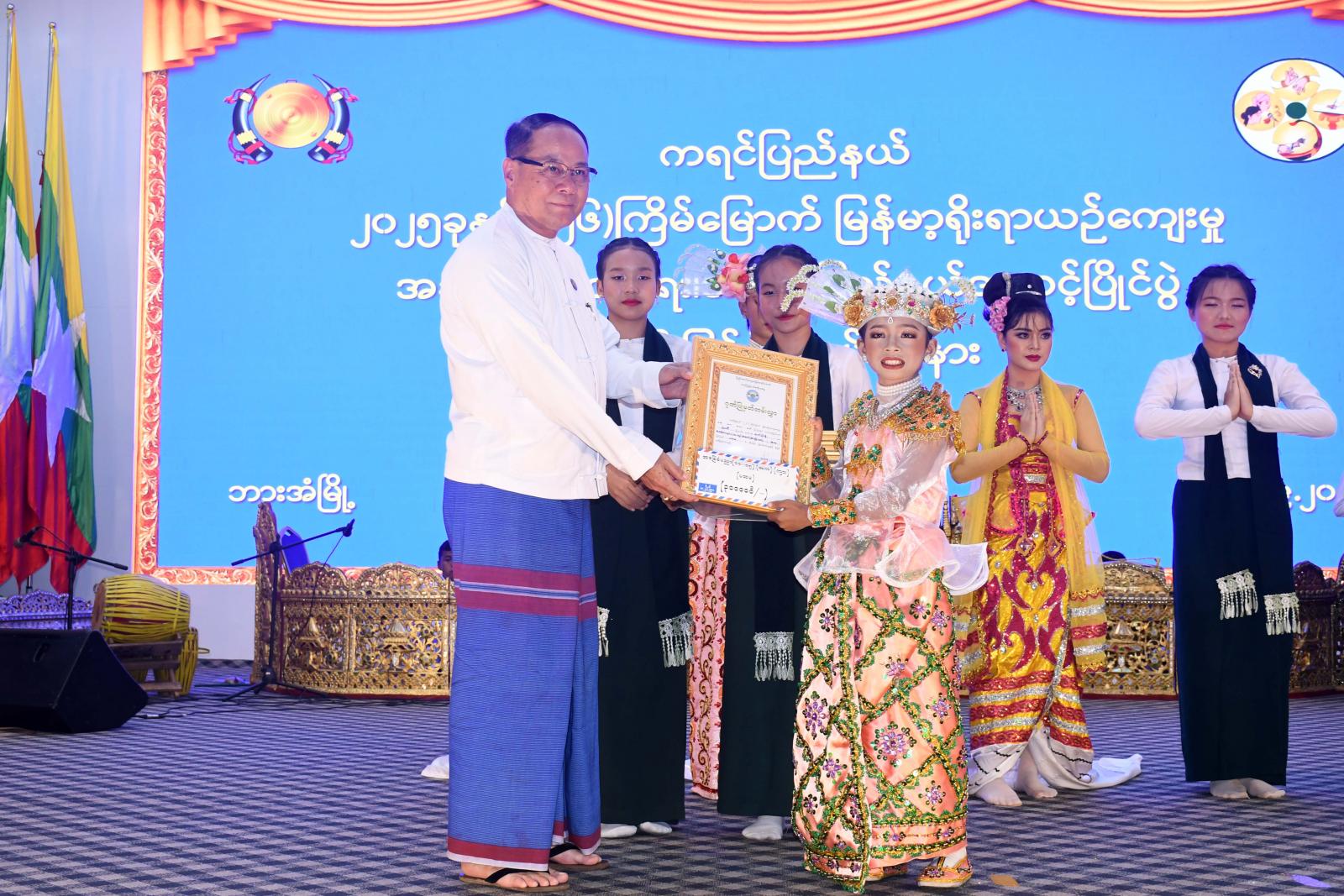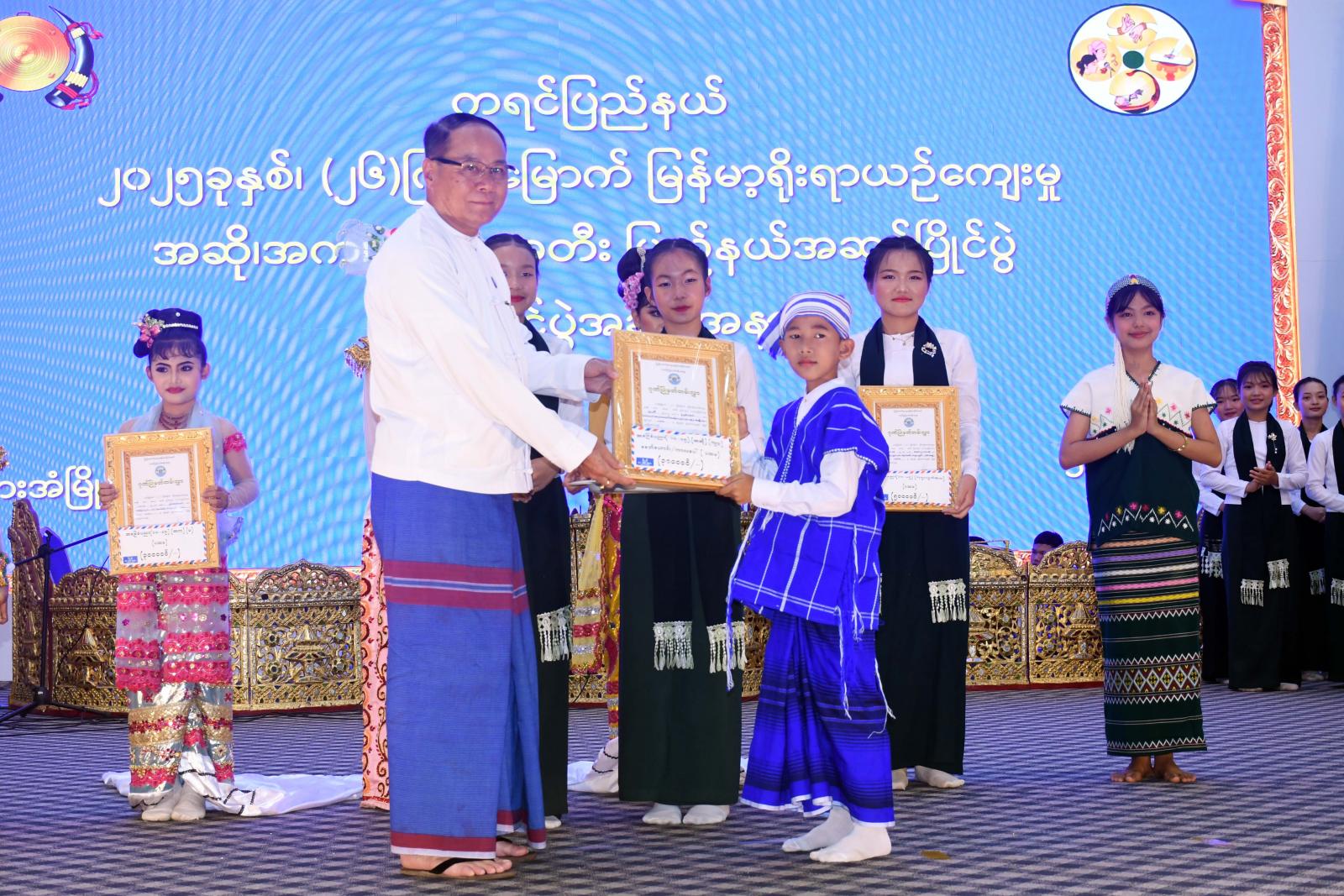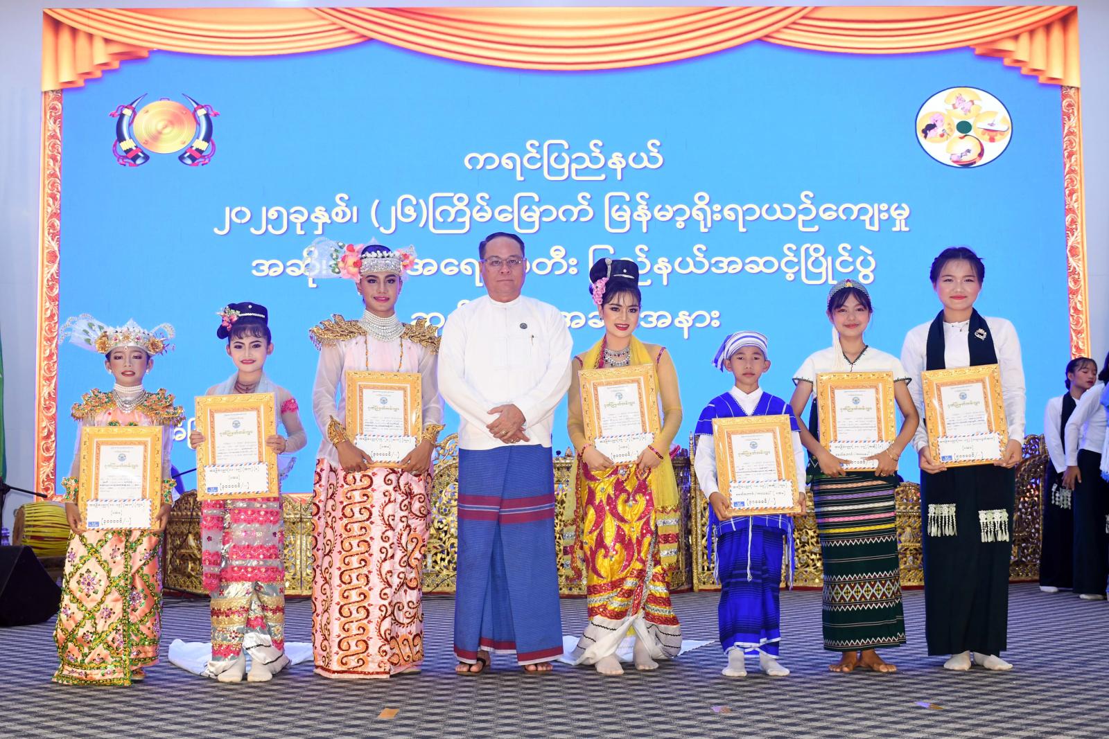 ဦးစွာ ကရင်ပြည်နယ်ဝန်ကြီးချုပ်ဦးစောမြင့်ဦး၊ ပြည်နယ်အမျိုးသမီးရေးရာအဖွဲ့နှင့် မိခင်နှင့်ကလေး စောင့်ရှောက်မှု ကြီးကြပ်ရေးအဖွဲ့နာယကဒေါ်နန်းဘေဘီမြင့်၊ ပြည်နယ်တရားလွှတ်တော် တရားသူကြီးချုပ် ဦးညွန့်လင်း၊ ပြည်နယ်အစိုးရအဖွဲ့ဝင်များ၊ အမျိုးသမီးရေးရာအဖွဲ့နှင့် မိခင်နှင့်စောင့်ရှောက်မှုကြီးကြပ်အဖွဲ့ အဖွဲ့ဝင်များ၊ ပြည်နယ် အဆင့်ဌာနဆိုင်ရာတာဝန်ရှိသူများက အခြေခံပညာအသက်၁၀နှစ်မှ ၁၅ နှစ်ထိ အမျိုးသား၊ အမျိုးသမီး အကပြိုင်ပွဲ၊ အခြေခံပညာ အသက် ၁၅ နှစ်မှ ၂၀ နှစ်ထိ အမျိုးသား၊ အမျိုးသမီး အကပြိုင်ပွဲ၊ ခေတ်ဟောင်းတေး/ကာလပေါ် အခြေခံ ပညာ ၁၀ နှစ်မှ ၁၅ နှစ်ထိ အမျိုးသား၊ အမျိုးသမီး အဆိုပြိုင်ပွဲ၊ ၁၅ နှစ်မှ ၂၀ နှစ်ထိ အမျိုးသား၊ အမျိုးသမီးအဆိုပြိုင်ပွဲ၊ မဟာဂီတအခြေခံပညာ ၁၀ နှစ်မှ ၁၅ နှစ်ထိ အမျိုးသား၊အမျိုးသမီးအဆို ပြိုင်ပွဲ၊ ၁၅ နှစ်မှ ၂၀ နှစ်ထိ အမျိုးသား၊ အမျိုးသမီးအဆိုပြိုင်ပွဲ၊ မဟာဂီတအဆင့်မြင့်ပညာအဆင့် အမျိုးသား၊အမျိုးသမီးပြိုင်ပွဲ၊ အခြေခံပညာ ၁၅ နှစ်မှ ၂၀ နှစ်ထိ အမျိုးသား အရေးပြိုင်ပွဲ၊ ကဗျာလွတ်အကပြိုင်ပွဲ၊ ဆိုင်းတစ်ဦးချင်းအတီးပြိုင်ပွဲတို့တွင် ပထမ၊ ဒုတိယ၊ တတိယ၊ အထူးဆုနှင့် နှစ်သိမ့်ဆုရရှိကြသူများအား ဂုဏ်ပြုဆုများပေးအပ်ချီးမြှင့်ကြပြီး ပြိုင်ပွဲကျင်းပရေးကော်မတီဥက္ကဋ္ဌ ပြည်နယ်တိုင်းရင်းသားရေးရာဝန်ကြီးဦးစန်းကိုက (၂၆)ကြိမ်မြောက် မြန်မာ့ရိုးရာယဉ်ကျေးမှု အဆို၊ အက၊ အရေး၊ အတီး ပြိုင်ပွဲ ဒိုင်အဖွဲ့နှင့်အတီး ပံ့ပိုးအဖွဲ့ဝင်များအား ဂုဏ်ပြုဆုငွေများပေးအပ်ချီးမြှင့်သည်။