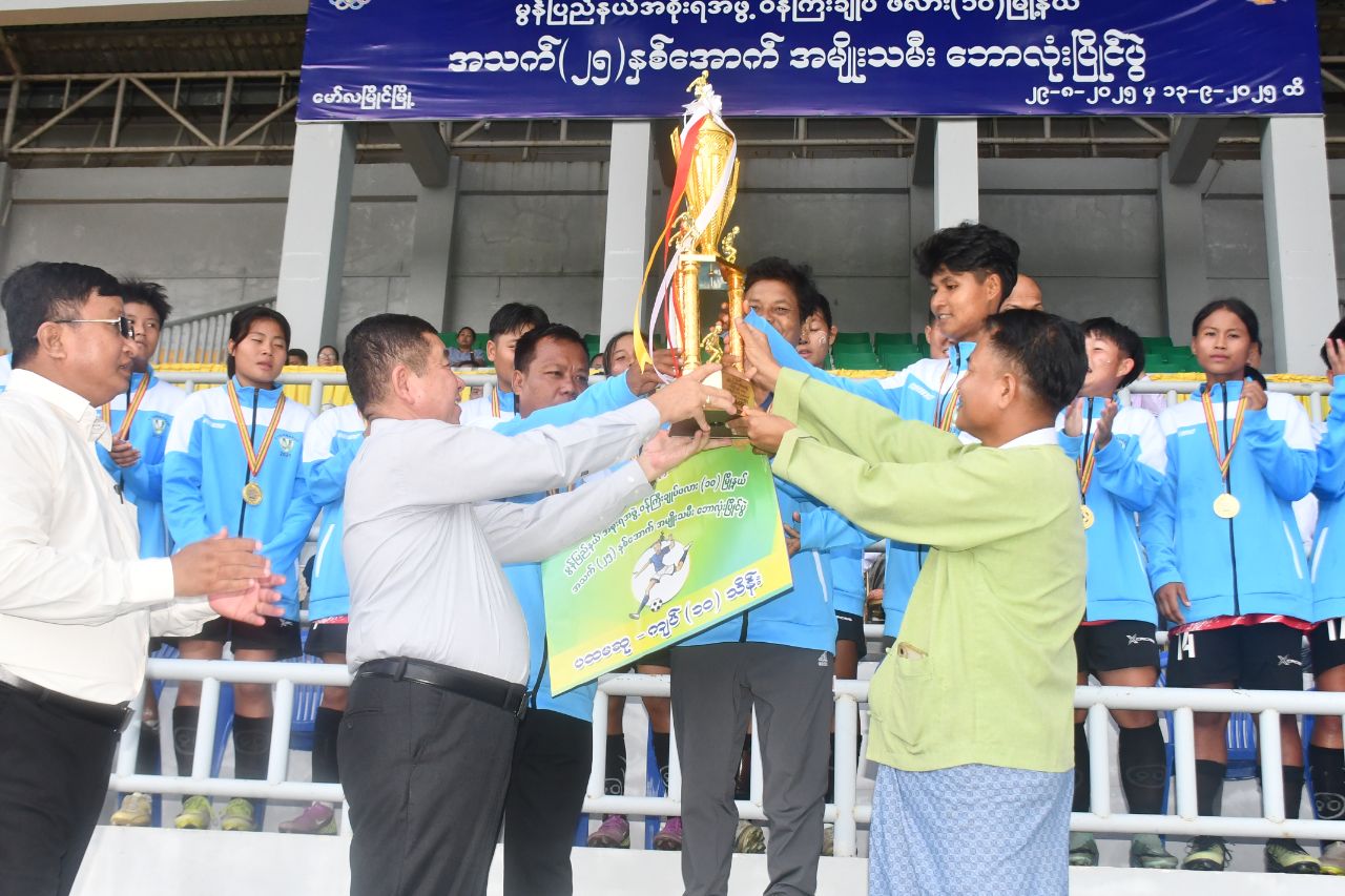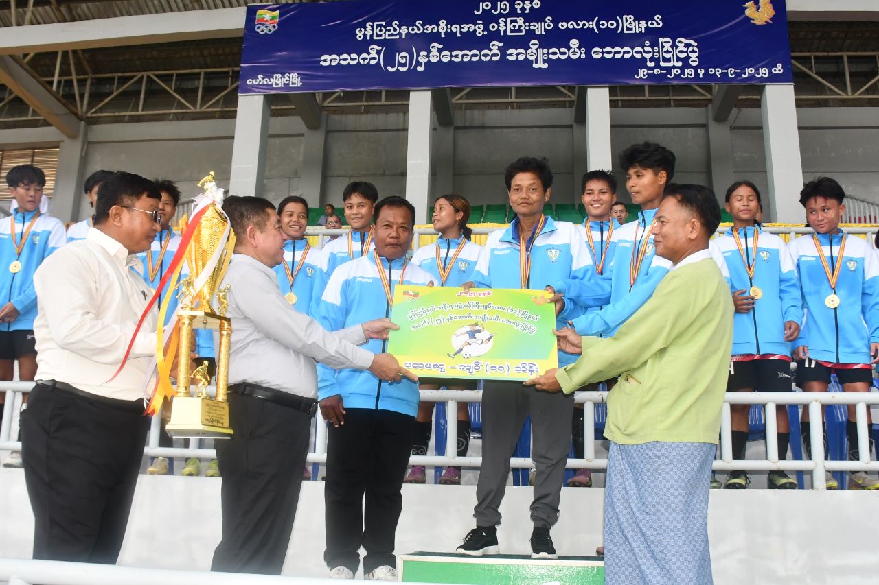 ယင်းနောက် ပြည်နယ်ဝန်ကြီးချုပ်က မွန်ပြည်နယ်အစိုးရအဖွဲ့ ဝန်ကြီးချုပ်ဖလား (၁၀) မြို့နယ်၊ အသက် (၂၅) နှစ်အောက် အမျိုးသမီး ဘောလုံးပြိုင်ပွဲတွင် ပထမဆုရရှိသည့် ကျိုက်မရောမြို့နယ် ဘောလုံးအသင်းအား တစ်ဦးချင်းဆုတံဆိပ်များ၊ ငွေသားဆုများနှင့် တံခွန်စိုက်ဒိုင်းဆုအား ပေးအပ်ချီးမြှင့်ခဲ့ကြောင်း သိရသည်။