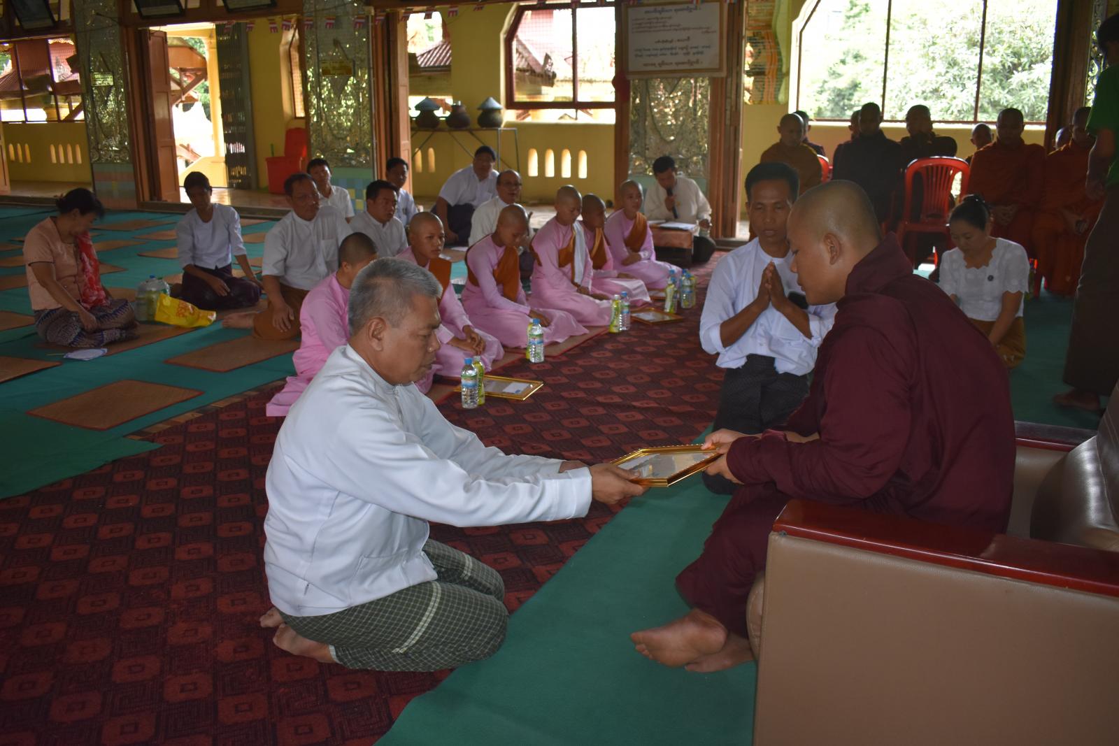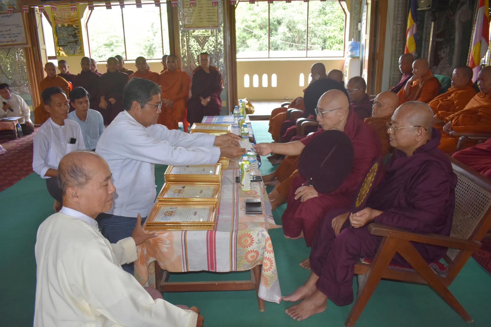 ထို့နောက် ခရိုင်စီမံခန့်ခွဲရေးနှင့်အုပ်ချုပ်ရေးကော်မတီအဖွဲ့ဝင် ဦးအေးမင်းထွန်းက သာသနာရေးဆိုင်ရာများကို လျှောက်ထားပြီး ခရိုင်စီမံခန့်ခွဲရေးနှင့်အုပ်ချုပ်ရေးကော်မတီအဖွဲ့ဝင်များ၊ မြို့နယ်စီမံခန့်ခွဲရေးနှင့် အုပ်ချုပ်ရေးကော်မတီအဖွဲ့ဝင်များ၊ သာသနာရေးဦးစီးမှူးနှင့် ဌာနဆိုင်ရာတာဝန်ရှိသူများ၊ မြို့နယ်သံဃာနာယကဥက္ကဋ္ဌနှင့် အဖွဲ့ဝင်များ၊ အလှူရှင်များက ဝိနယာဓိကမာမကစာမေးပွဲ ဖြေဆိုအောင်မြင်သည့် ပထမကြီးတန်း(၂)ပါး၊ ပထမလတ်တန်း(၃)ပါး၊ ပထမငယ်တန်း(၅)ပါး၊ အခြေပြုမူလတန်း(၇)ပါး၊ သာမဏေတန်း(၁၇)ပါး စုစုပေါင်း(၃၄)ပါးအား အောင်လက်မှတ်နှင့် အောင်ဆုအလှူငွေများ အသီးသီးဆက်ကပ်ခြင်းများ ဆောင်ရွက်ခဲ့ပြီး ယင်းတို့ထဲမှ ဂုဏ်ထူးရရှိသူ(၁၄)ပါးအား အောင်ဆုများ ထပ်မံပေးအပ်ချီးမြှင့်ခဲ့ကြောင်း သိရသည်။