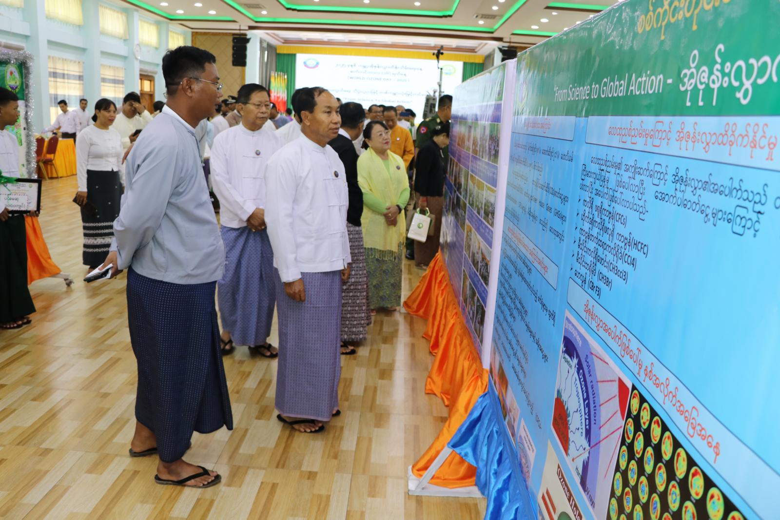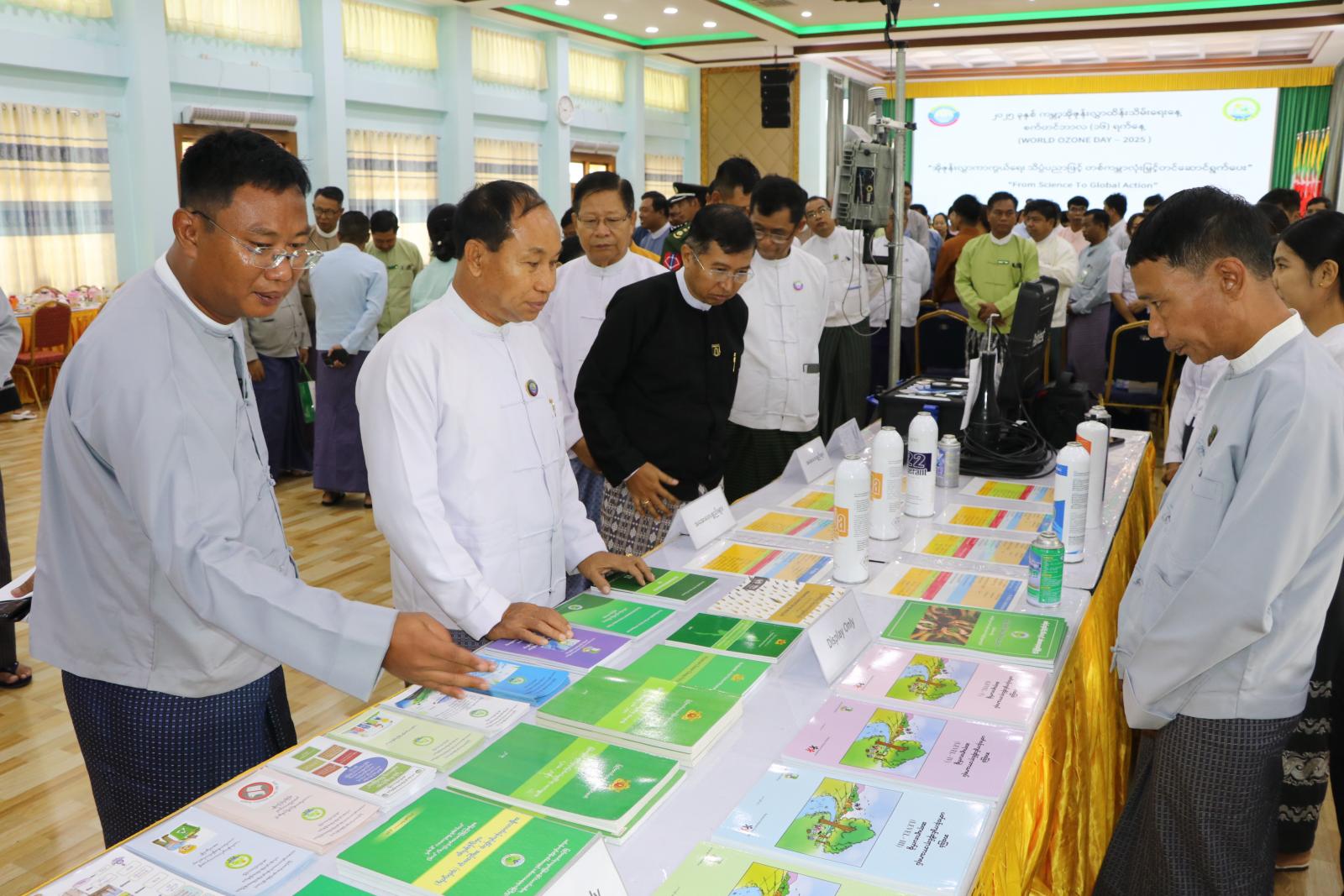 ဆက်လက်၍ တိုင်းဒေသကြီး ဝန်ကြီးချုပ်နှင့် တာဝန်ရှိသူများက ဆုရကျောင်းသား /သူများအတူ စုပေါင်းမှတ်တမ်းတင် ဓါတ်ပုံရိုက်ကူးကာ ခန်းမအတွင်းခင်းကျင်းပြသထား သော လေ၊ ရေ၊ မြေ တိုင်းတာရေးစက်ကိရိယာများ၊ အအေးပေးပစ္စည်းများ၊ ပတ်ဝန်းကျင် ထိန်းသိမ်းရေးအသိပညာပေး စာအုပ်များနှင့်လက်ကမ်းစာစောင်များ၊ ၂၀၂၅-ခုနှစ်၊ ကမ္ဘာ့ အိုဇုန်းလွှာထိန်းသိမ်းရေးနေ့ အထိမ်းအမှတ် အထက်တန်း၊ အလယ်တန်း၊ မူလတန်းအဆင့် ပန်းချီပြိုင်ပွဲတွင် ပထမ၊ ဒုတိယ၊ တတိယဆုရရှိကြသော ပန်းချီများအား လိုက်လံကြည့်ရှုအားပေးခဲ့ကြောင်း သိရသည်။