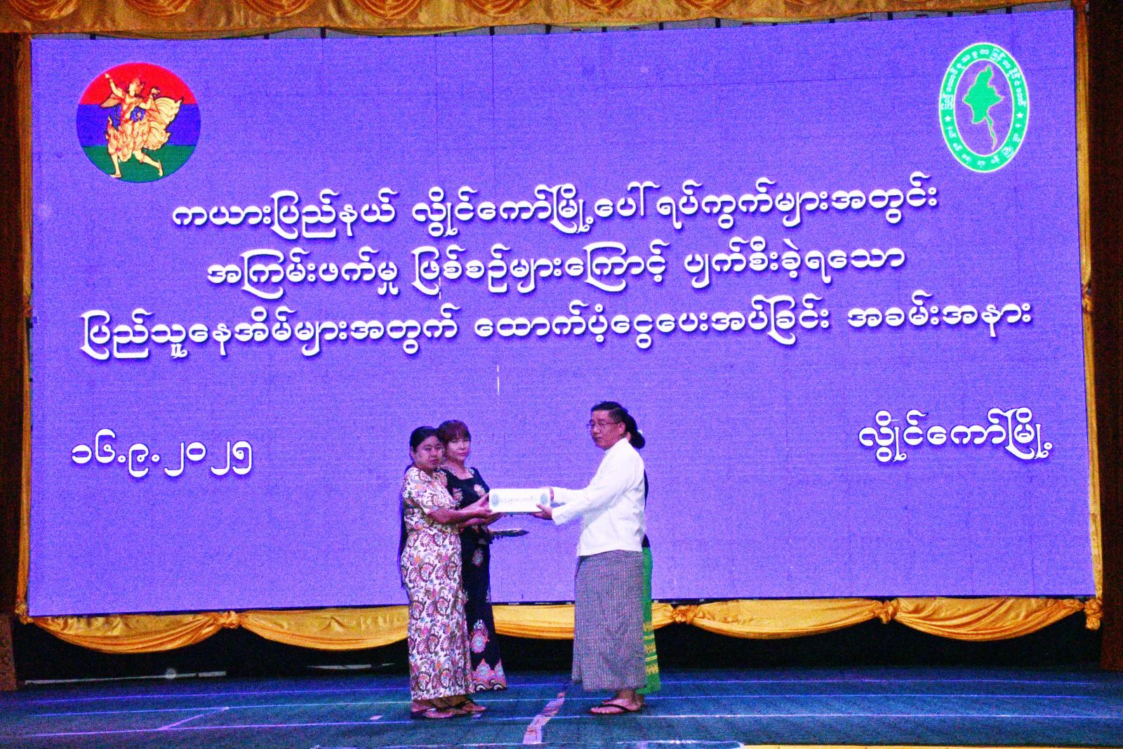 ယနေ့အခမ်းအနားတွင် လွိုင်ကော်မြို့ပေါ် ရပ်ကွက်များတွင်အကြမ်းဖက်ဖြစ်စဉ်များကြောင့်အလုံးစုံ ပျက်စီးနေအိမ် ၄၃၃ လုံးနှင့် တစ်စိတ်တစ်ပိုင်းပျက်စီးနေအိမ် ၁၆၇ လုံး စုစုပေါင်း နေအိမ် ၆၀၀ လုံး အတွက် ငွေကျပ် ၂၆၆၆ သိန်း ထောက်ပံ့ပေးအပ်ခဲ့ကြောင်း သိရသည်။