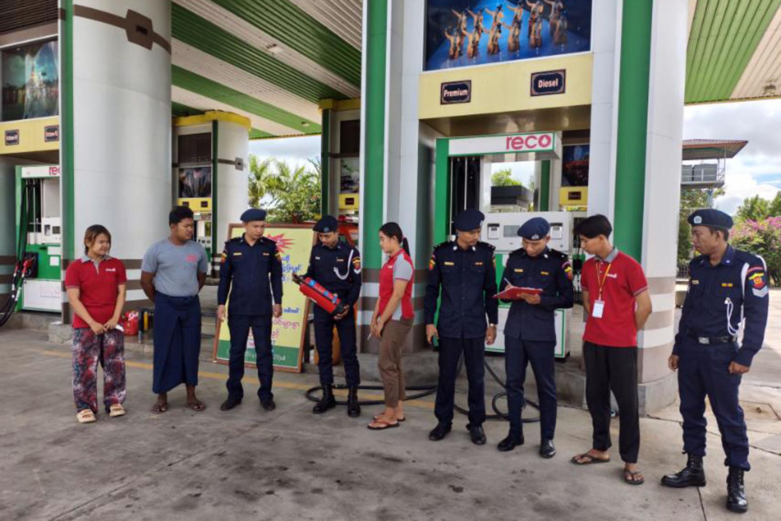 ထိုသို့ ကွင်းဆင်းစစ်ဆေးရာတွင် မြို့နယ်မီးသတ်ဦးစီးဌာန၊ ဒုတိယဦးစီးမှူး ဦးနေဖြိုးဝင်းနှင့် တပ်ဖွဲ့ဝင်များက မီးဘေးအန္တရာယ်ကြိုတင်ကာကွယ်နိုင်ရေးအတွက် မီးသတ်ပစ္စည်းများဖြစ်သည့် မီးချိတ်/မီးကပ်၊ သဲ၊ မီးသတ်ဆေးဘူး၊ အပေါ့စားမီးသတ်စက်၊ ပိုက်လိပ်၊ ပိုက်ခေါင်း၊ အမြှပ်ဆေးရည်၊ မီးသတ်ရေကန်များအား အသင့်အသုံးပြုနိုင်ရေးစစ်ဆေးခြင်းနှင့် စက်သုံးဆီအရောင်းဆိုင်ရှိ ဝန်ထမ်းများအား မီးဘေးအန္တရာယ်ကြိုတင်ကာကွယ်နိုင်ရေး အသိပညာပေးပြောကြားခဲ့ကြောင်း သိရသည်။