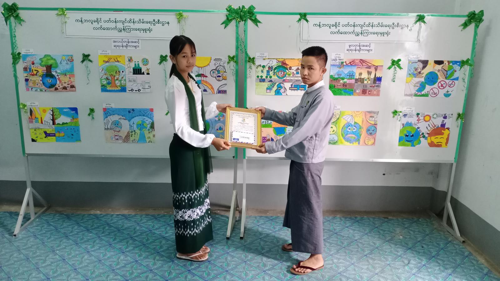 ထို့နောက် ဆုချီးမြှင့်ပွဲကျင်းပရာ ခရိုင်ပတ်ဝန်းကျင်ထိန်းသိမ်းရေးဦးစီးဌာနတာဝန်ခံ ဦးညီညီစိုးက အလယ်တန်းဆင့် ပထမ၊ ဒုတိယ၊ တတိယနှင့် နှစ်သိမ့်ဆု (၁/၂/၃) ဆု၊ မြို့နယ်ပညာရေးမှူး ဒေါ်အေးအေးစိုးက မူလတန်းဆင့် ပထမ၊ ဒုတိယ၊ တတိယနှင့် နှစ်သိမ့်ဆု (၁/၂/၃) ဆုရ ကျောင်းသား၊ ကျောင်းသူများကို ဆုများအသီးသီး ချီးမြှင့်ပေးအပ်ခဲ့ကြောင်း သိရသည်။