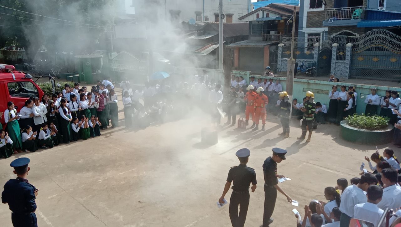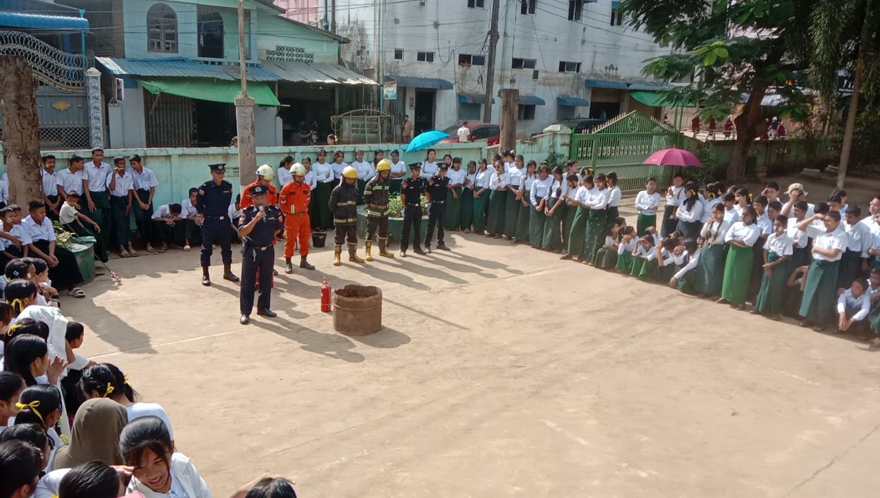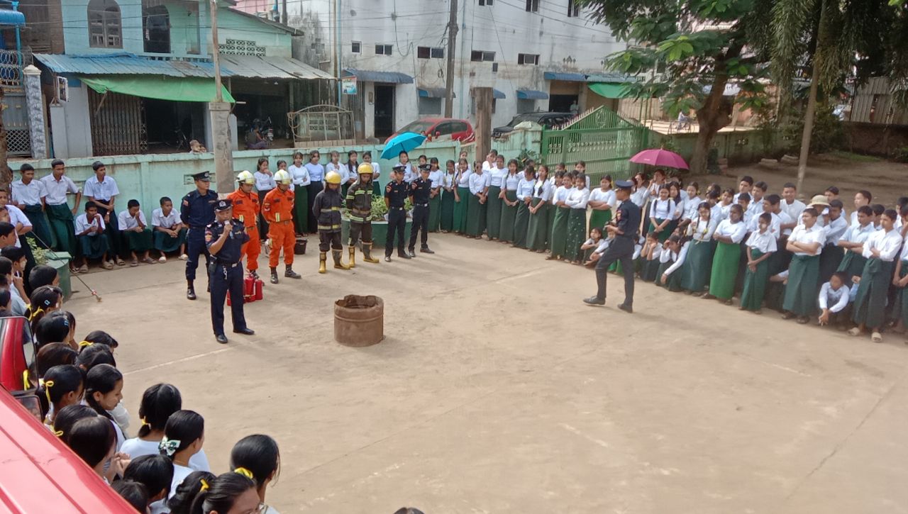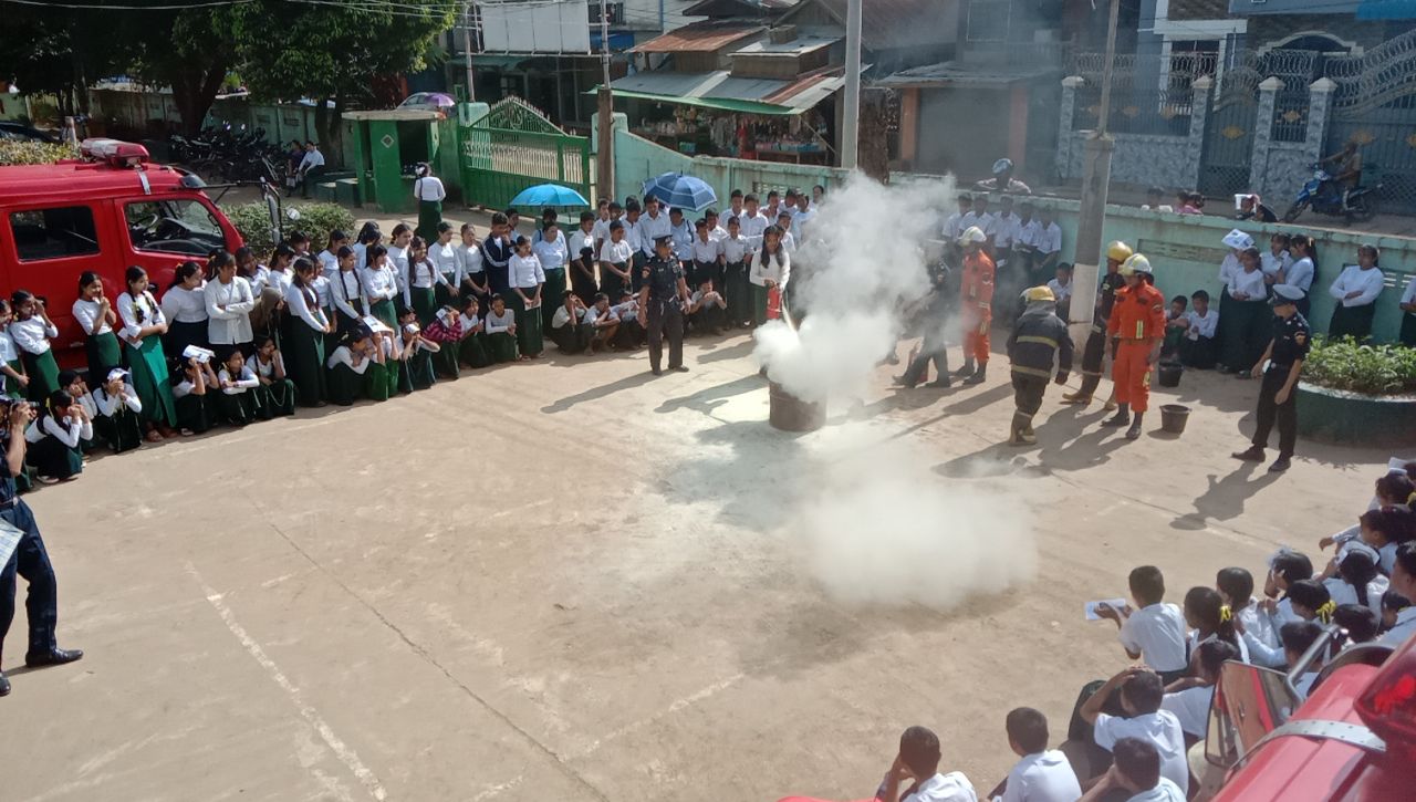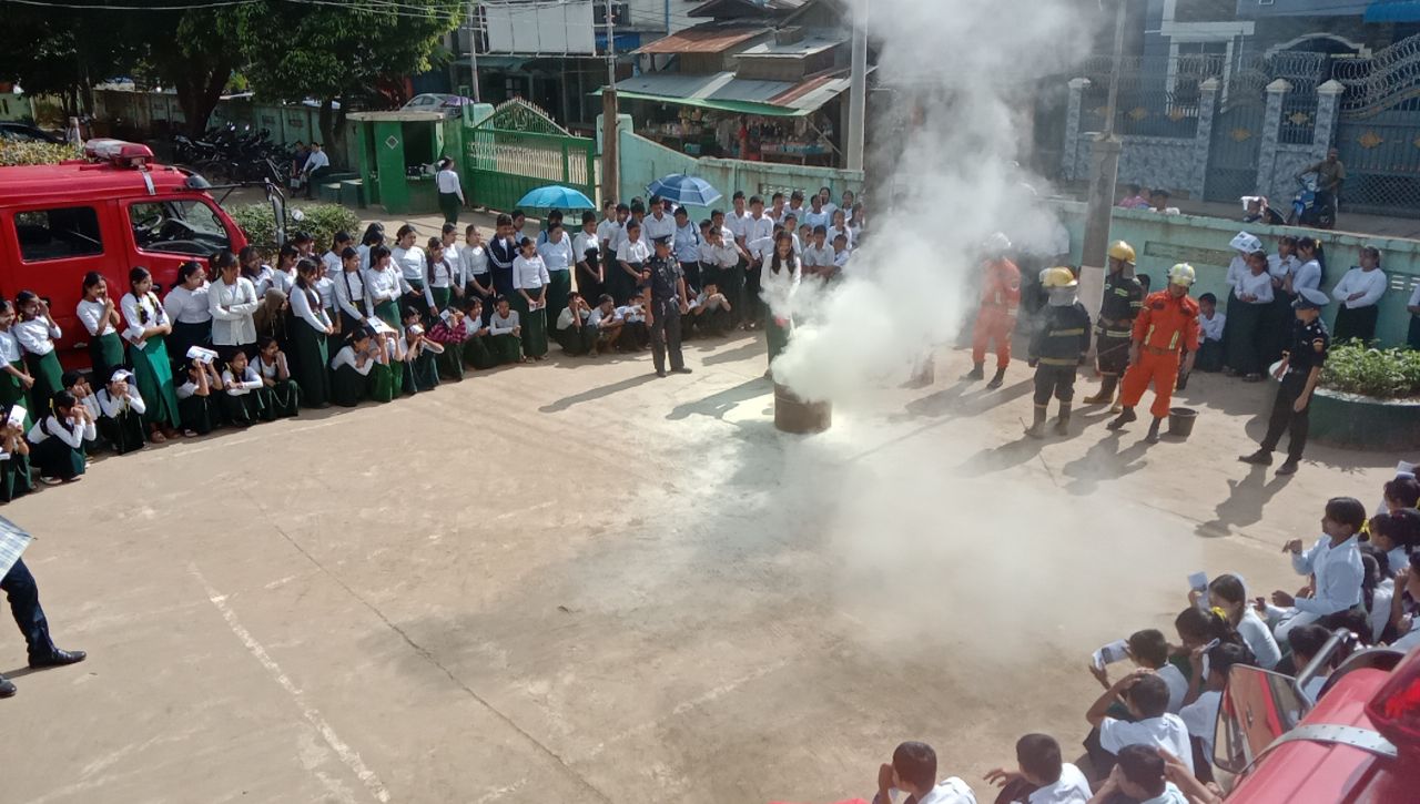 ရှေးဦးစွာ မြဝတီခရိုင် မီးသတ်ဦးစီးဌာနမှူး ဦးဖြိုးမင်းဇော်က ဆရာ၊ဆရာမများ၊ ကျောင်းသား၊ ကျောင်းသူများကို မီးဘေးအန္တရာယ်မဖြစ်ပေါ်စေရန် သိရှိလိုက်နာရမည့်အချက်များ၊ ကြိုတင်ကာကွယ်ရမည့်အချက်များ၊ မီးဘေးအန္တရာယ်ဖြစ်ပေါ်လာပါက အရေးပေါ်အချက် ပေးခြင်းနှင့် မီးငြှိမ်းသတ်ခြင်းဆိုင်ရာများအား အသိပညာပေး ရှင်းလင်းပြောကြားပေးပြီး မီးသတ်တပ်ဖွဲ့ဝင်များက မီးသတ်ဆေးဘူး စနစ်တကျကိုင်တွယ်အသုံးပြုတက်စေရန်သရုပ်ပြသပေးကာ မီးဘေးနှင့်ကြုံတွေ့သည့်အခါ ဆောင်ရွက်ရမည့် ဇာတ်တိုက်လေ့ကျင့်မှုများကို လက်တွေ့သရုပ်ပြ ဆောင်ရွက်ခဲ့ကြကာ မီးဘေးအန္တရာယ် အသိပညာပေးလက်ကမ်းစာစောင်များအား ဖြန့်ဝေခဲ့ကြသည်။
