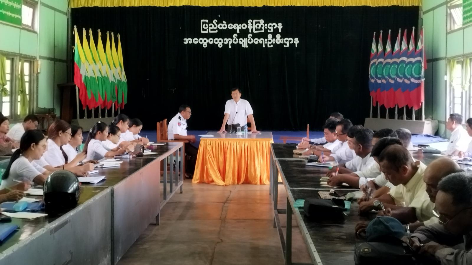 ရှေးဦးစွာ မြို့နယ်စီမံခန့်ခွဲရေးနှင့်အုပ်ချုပ်ရေးကော်မတီဥက္ကဋ္ဌ ဦးအောင်ကျော်ဇေယျက အဖွင့်အမှာစကားပြောကြားရာတွင် ဝန်ထမ်းပေါင်းစုံ စုပေါင်းဘုံကထိန်အလှူပွဲနှင့် ဆွမ်းဆန်စိမ်း လာင်းလှူပွဲ၊ စွယ်တော်တိုက်ဖွင့်ပွဲ လှည့်လည်အပူဇော်ခံရေးကိစ္စ လမ်းညွှန်ပြောကြားပြီး ရွေးကောက်ပွဲဆိုင်ရာ လုပ်ငန်းများ ပူးပေါင်းညှိနှိုင်းလုပ်ကိုင်ကြရန် လုံခြုံရေးဆိုင်ရာကိစ္စများ အထူးဂရုပြုနထိုင်သွားလာကြရန် လမ်းညွှန်မှာကြားခဲ့သည်။