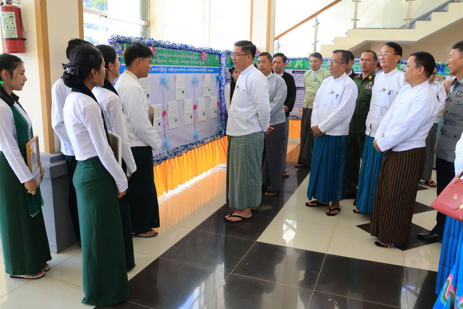 ထို့နောက် ပြည်နယ်ပတ်ဝန်းကျင်ထိန်းသိမ်းရေးဦးစီးဌာနက ခင်းကျင်းပြသထားသည့် ပြခန်းငယ်နှင့် ဆုရရရှိသည့် ဆောင်းပါးနှင့် စာစီစာကုံးလက်ရာများကို ကြည့်ရှုအားပေးကာ ကျောင်းသား၊ ကျောင်းသူများအား ရင်းရင်းနှီးနှီးနှုတ်ဆက်စကားပြောကြားခဲ့ကြောင်း သိရသည်။