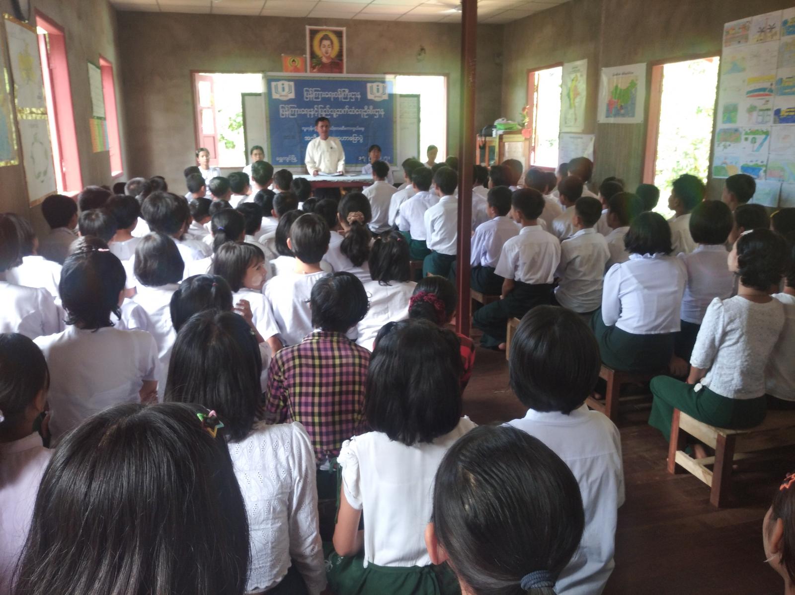 ရှေးဦးစွာဟောပြောပွဲတွင် ကျောင်းအုပ်ဆရာမကြီး ဒေါ်မြင့်မြင့်ခိုင်က အဖွင့်အမှာစကား ပြောကြားပြီး ရွှေကျင်မြို့နယ် ပြန်ကြားရေးနှင့်ပြည်သူ့ဆက်ဆံရေးဦးစီးဌာနမှ မြို့နယ် ဒုတိယဦးစီးမှူး ဦးမျိုးငြိမ်းကလူကုန်ကူးမှုခံရသူများနှင့်ပတ်သက်၍ လူကုန်ကူးမှုဖြစ်ပွားစေသော အဓိကအကြောင်းများ၊ လူကုန်ကူးသူများ အသုံးပြုသည့်နည်းလမ်းများ၊ လူကုန်ကူးခံရမှု ဖြစ်စဉ်များ၊ လူကုန်ကူးမှုခံရသူများ၏ ခံစားရသည့်ဒုက္ခများစသည့် အကြောင်းအရာများကို ဟောပြောခဲ့သည်။