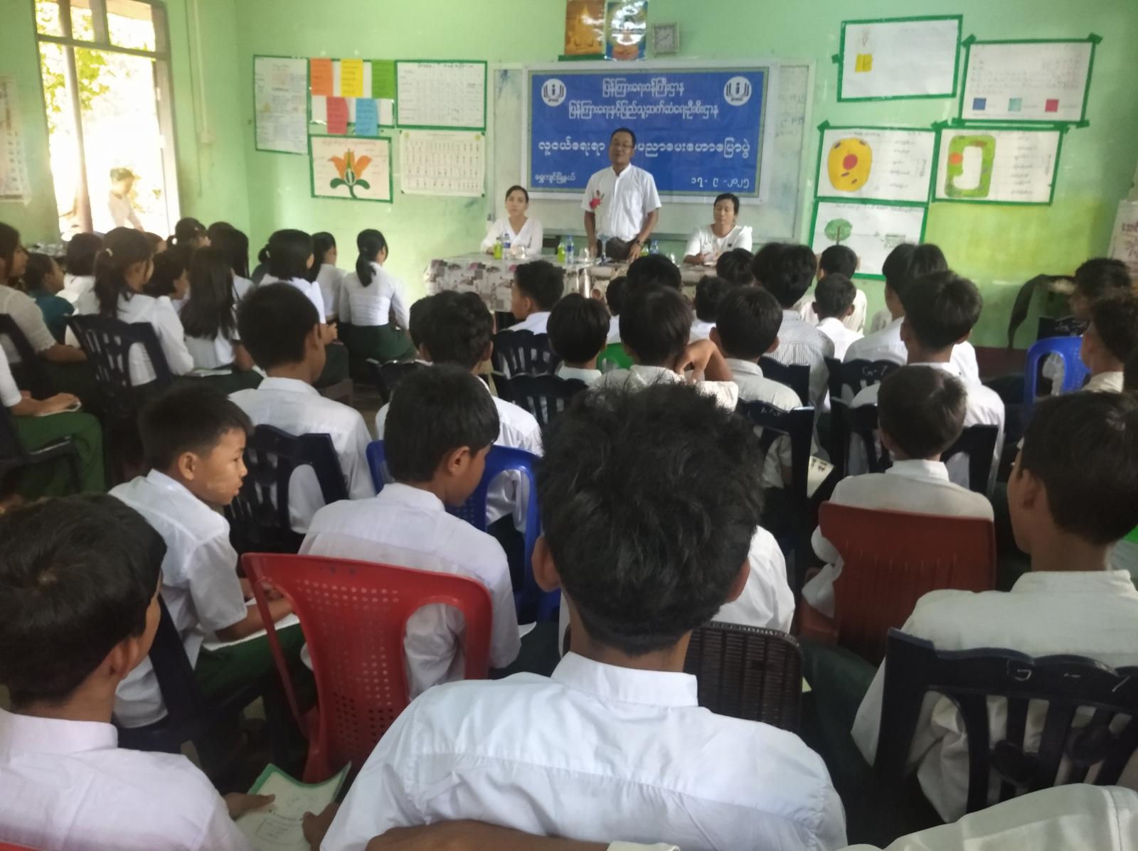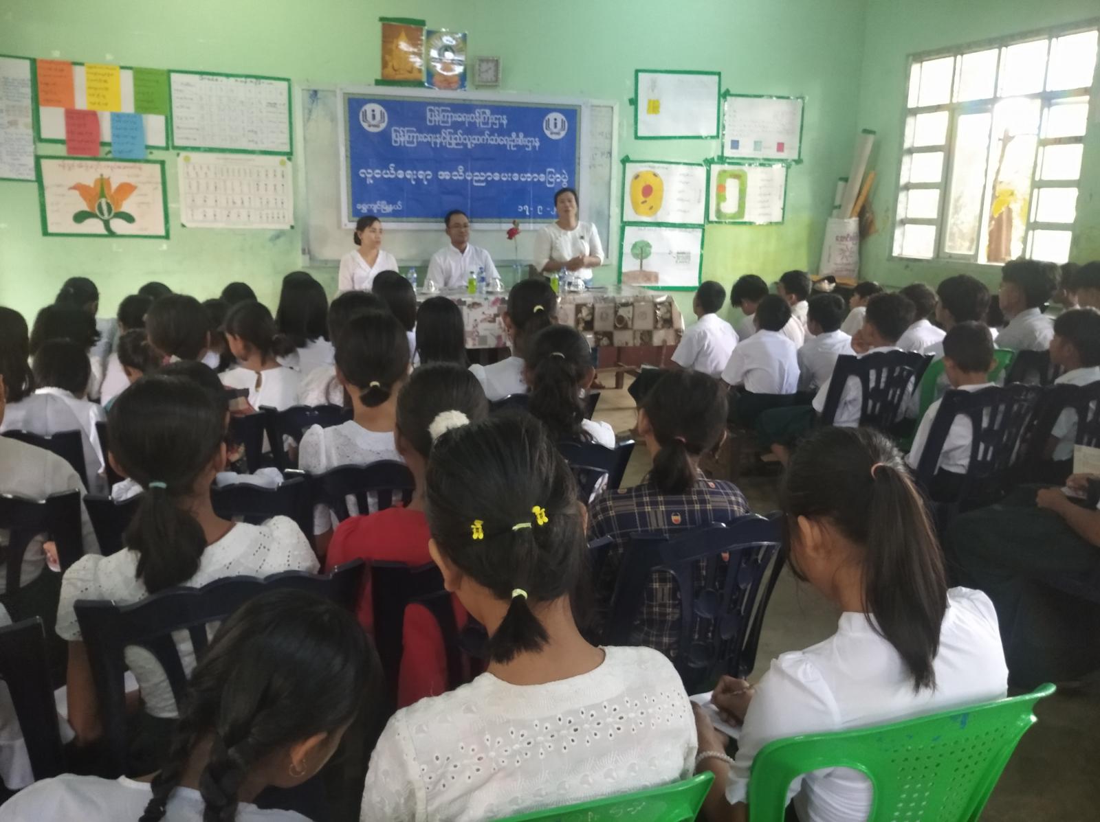 ရှေးဦးစွာ ကျောင်းအုပ်ဆရာကြီး ဦးငြိမ်းသူအောင်က အဖွင့်အမှာစကားပြောကြားပြီး ရွှေကျင်မြို့နယ် ပြန်ကြားရေးနှင့်ပြည်သူ့ဆက်ဆံရေးဦးစီးဌာနမှ ဒေါ်မို့မို့သွင် ရုပ်သံ (ကျွမ်းကျင်-၃)က လူကုန်ကူးမှုခံရသူများနှင့် ပတ်သက်၍ လူကုန်ကူးမှုဖြစ်ပွားစေသော အဓိကအကြောင်းများ၊ လူကုန်ကူးသူများ အသုံးပြုသည့် နည်းလမ်းများ၊ လူကုန်ကူးခံရမှုဖြစ်စဉ်များ၊ လူကုန်ကူးမှုခံရသူများ၏ ခံစားရသည့်ဒုက္ခများ စသည့်အကြောင်းအရာများကို ဟောပြောခဲ့သည်။