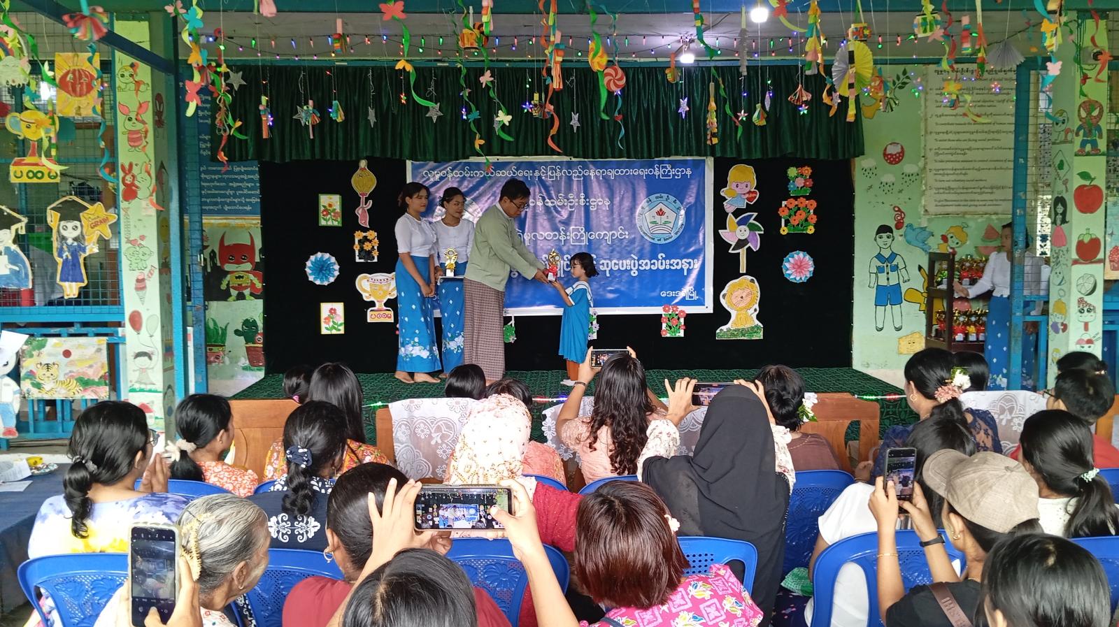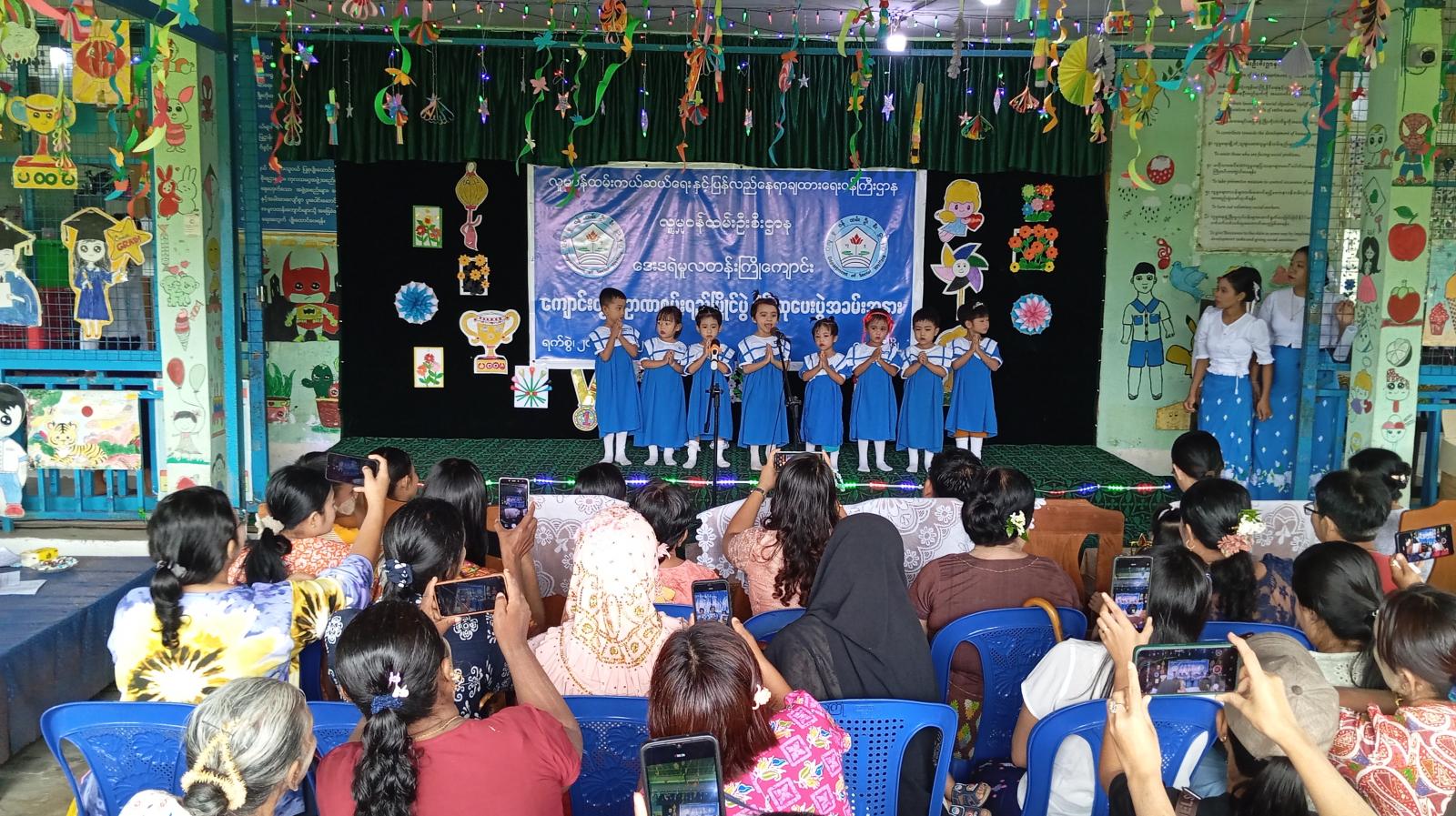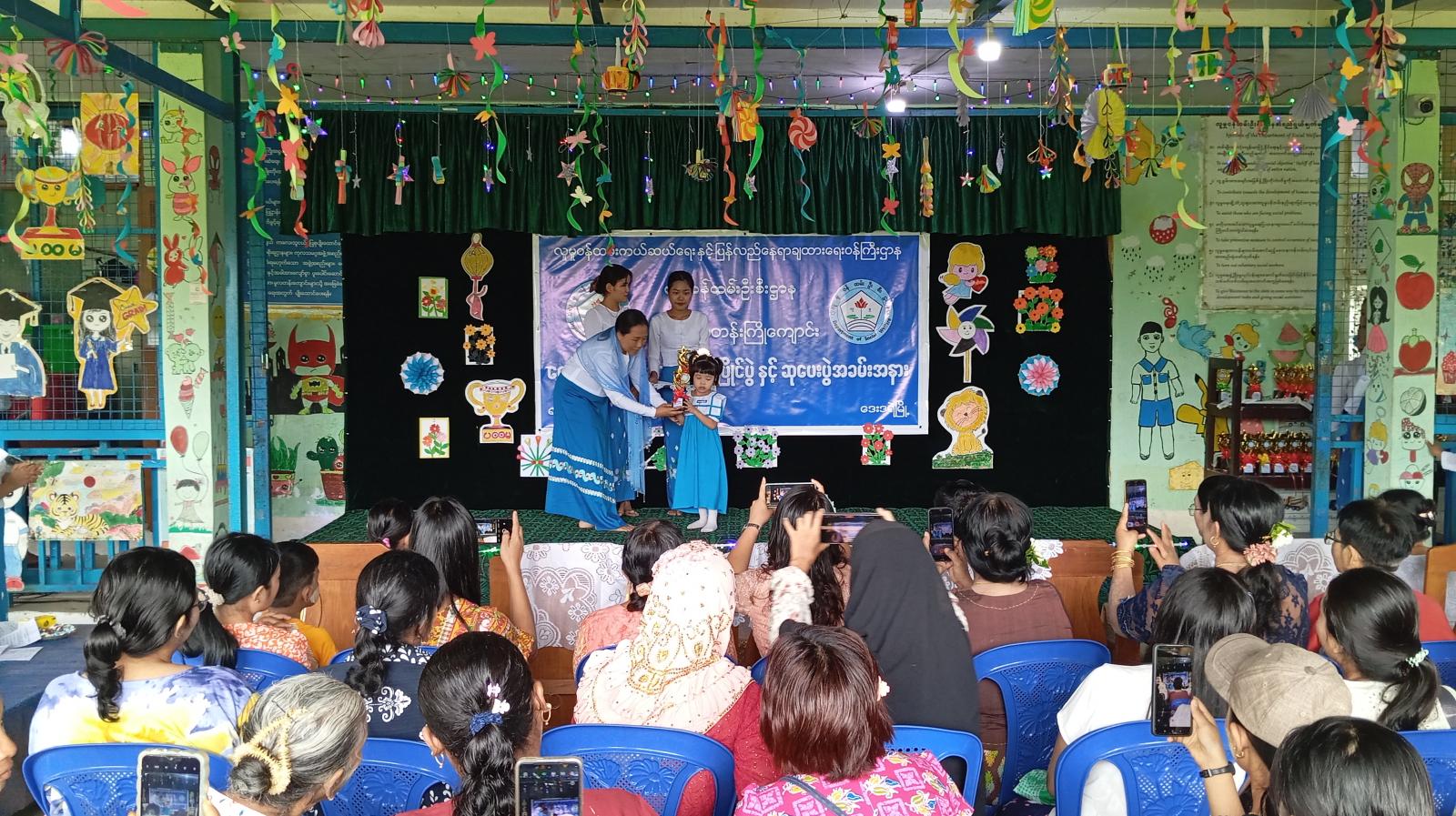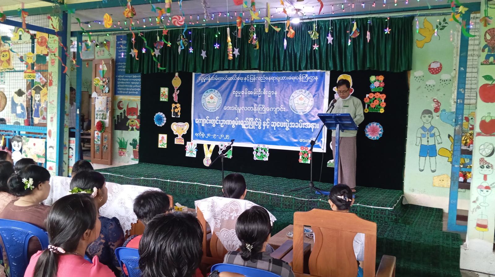 အခမ်းအနားတွင် မြို့နယ်စီမံခန့်ခွဲရေးနှင့်အုပ်ချုပ်ရေးကော်မတီဥက္ကဋ္ဌ ဦးမြသိန်းမောင်က ကလေးများ ကာယဉာဏဖွံ့ဖြိုးတိုးတက်စေရေးအတွက် သက်ဆိုင်ရာဌာနများ ပူးပေါင်းဆောင်ရွက်လျက်ရှိသည့်လုပ်ငန်းများ ရှင်းလင်းဟောပြောခဲ့သည်။