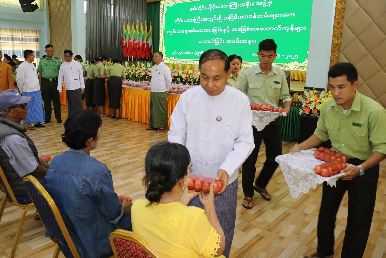 ဦးစွာ အခမ်းအနားသို့ တက်ရောက်လာကြသည့် အငြိမ်းစားဝန်ထမ်းများအား နံနက်စာကော်ဖီနှင့် မုန့်များဖြင့် ဧည့်ခံကျွေးမွေးခဲ့ကြပြီး တိုင်းဒေသကြီး ဝန်ကြီးချုပ်နှင့်ဇနီး၊ တိုင်းဒေသကြီးအစိုးရအဖွဲ့ဝင်များနှင့်ဇနီးများက တိုင်းဒေသကြီးအတွင်းရှိ ဌာနဆိုင်ရာအသီးသီးမှ အငြိမ်းစားဝန်ထမ်းများအား ရင်းရင်းနှီးနှီးလိုက်လံမိတ်ဆက်စကားများ ပြောကြားကာ တာဝန်ရှိသူများနှင့်အတူ အငြိမ်းစားဝန်ထမ်း ၁၃၀၀ ဦးကျော်အား အဟာရဖြည့်စွက် စာကြက်ဥများအား လက်ရောက်ပေးအပ်ခဲ့ကြသည်။