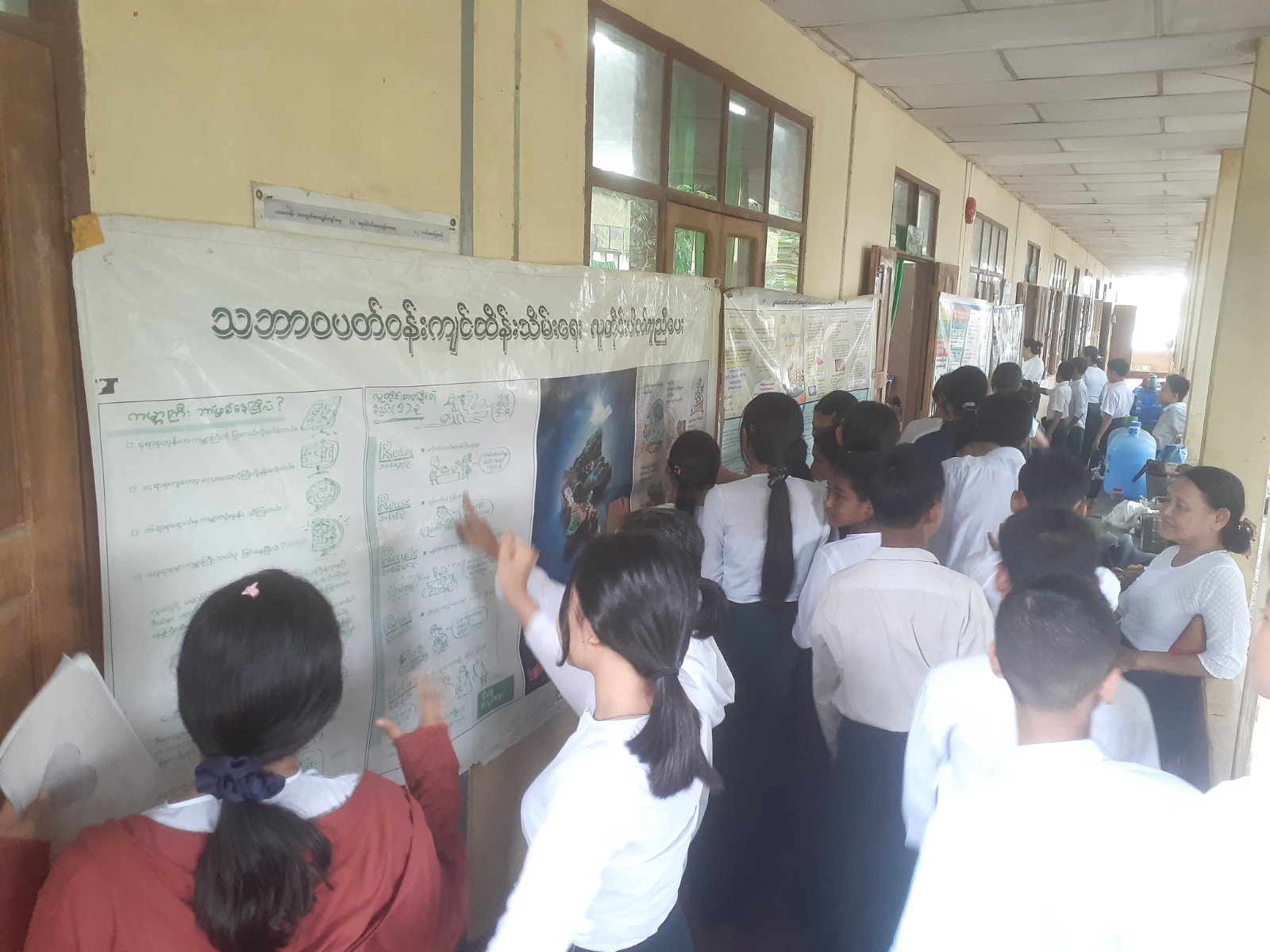ထို့နောက် ပြန်ကြားရေးနှင့်ပြည်သူ့ဆက်ဆံရေးဦးစီးဌာနက ပြသထားသော သဘာဝပတ်ဝန်းကျင်ထိန်းသိမ်းရေး လူတိုင်းပါဝင်ကူညီပေး၊ မူးယစ်ဆေးဝါးအကြောင်းသိကောင်းစရာများ၊ လူကုန်ကူးမှုတားဆီးကာကွယ်ရေး စသည့်အသိပညာပေးနံရံကပ်စာစောင်များကို ကျောင်းသား၊ ကျောင်းသူများ စိတ်ပါဝင်စားစွာ လေ့လာကြည့်ရှုခဲ့ကြကြောင်း သိရသည်။