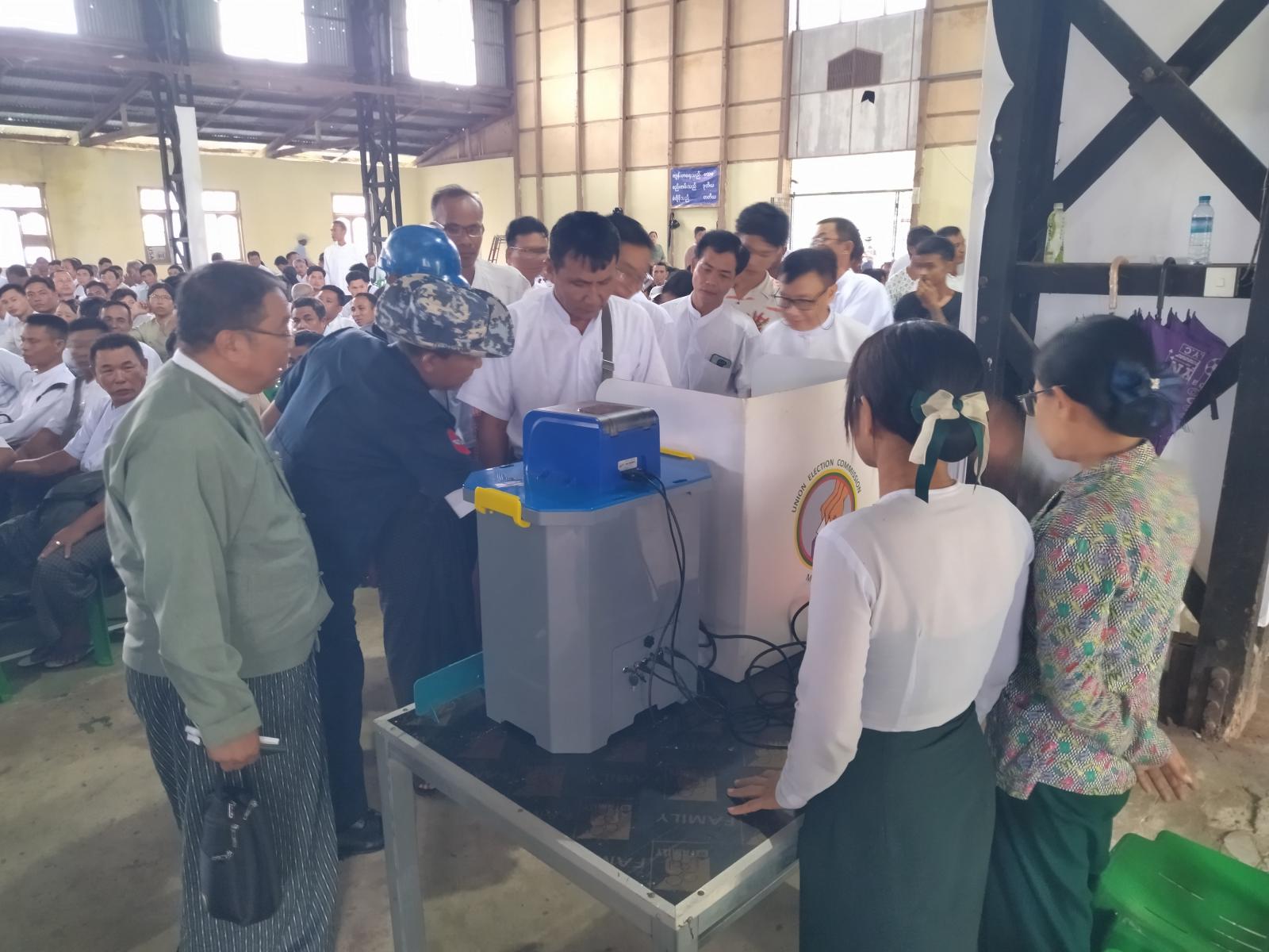 ပြည်ထောင်စုရွေးကောက်ပွဲကော်မရှင်အဖွဲ့ဝင် ဦးတင်ဆွေဝင်းနှင့်အဖွဲ့သည် ယနေ့နံနက်ပိုင်းက တာဝန်ရှိသူများနှင့်အတူ ကျိုက်လတ်မြို့နယ် အမှတ်(၄)ရပ်ကွက်၊ ရွှေဧရာအောင်ခန်းမ၌ မြို့နယ်အတွင်းရှိ ပြည်သူများ မြန်မာအီလက်ထရောနစ်မဲပေးစက် (MEVM) ဆိုင်ရာ အသိပညာပေးခြင်းနှင့် လက်တွေ့စမ်းသပ်မဲပေးနေမှုအား ကြည့်ရှုအားပေးခဲ့သည်။