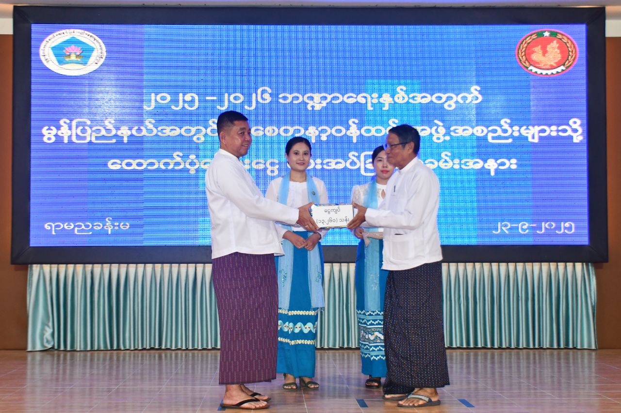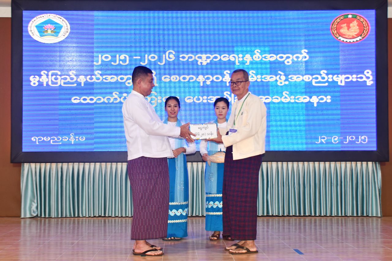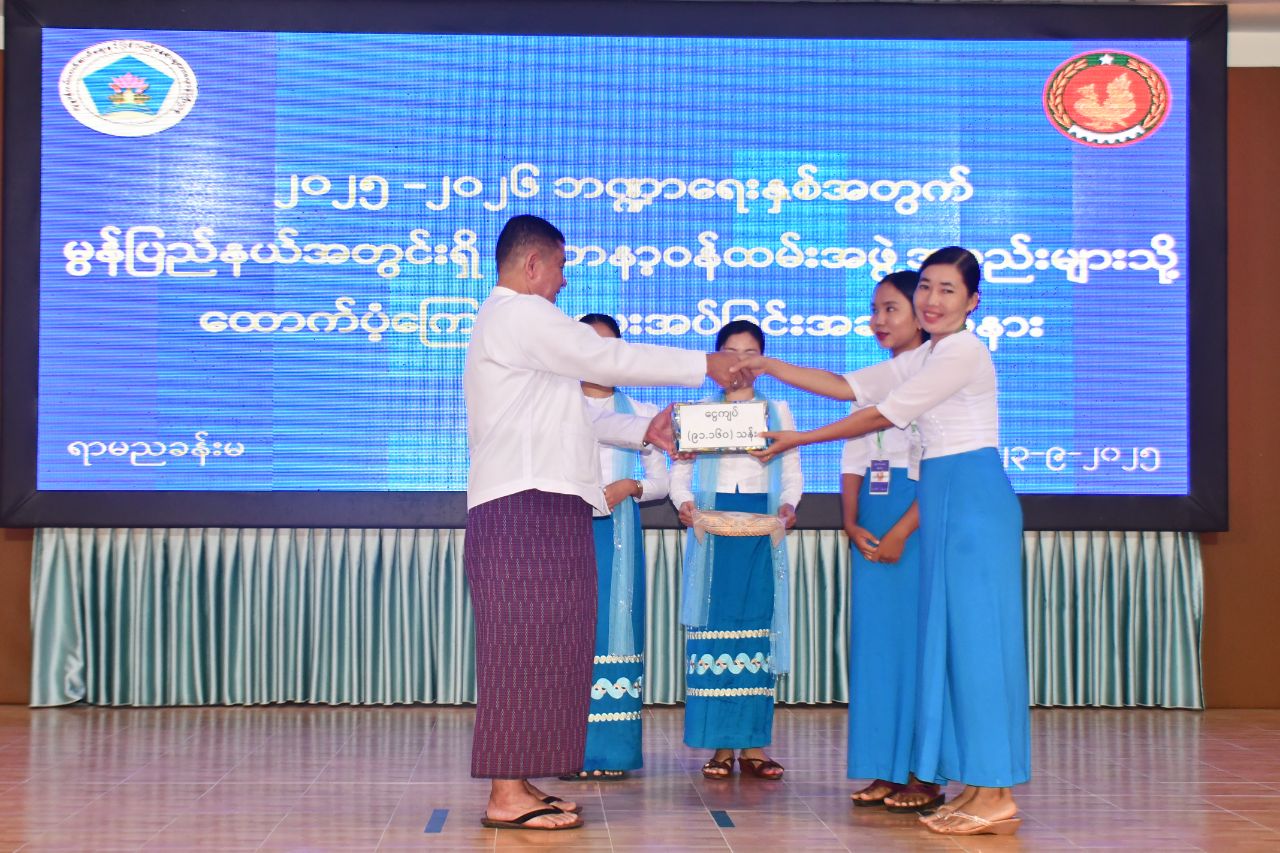 ထို့နောက် ပြည်နယ်ဝန်ကြီးချုပ်က လူငယ်ဖွံ့ဖြိုးရေးပရဟိတဂေဟာ(၃)ခု၊ အမျိုးသမီးဂေဟာ(၁)ခုတို့အတွက် ငွေကျပ်(၆၆ဒဿမ၂၈)သန်း၊ ဘိုးဘွားရိပ်သာ(၄)ခု တို့အတွက် ငွေကျပ် (၁၃ဒဿမ၂၆၀)သန်း၊ ကိုယ့်အားကိုယ်ကိုး မူကြိုကျောင်း(၈၆)ကျောင်းအတွက် ငွေကျပ် (၉၁ဒဿမ၁၆၀) သန်းနှင့် လူငယ်ရိပ်သာ(၁)ခုအတွက် ငွေကျပ်(၁)သိန်းတို့အား ထောက်ပံ့ပေးအပ်ခဲ့ရာ စေတနာ့ဝန်ထမ်း အဖွဲ့အစည်းကိုယ်စားလှယ်များက လက်ခံရယူခဲ့သည်။